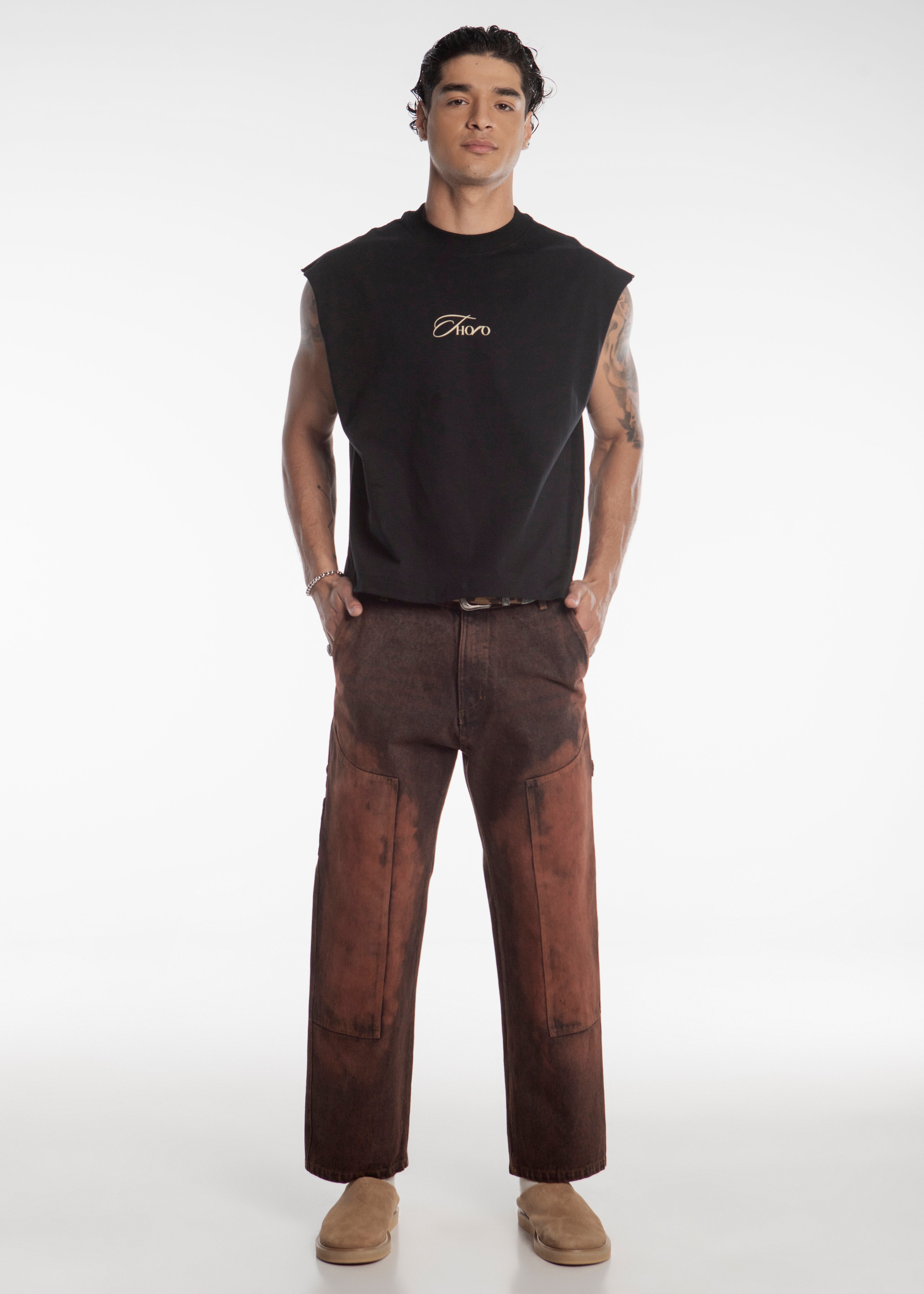 Playera 100% algodón en color negro con corte boxy sin mangas con diseño de Thoro en el frente y en la espalda con un imagen de un oasis fundida en las letras y logo de Oasis abajo. Impresión en serigrafía.