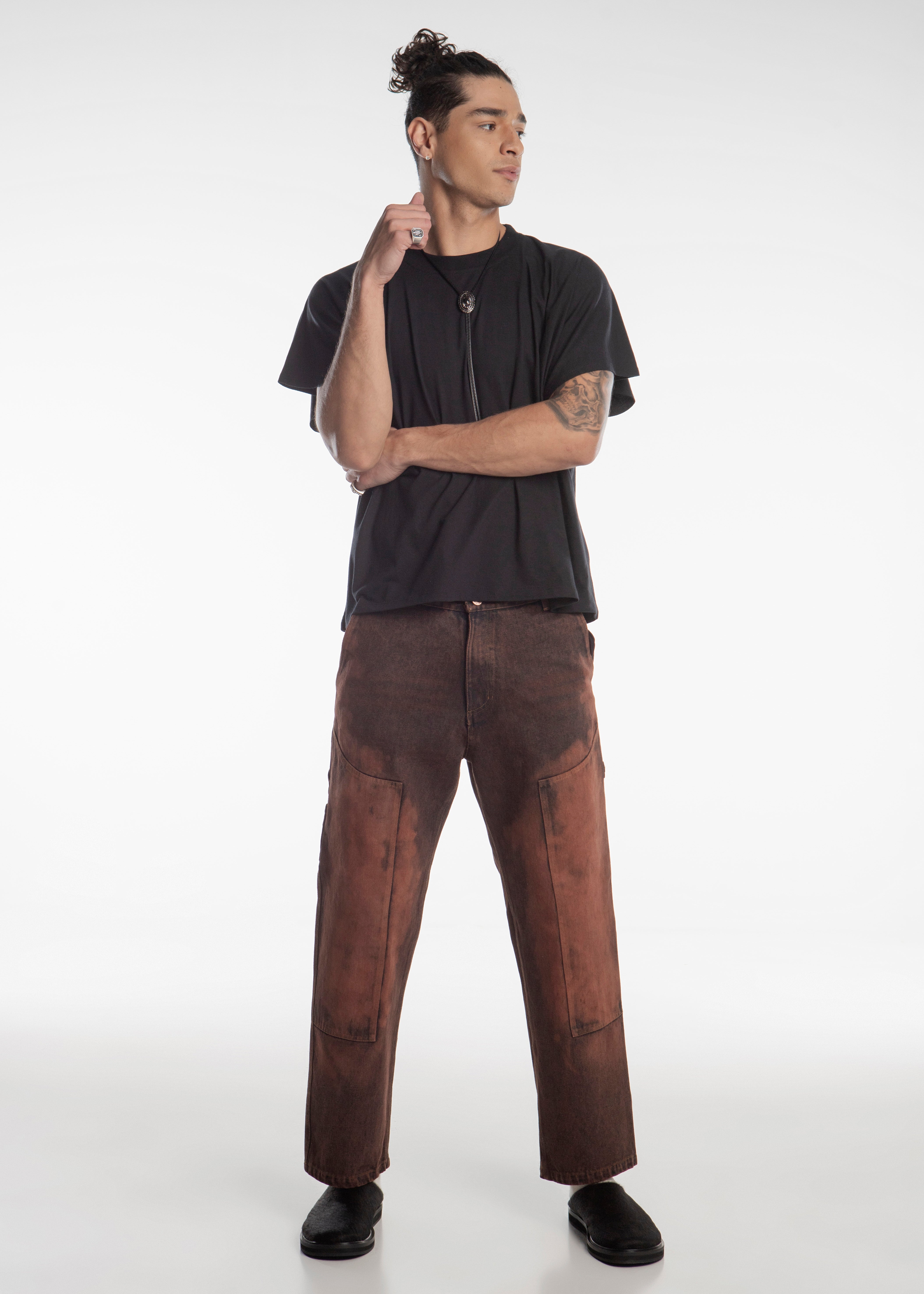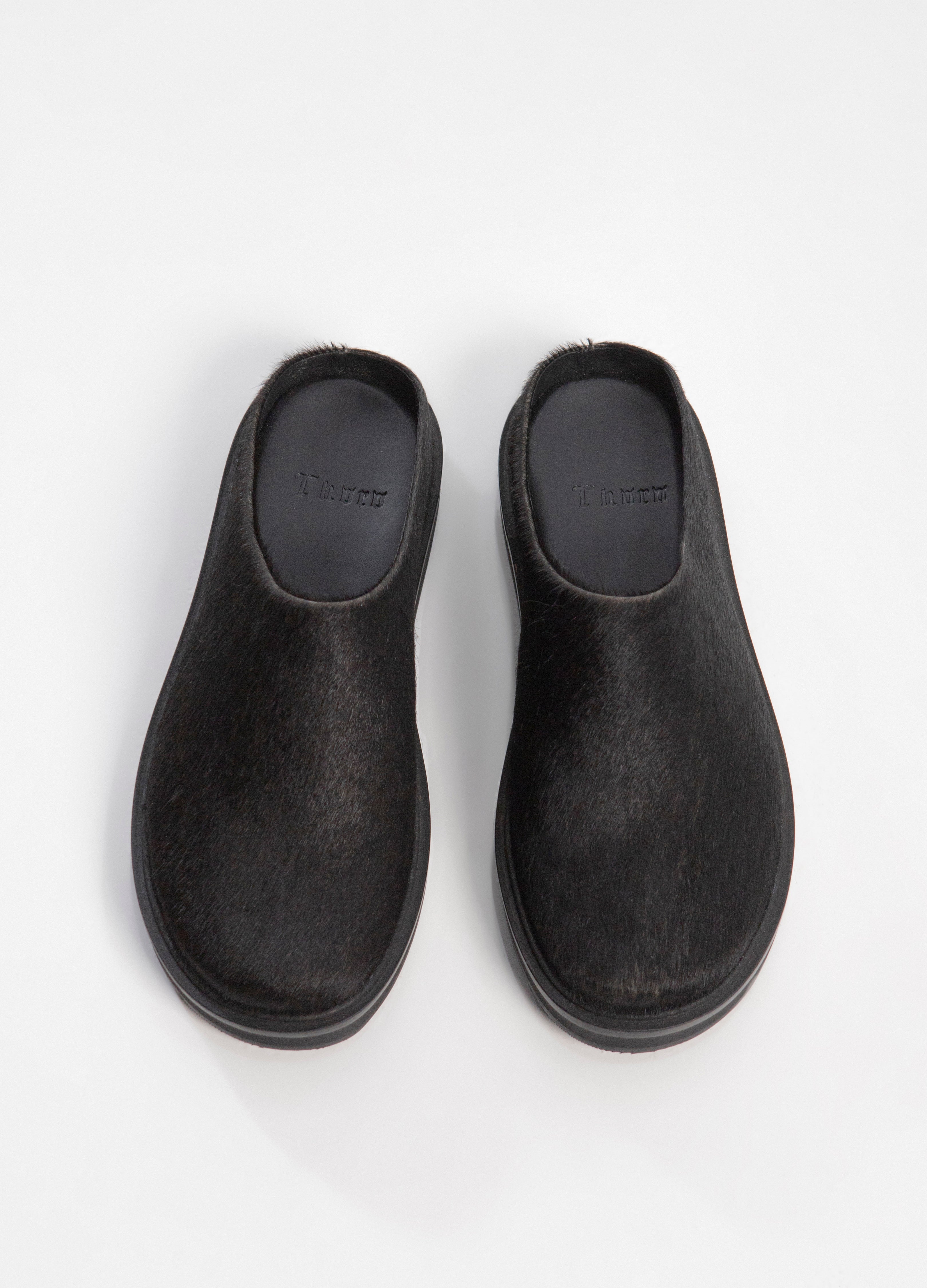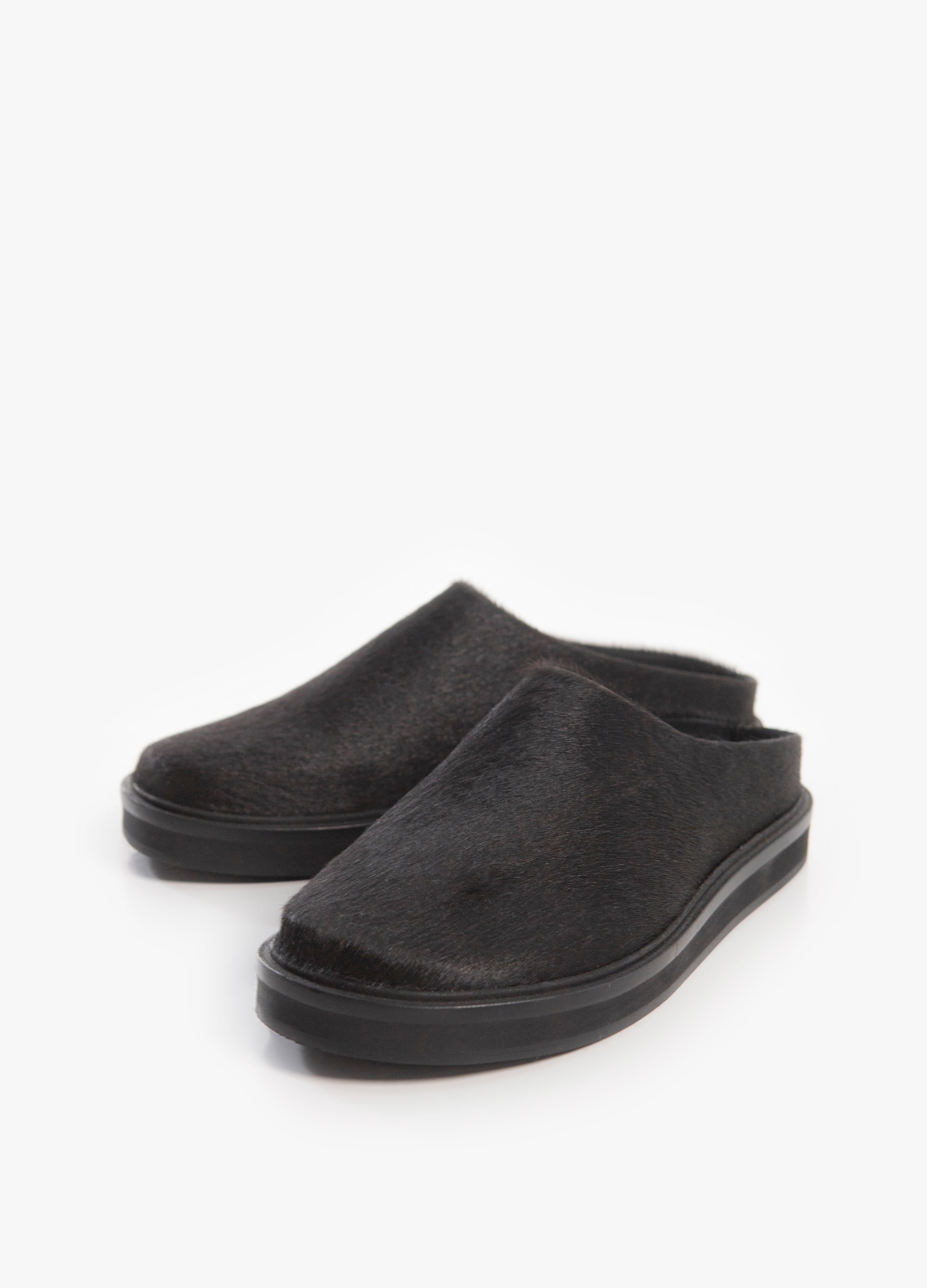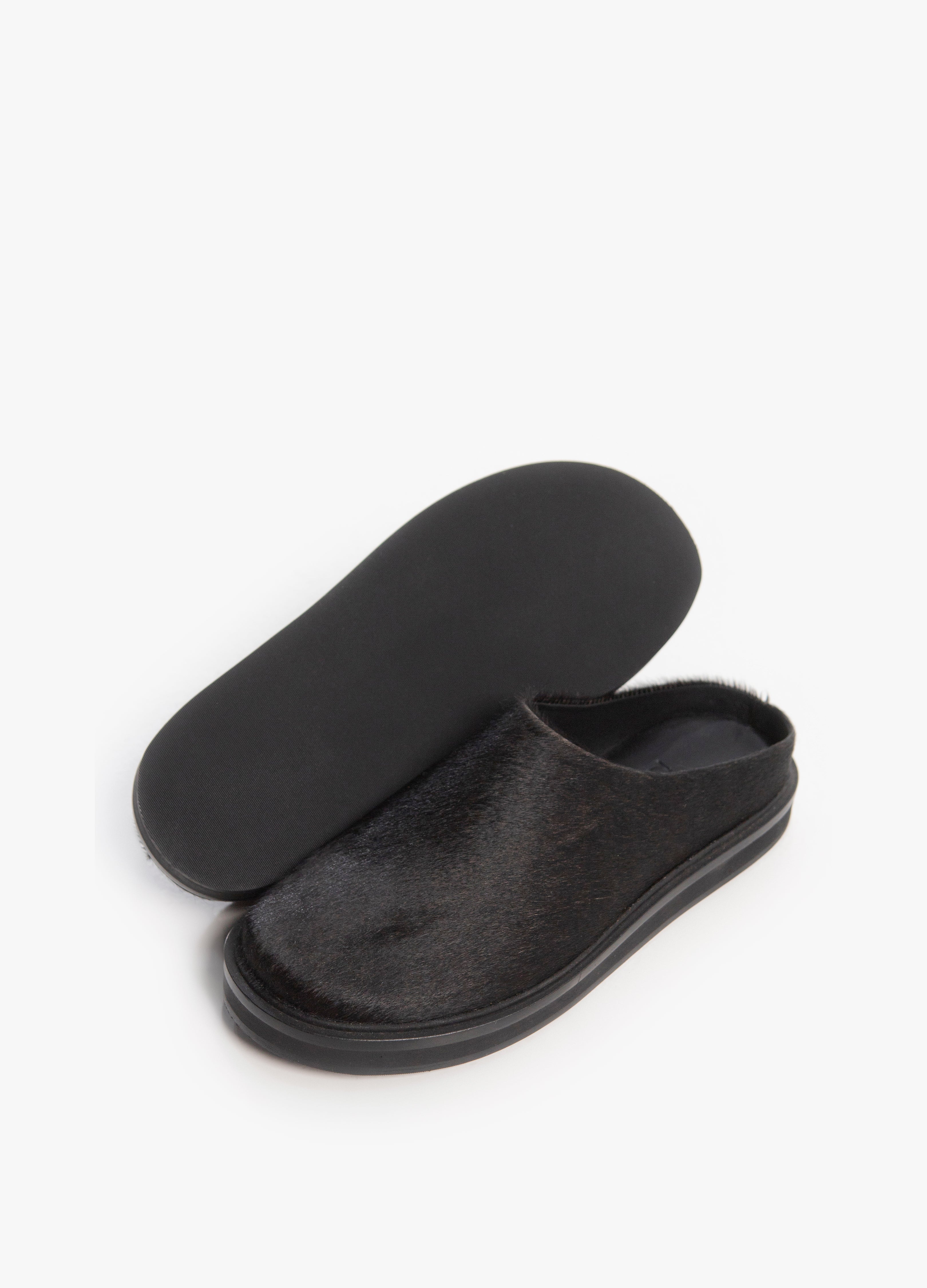 Suecos Flat minimalistas fabricados en piel con pelaje natural color negro.