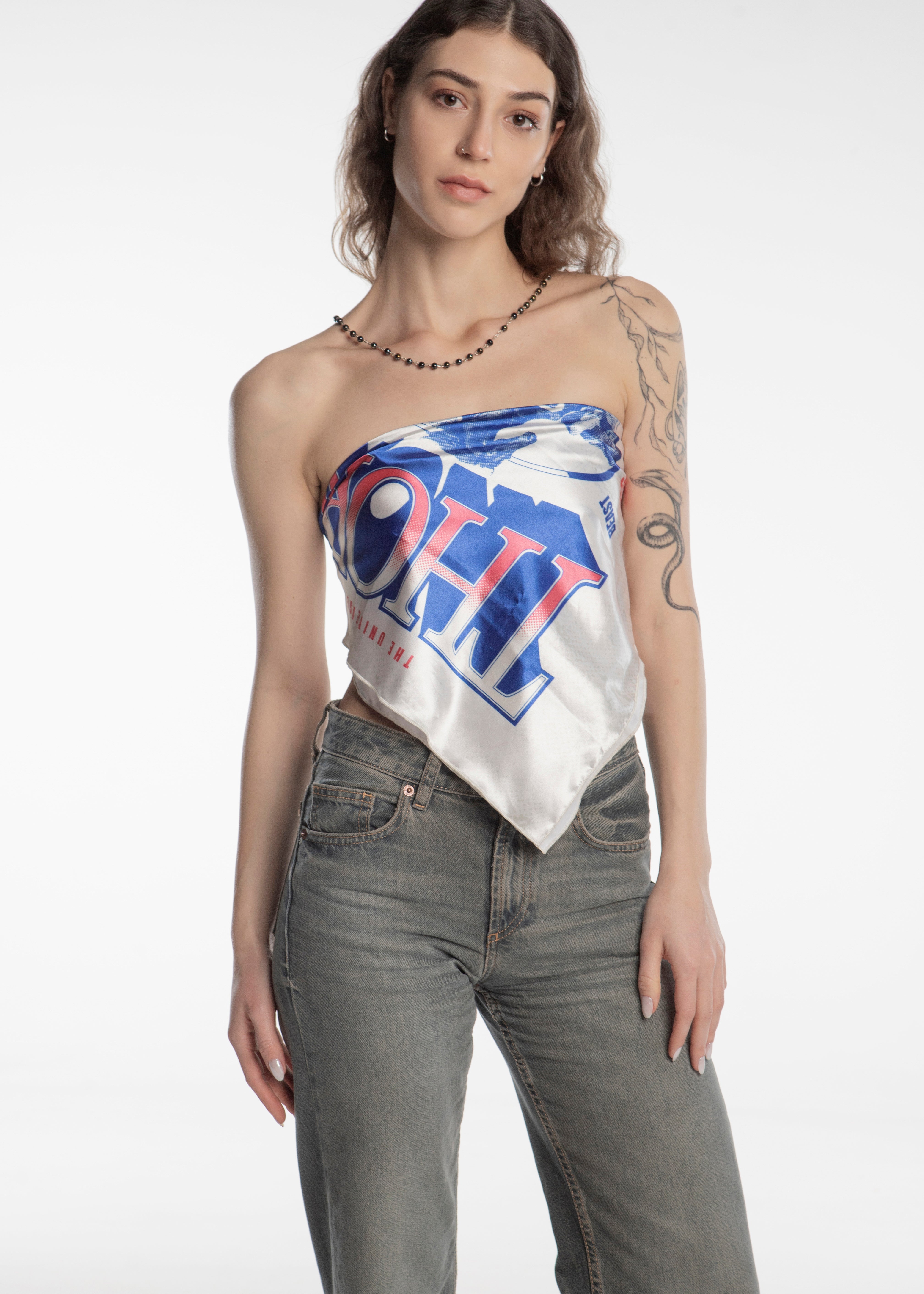 Paliacate en color mantequilla claro con diseño de caballo con la leyenda "Thoro, Oasis City" En color azul con degardas naranjas. Impreso en sublimación.