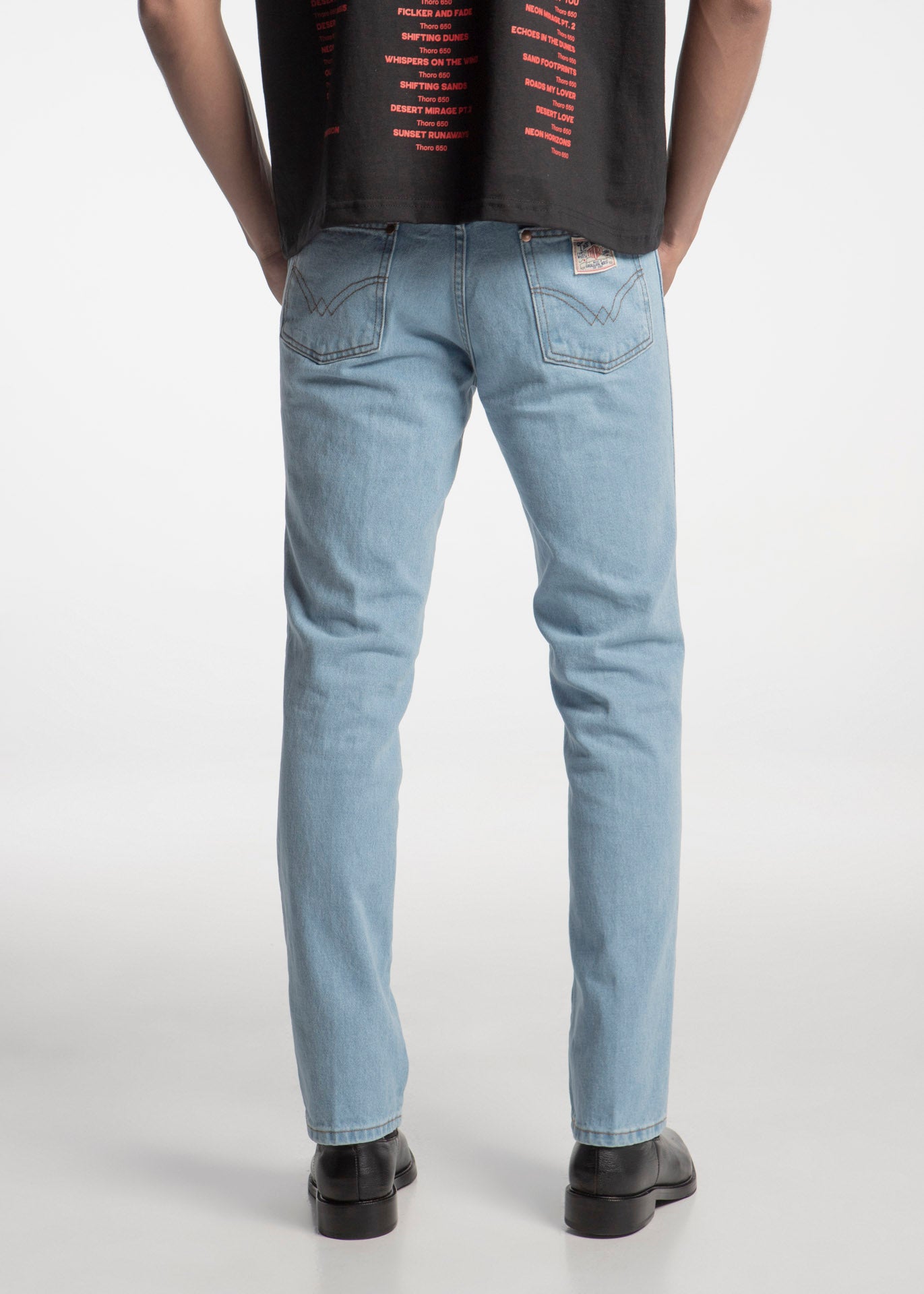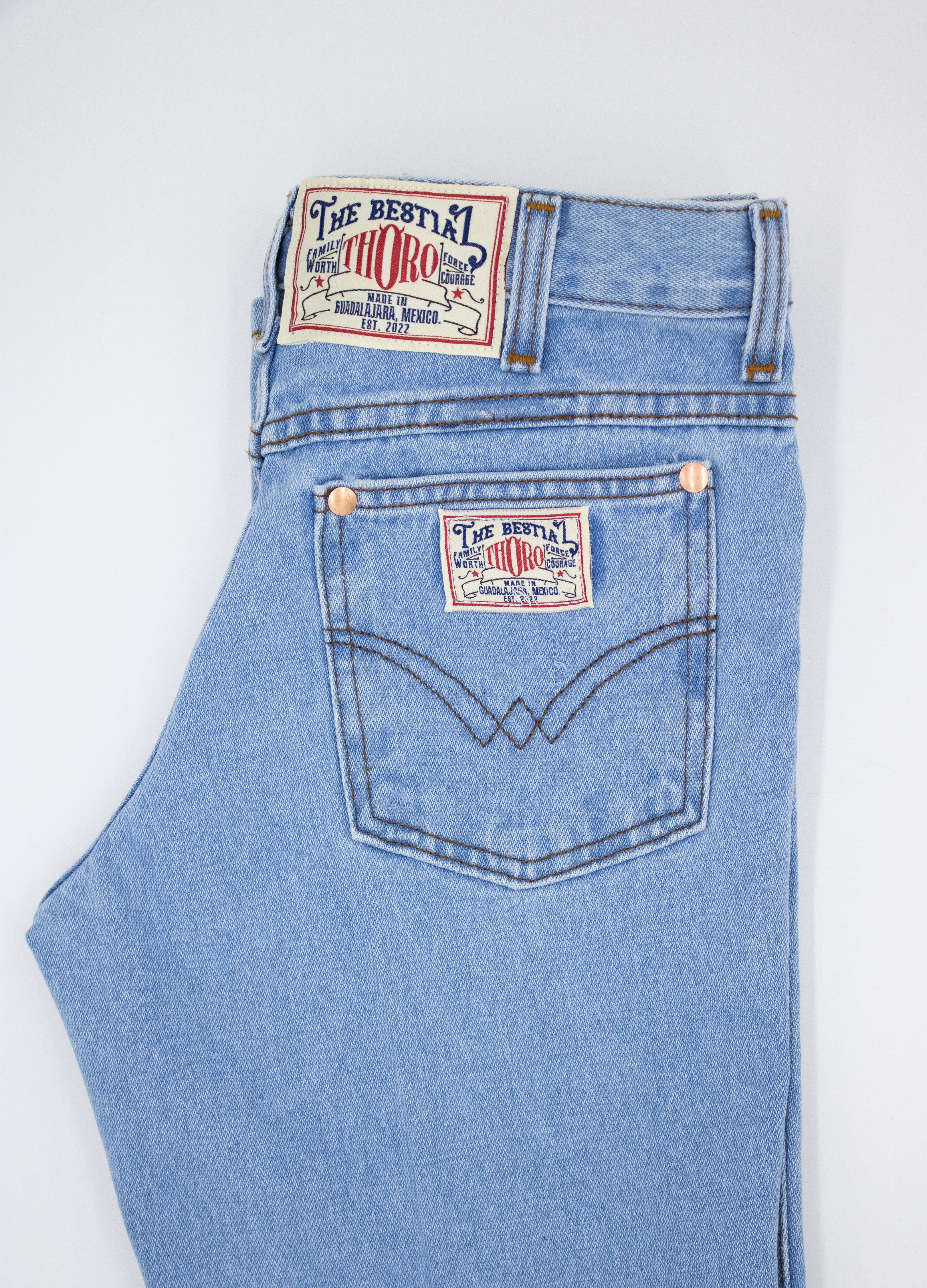 Pantalón confeccionado en Mezclilla color azul claro en corte Boot Cut, perfecto para botas de caña alta o botines.