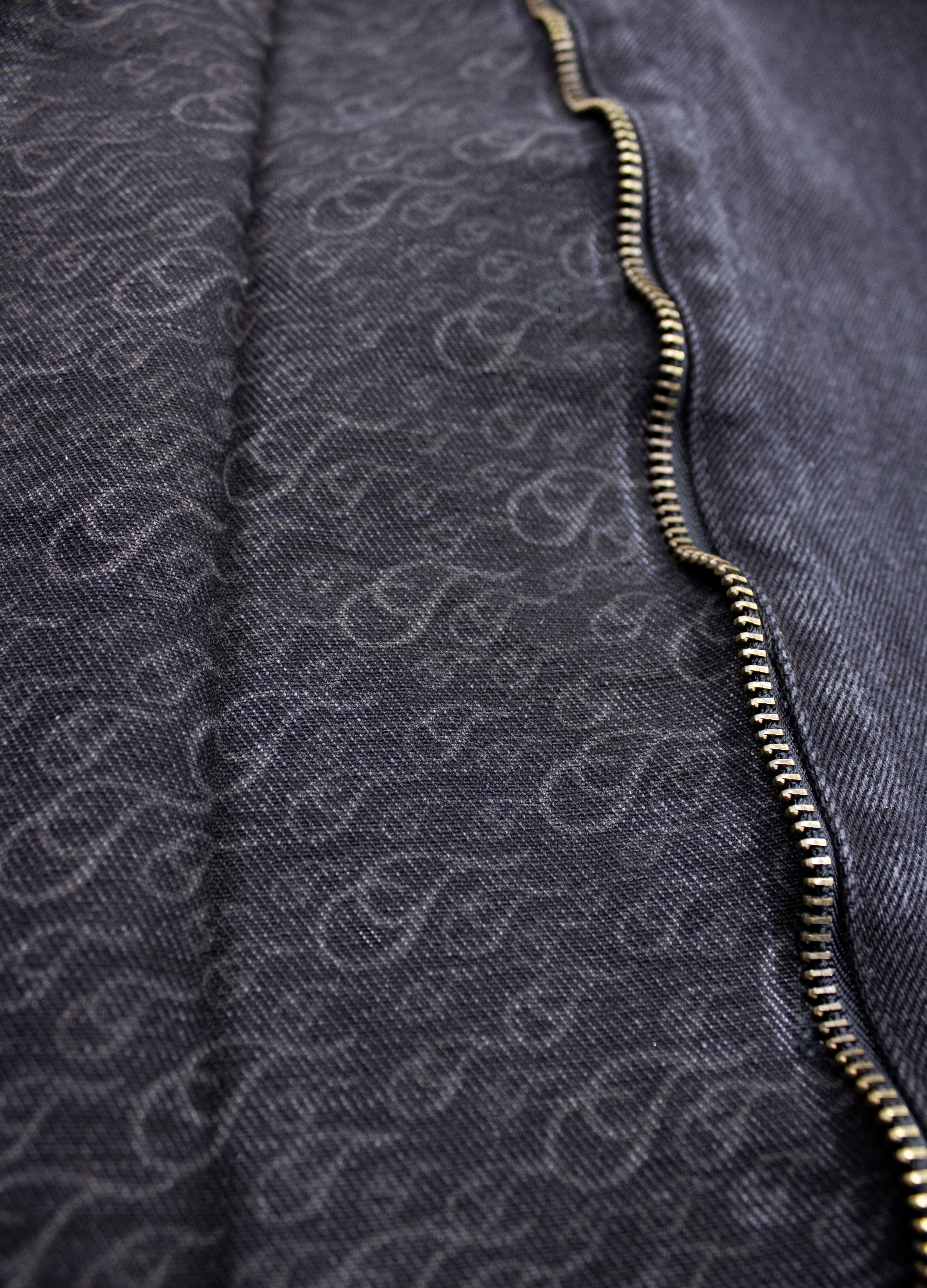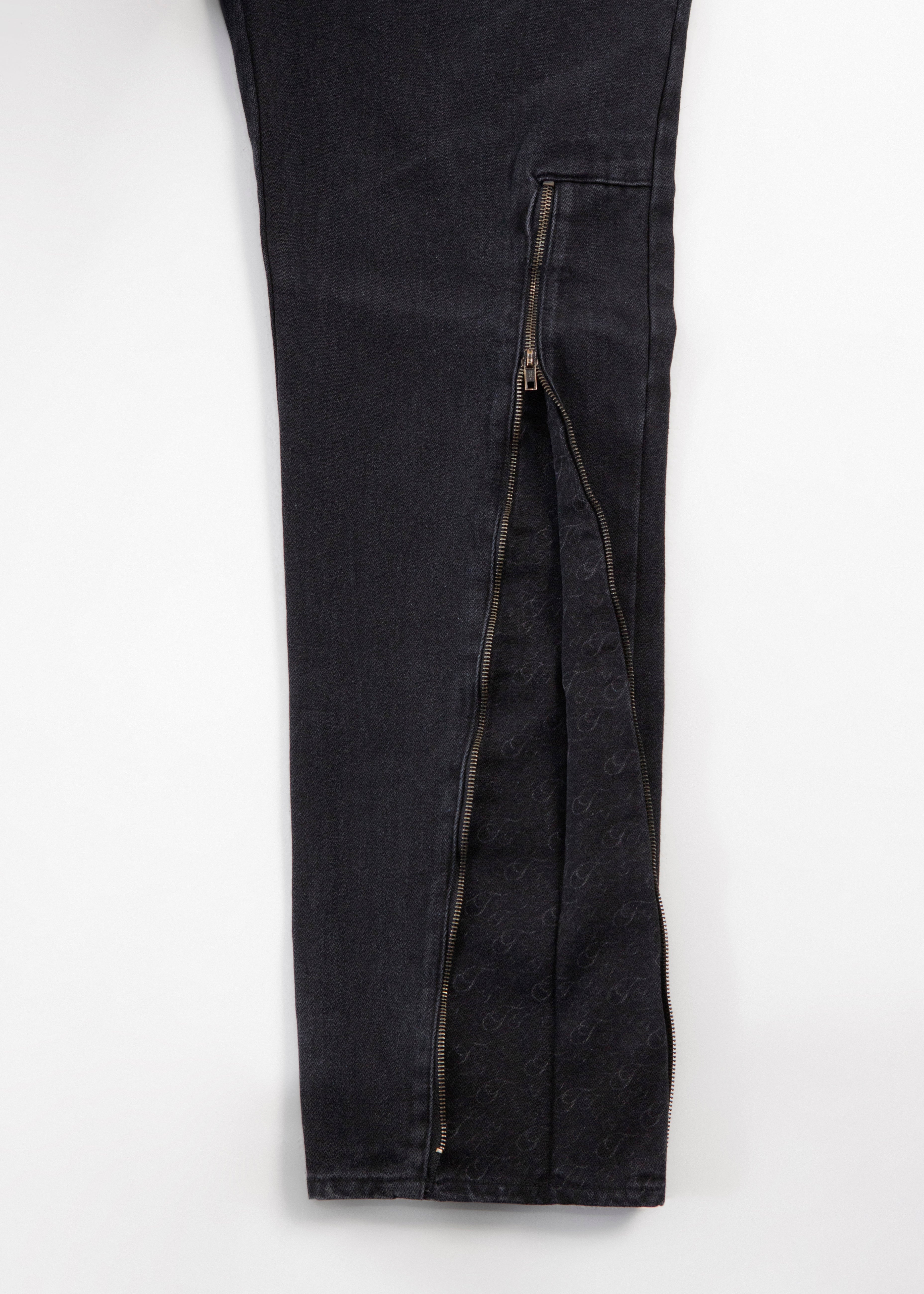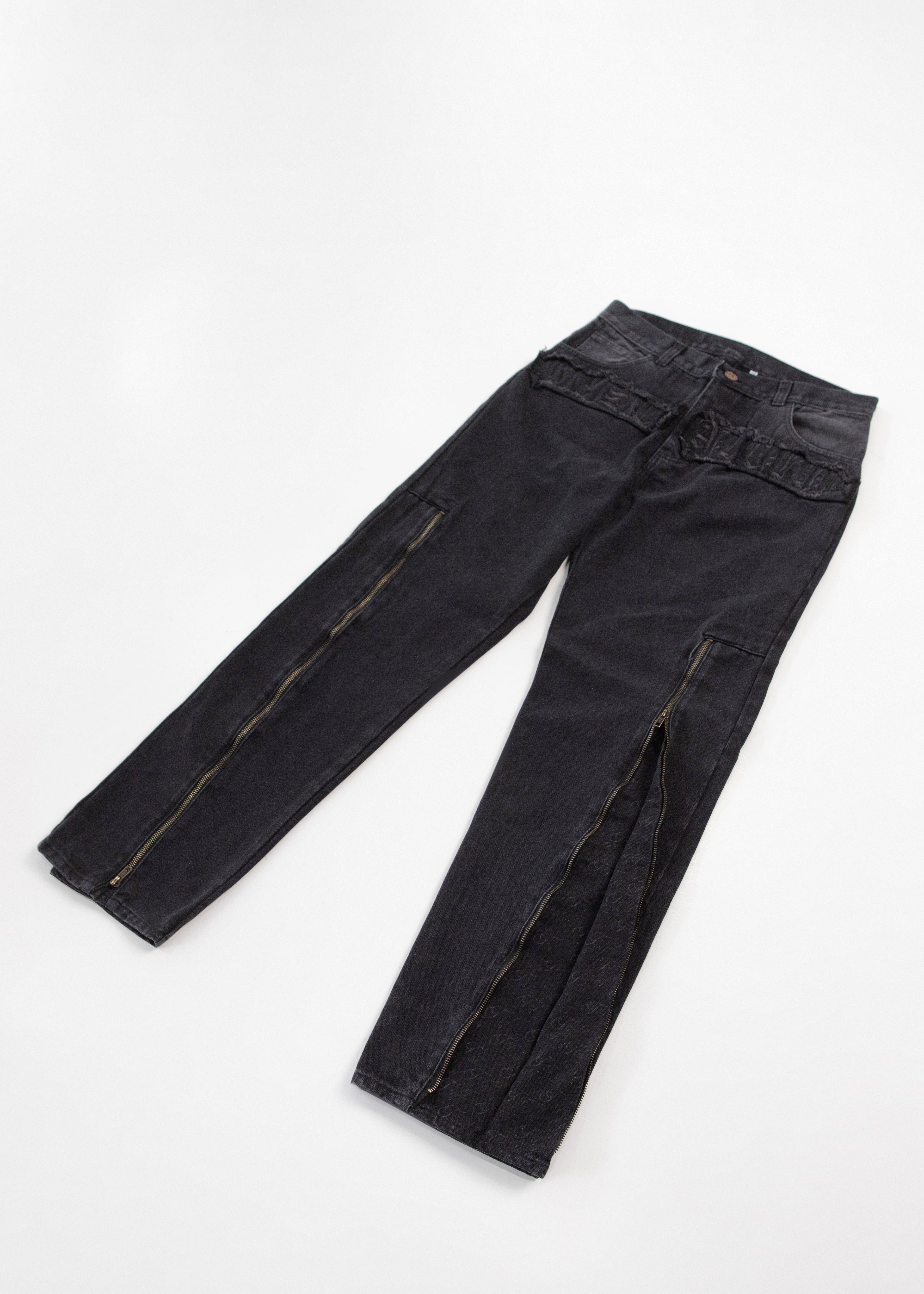 Pants made of 100% black denim with zippers at the bottom to make them straighter pants when closed or more flared when opened, they have a laser-engraved T-letter pattern and front design is embroidered on a worn cut, captions "Bestial Club" in Gothic letters.