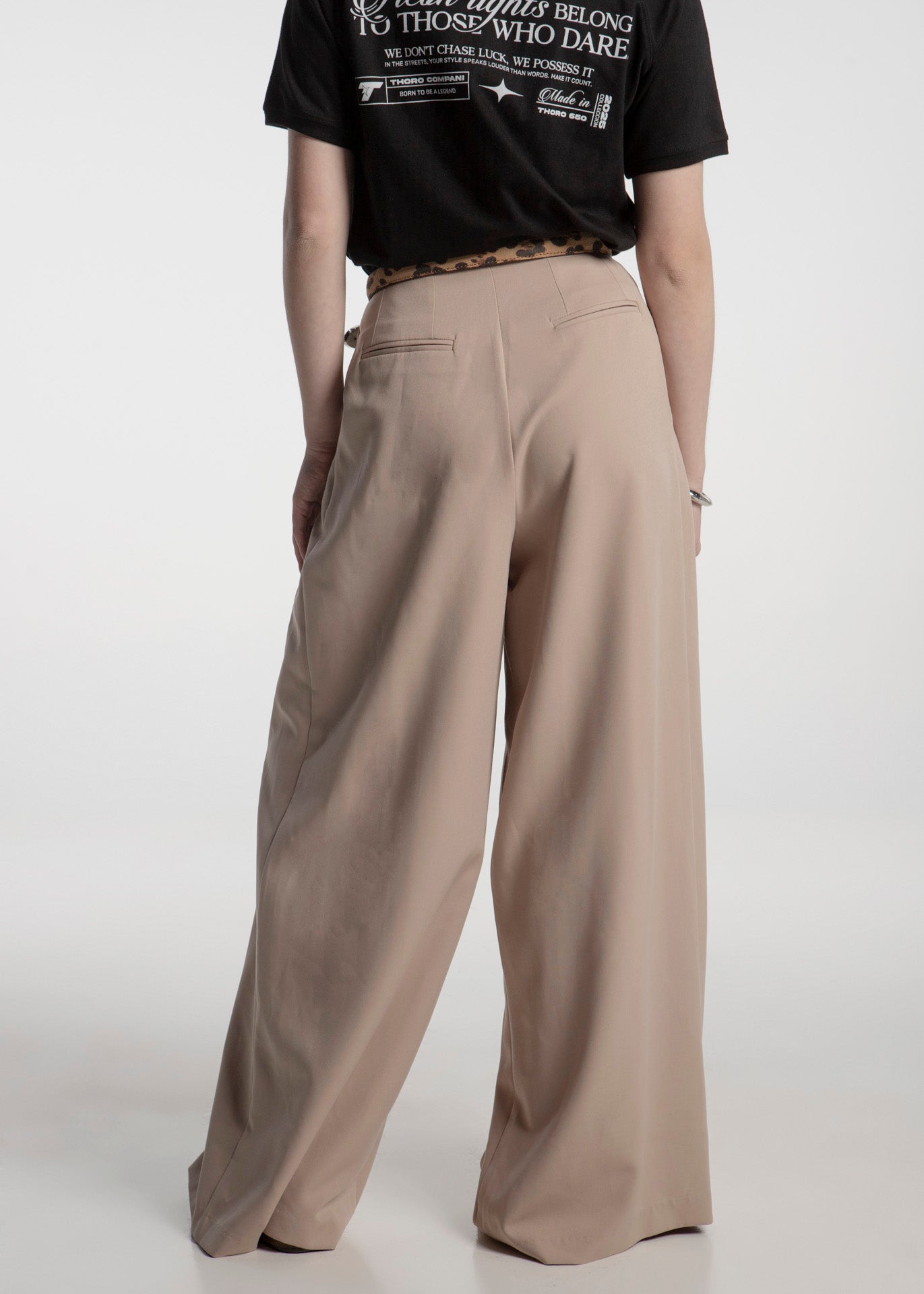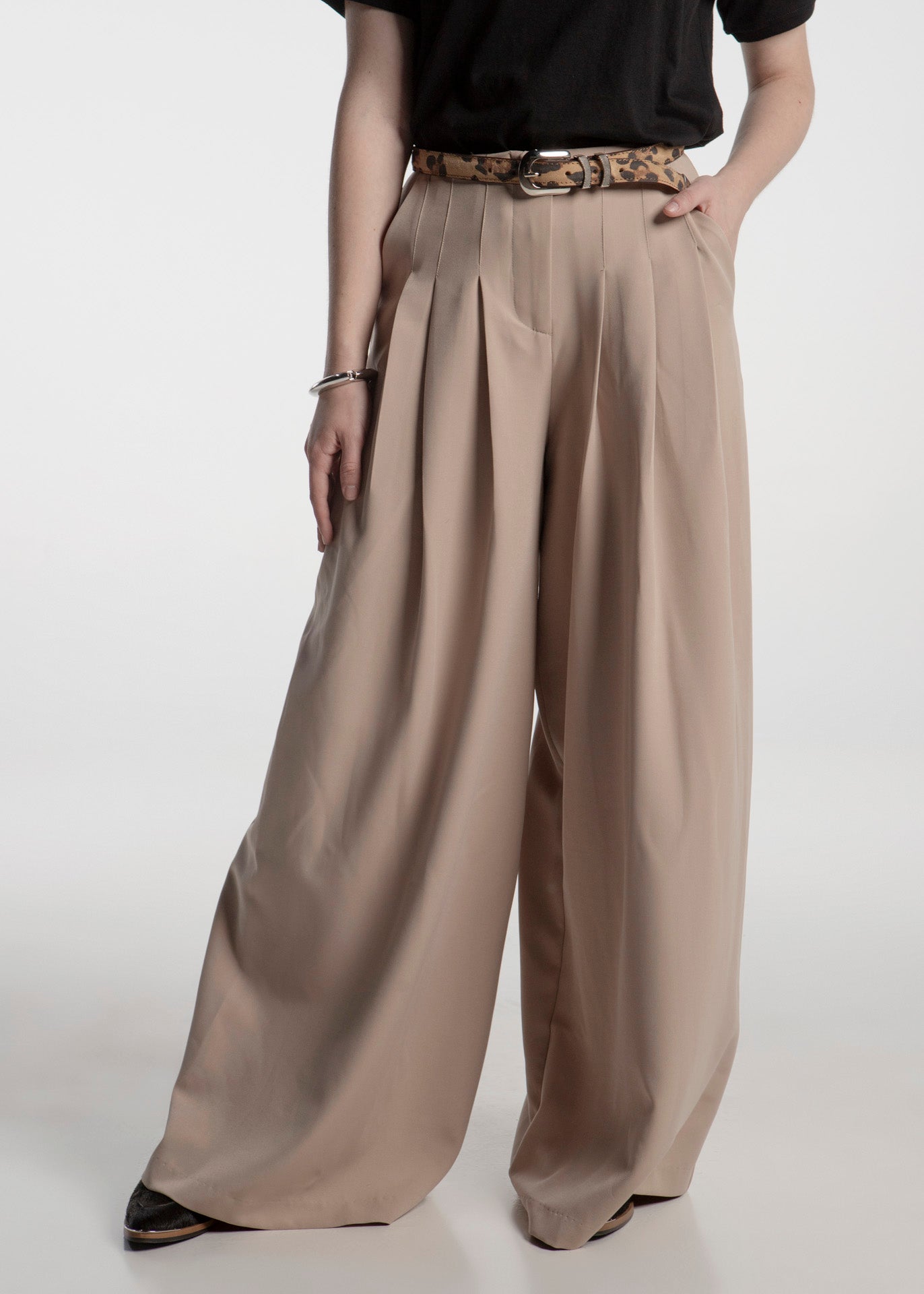 Pantalón de vestir en corte wide leg fabricado en tela negra con pinzas que dan un toque suelto y elegante.