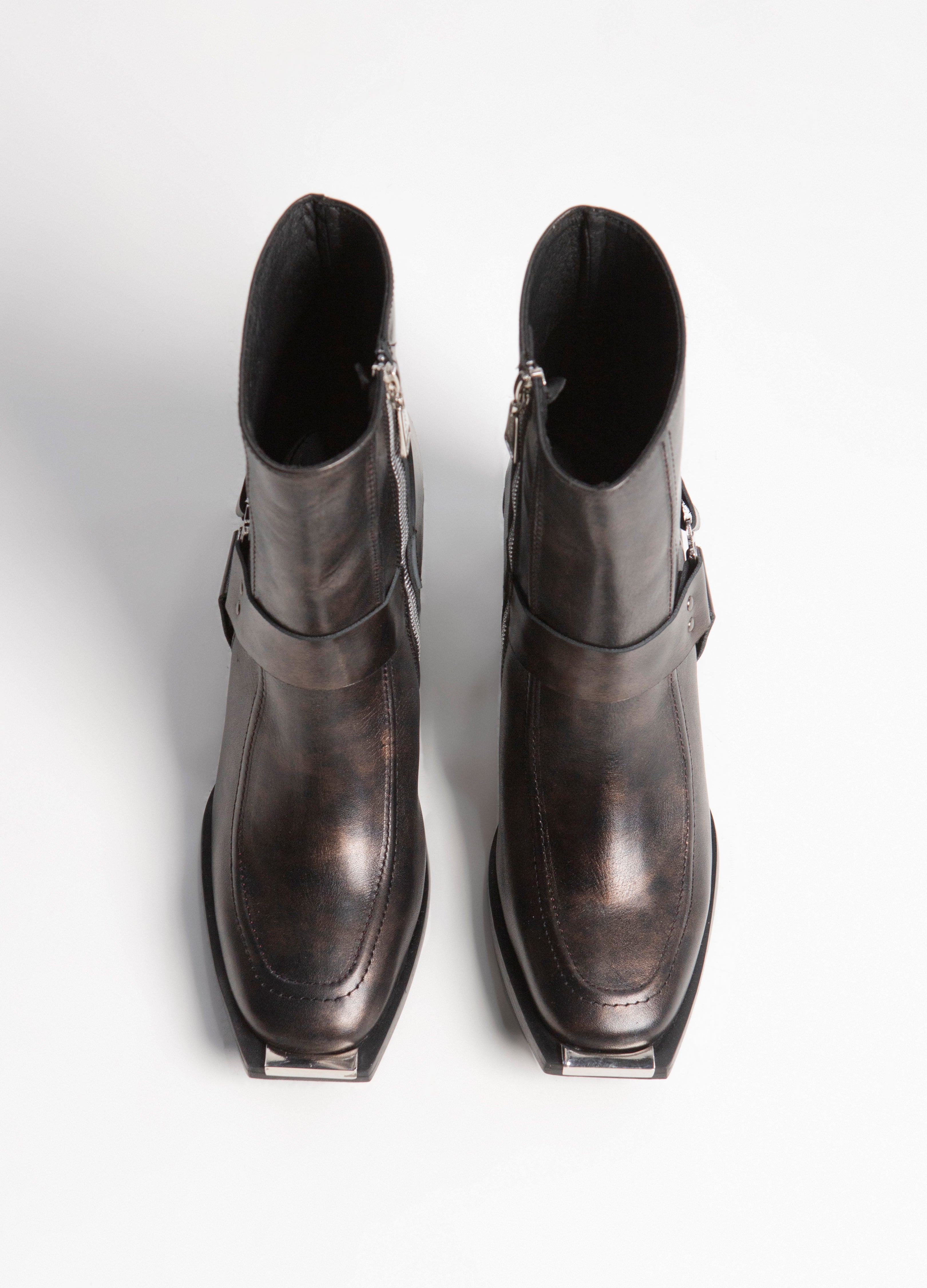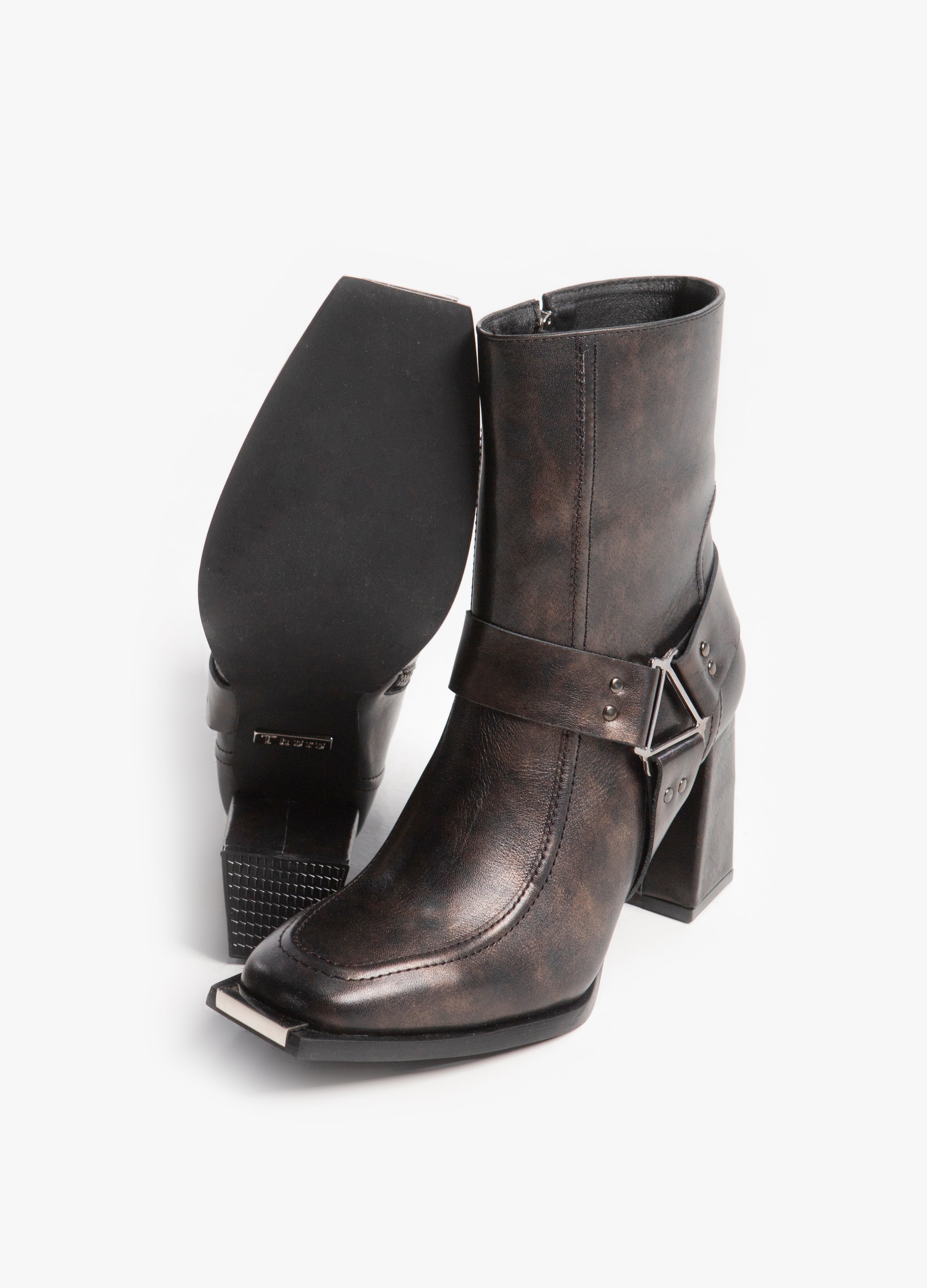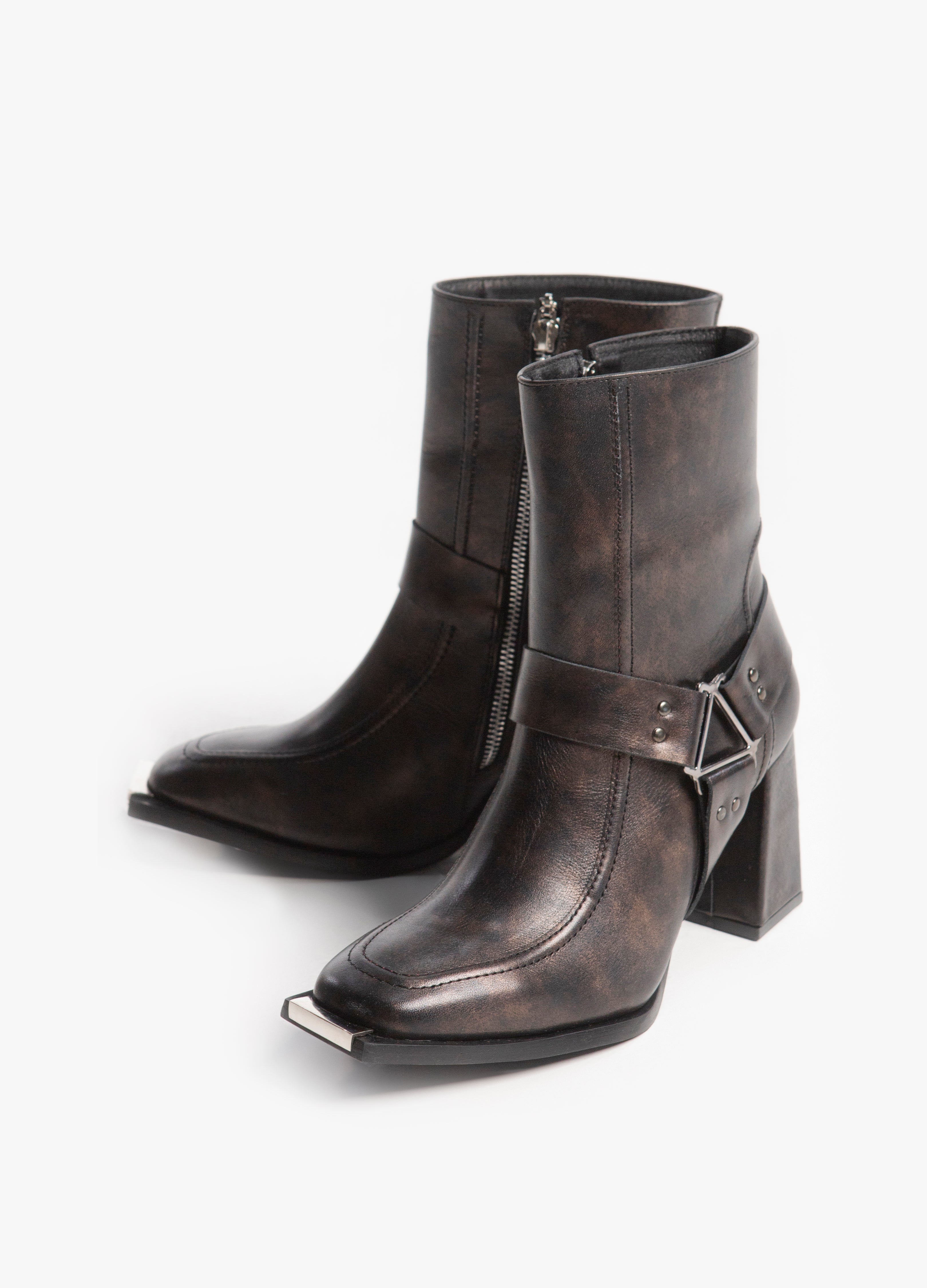 Botín de punta cuadrada tacón alto y arnés triangular lateral fabricada en piel de res color bronce