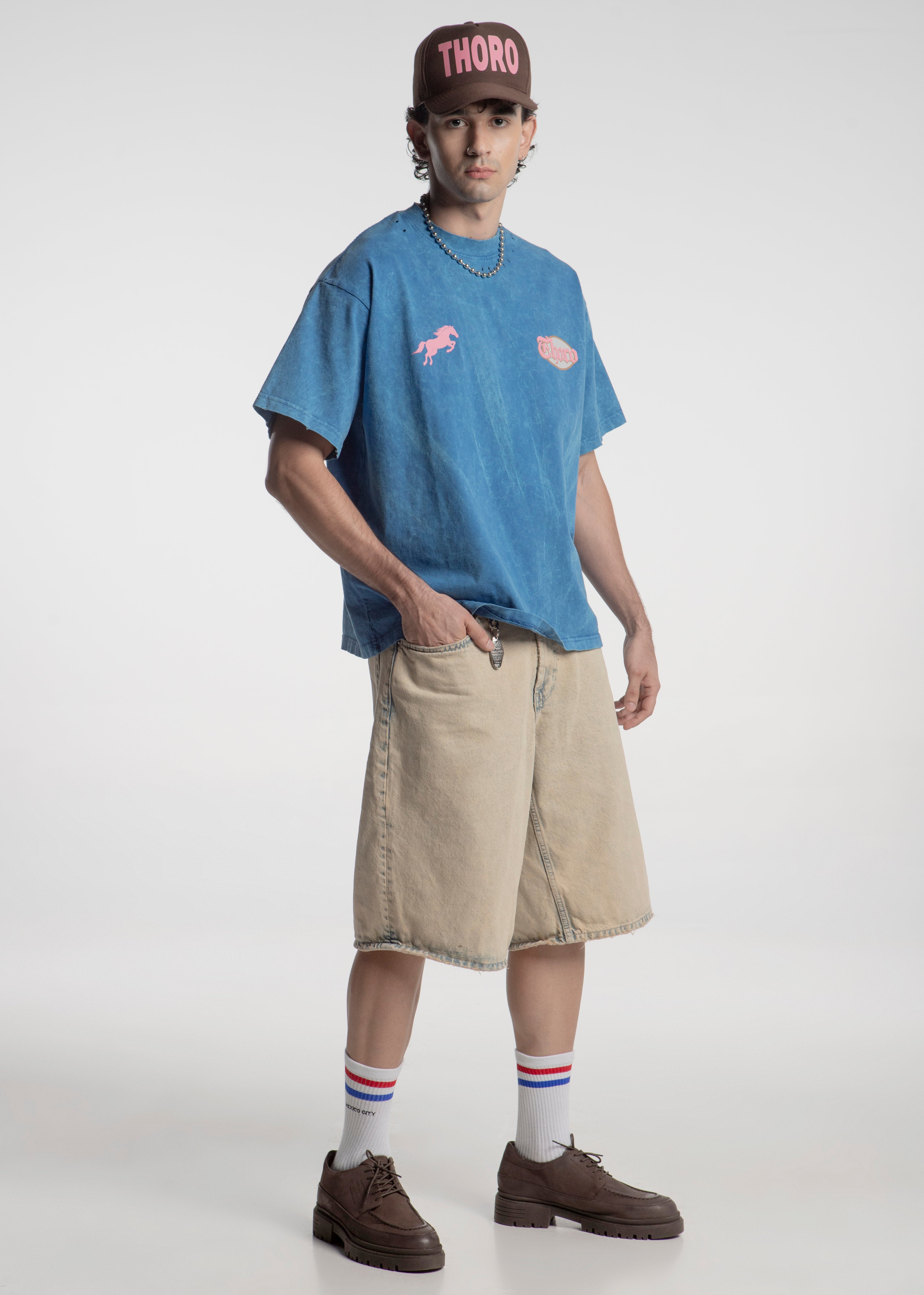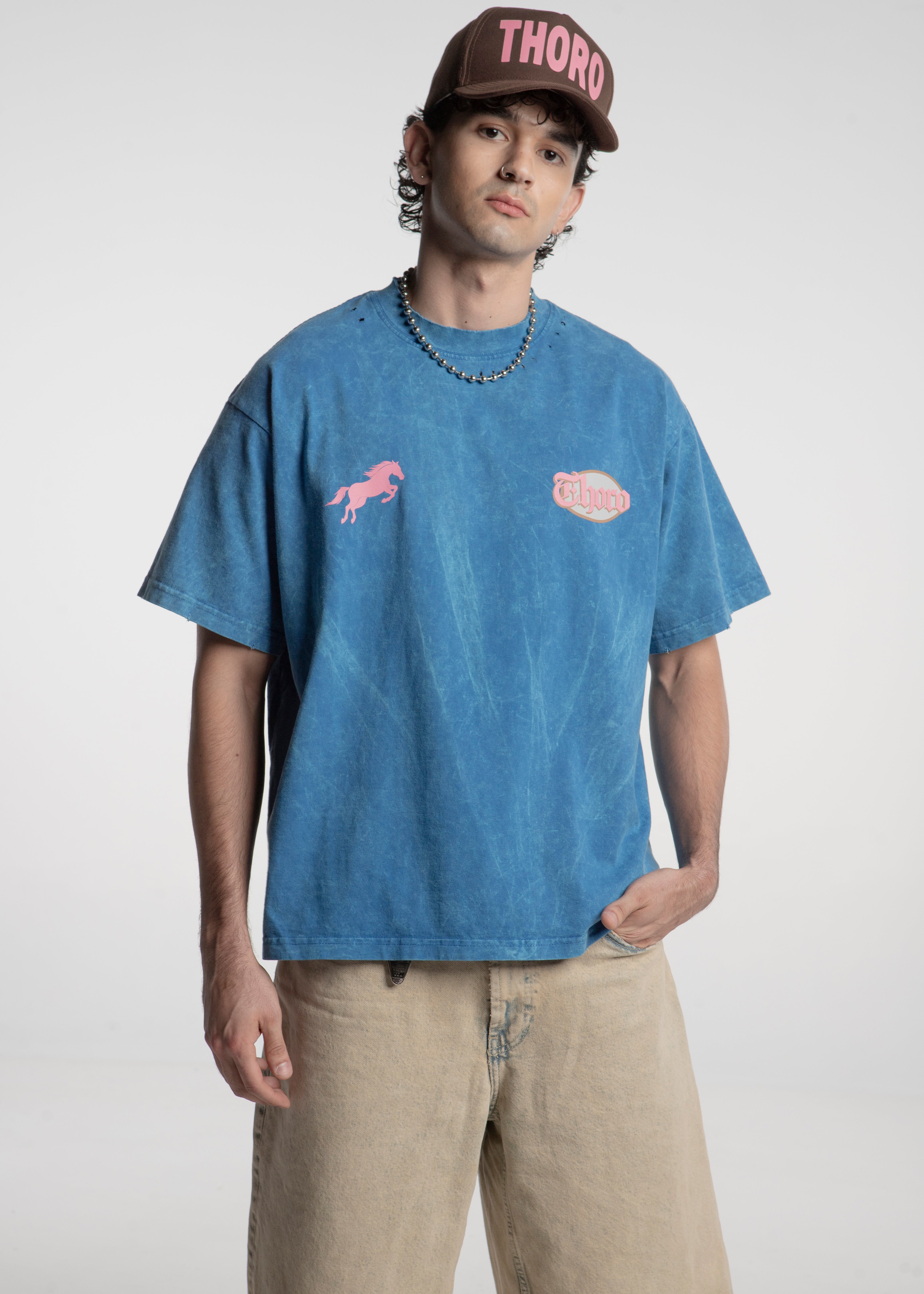 Playera azul acabado acid washed de corte boxy fabricada en 100% algodón con el diseño de Thoro en un lado caballo del otro y en la espalda un letrero en la espalda con la marca Thoro impresa en serigrafía color rosa.