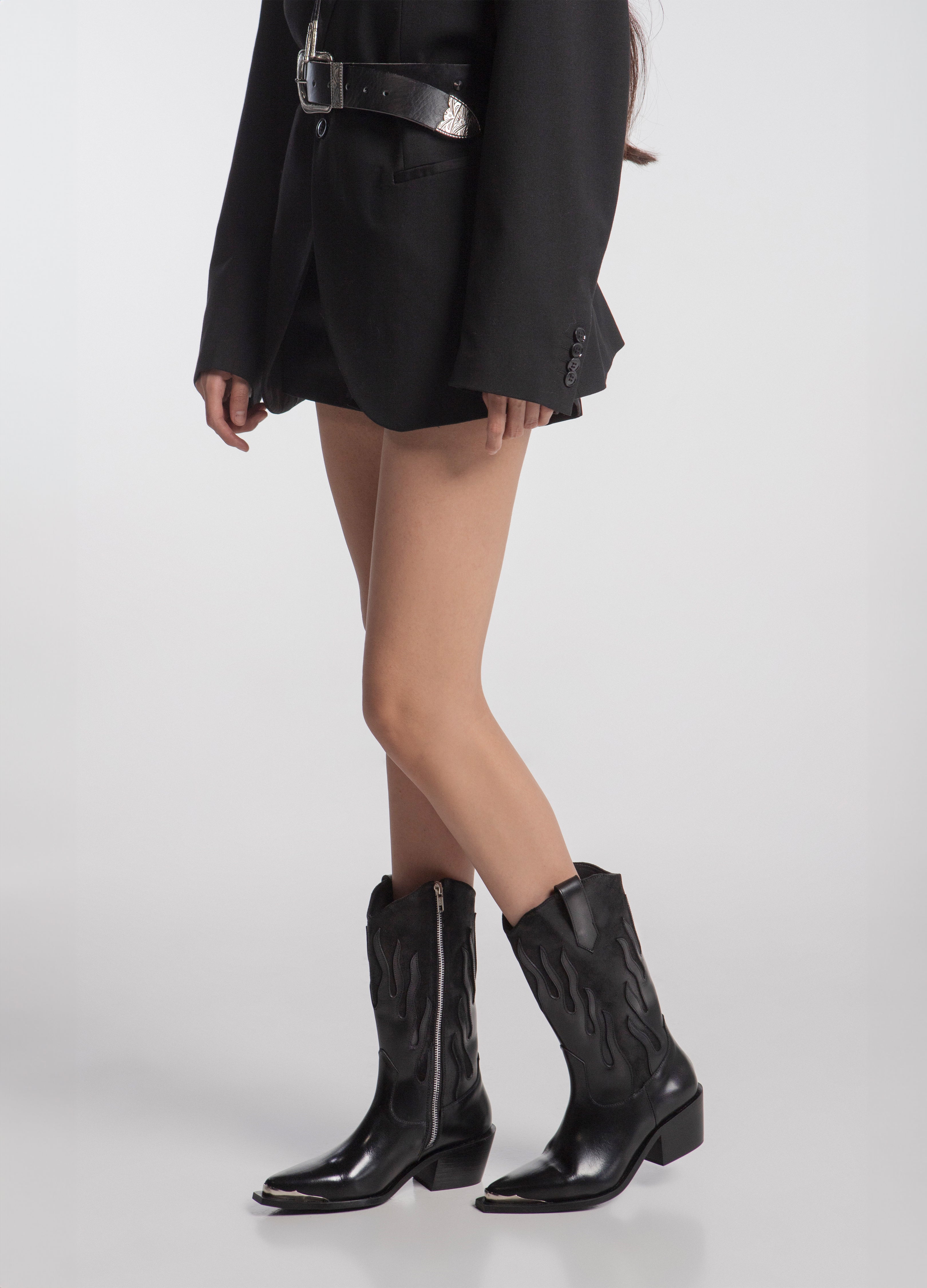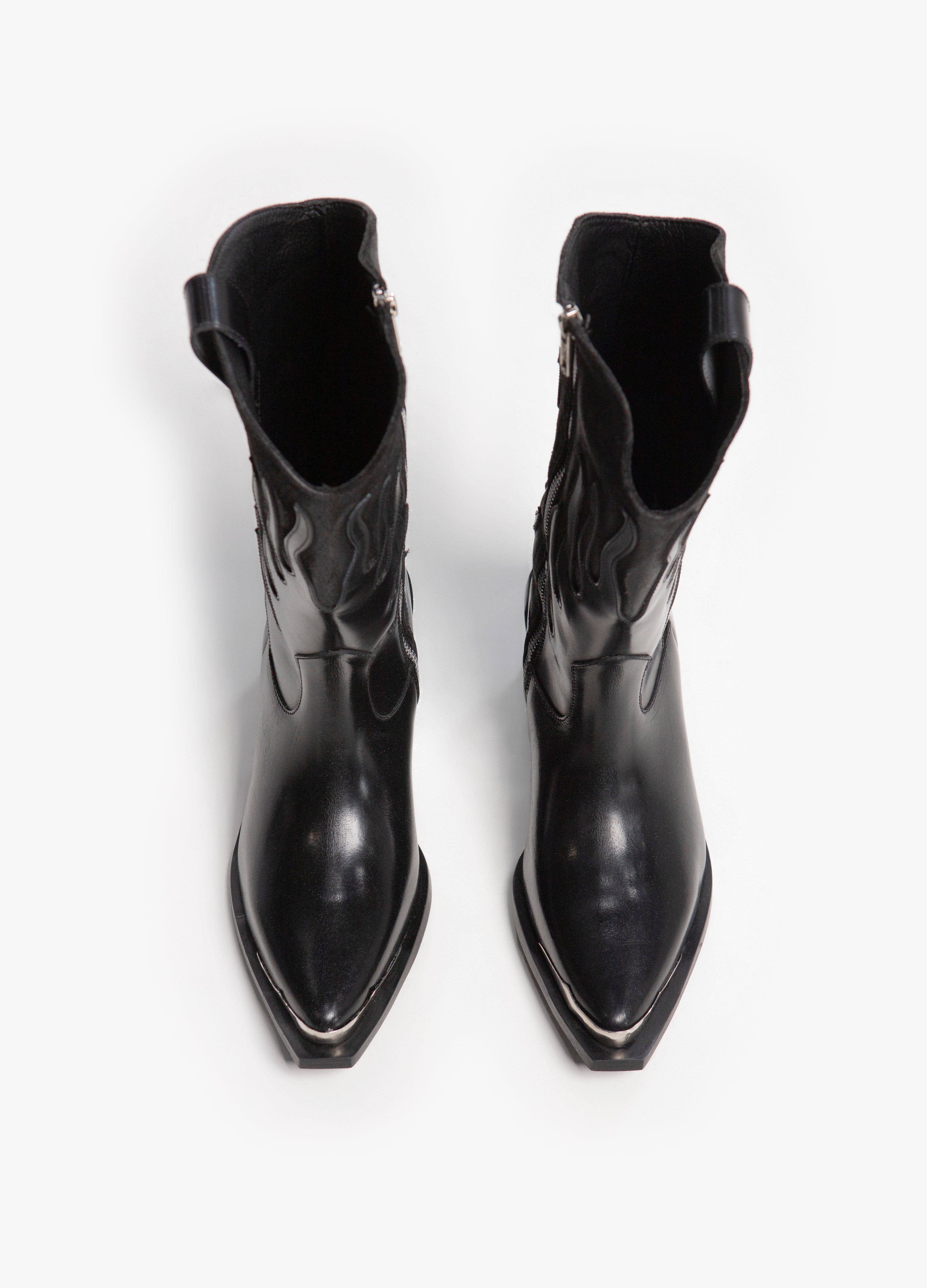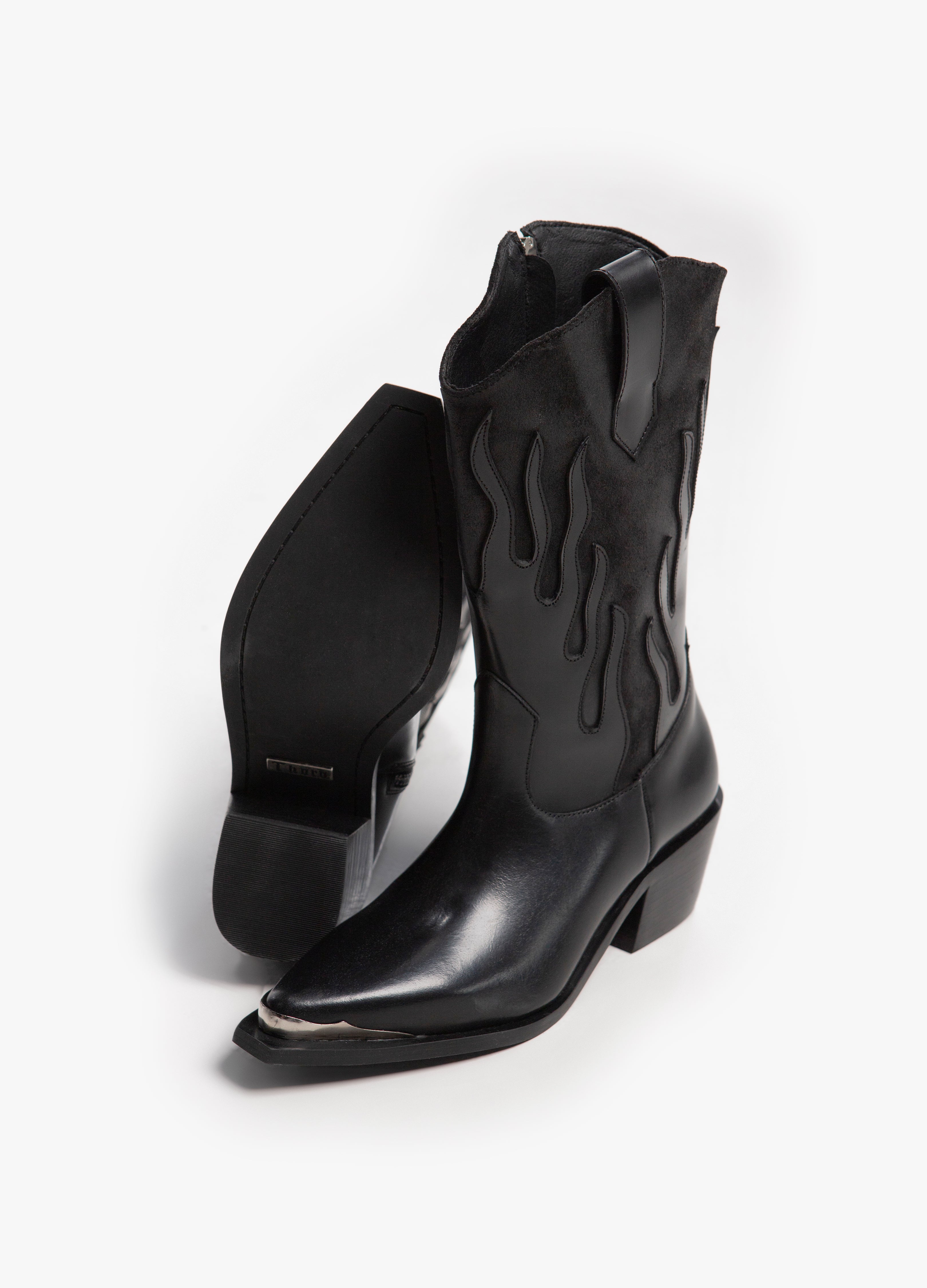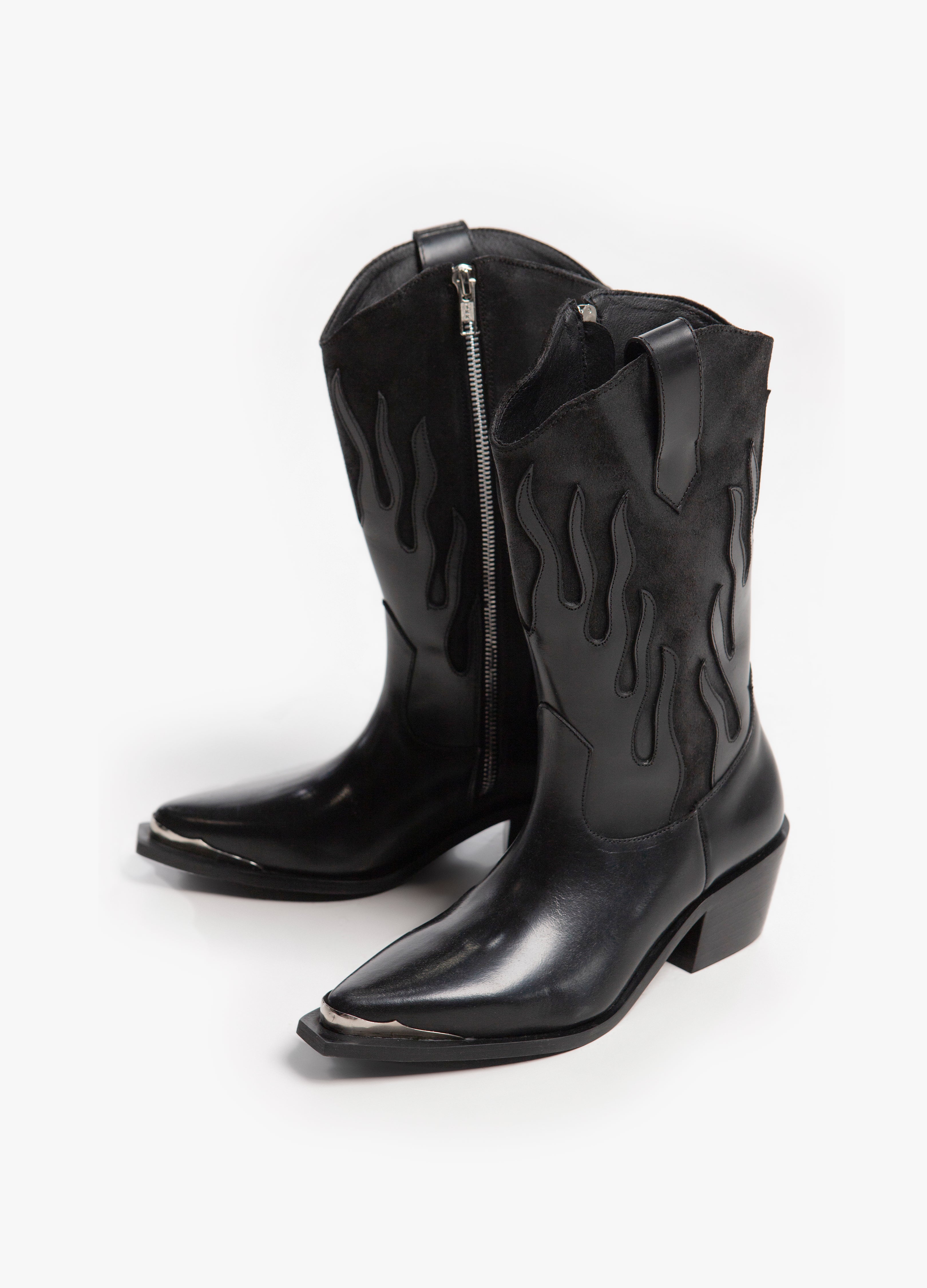 Cowboy boot (high tube) made of black cowhide with a flame design in a shiny finish and a suede-finished tube with a silver side closure, Cuban heel and metallic toe.