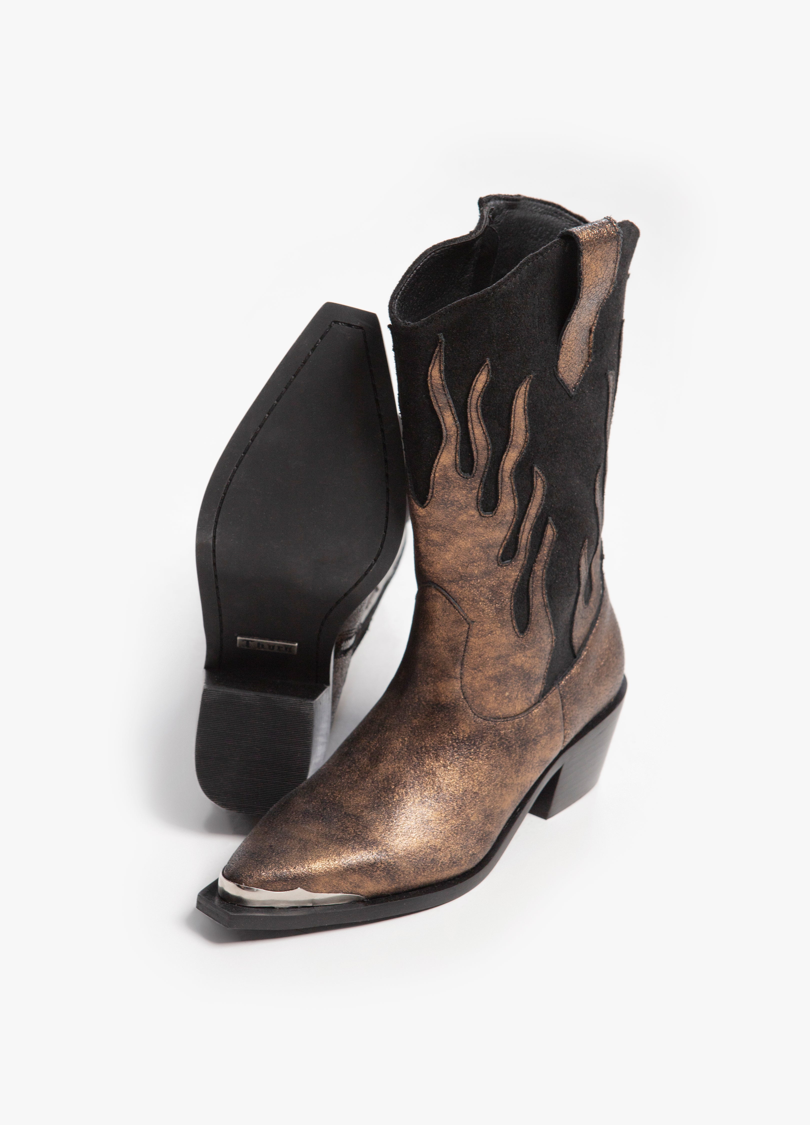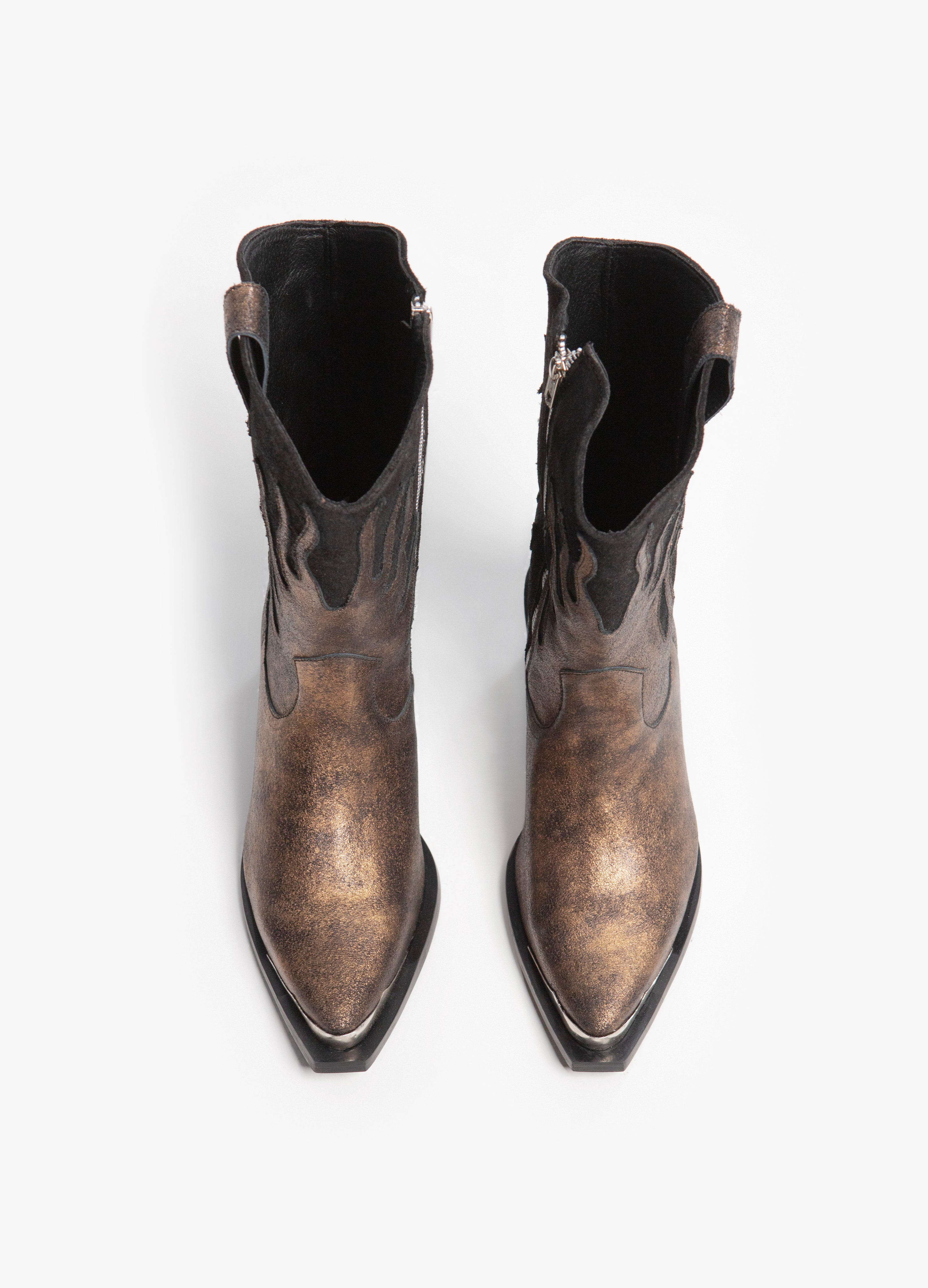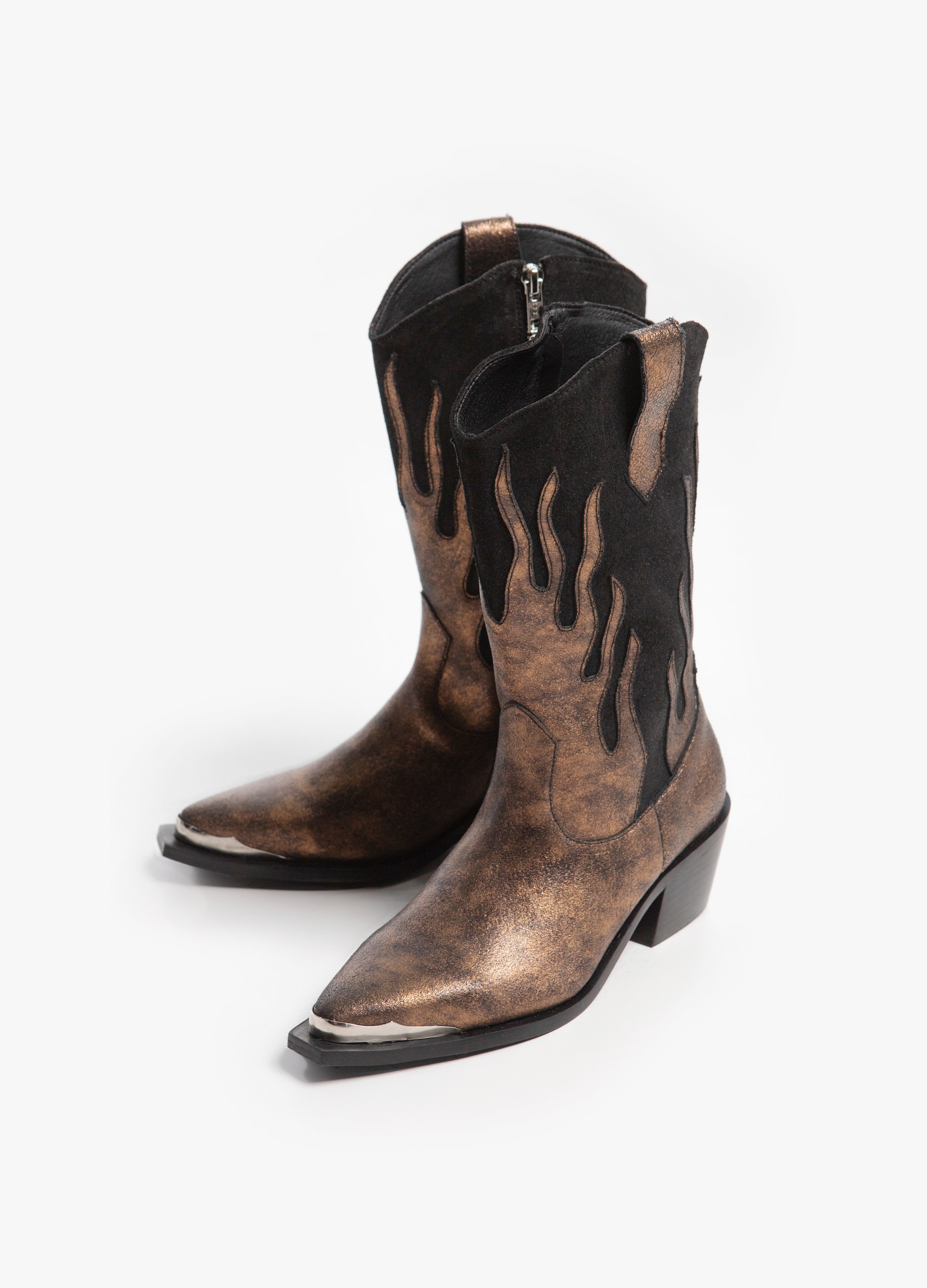 Cowboy boot (high tube) made of cowhide with a flame design in a bronze metallic finish and a black suede-finished tube with a silver side closure, Cuban heel and metallic toe.