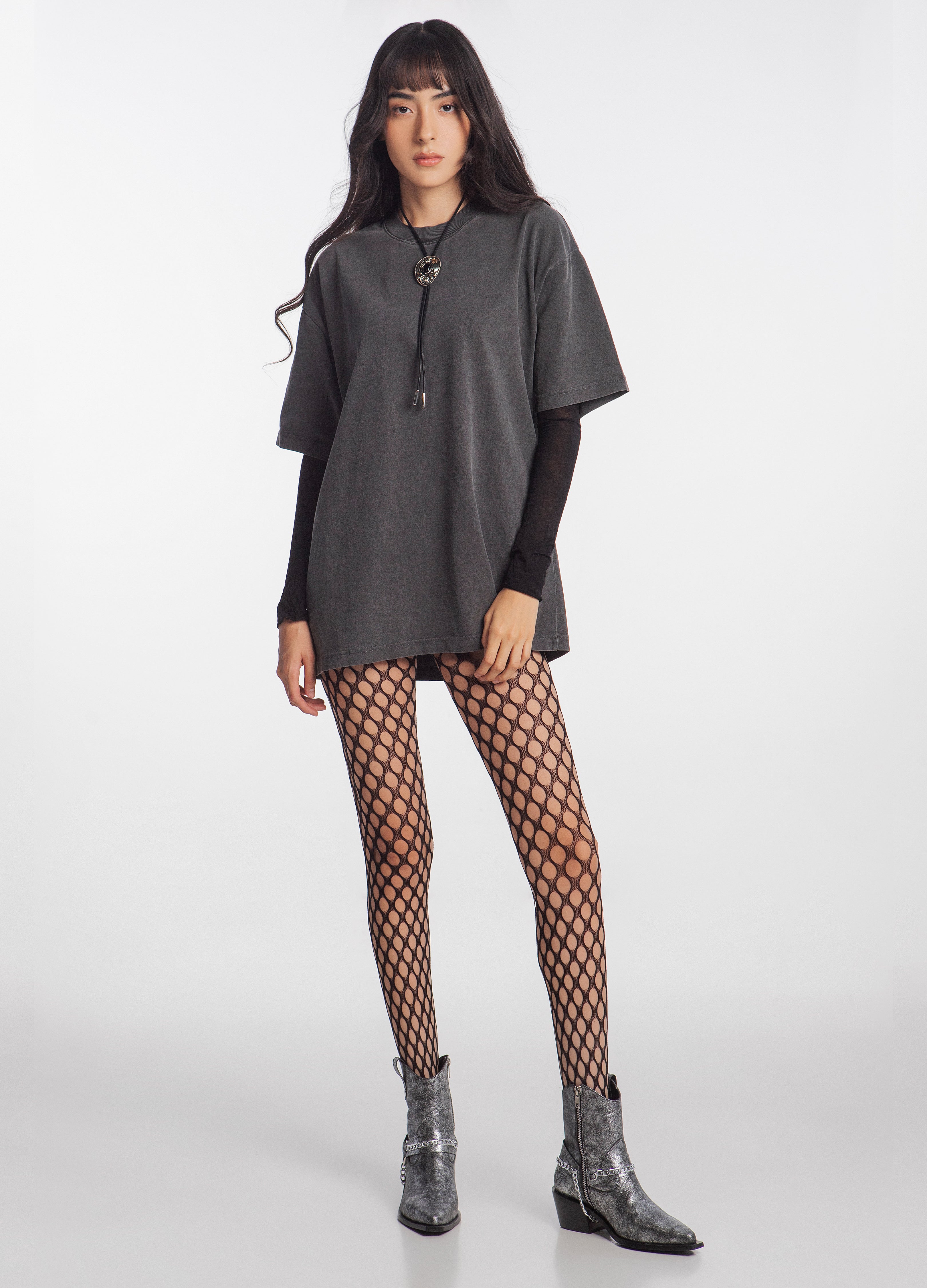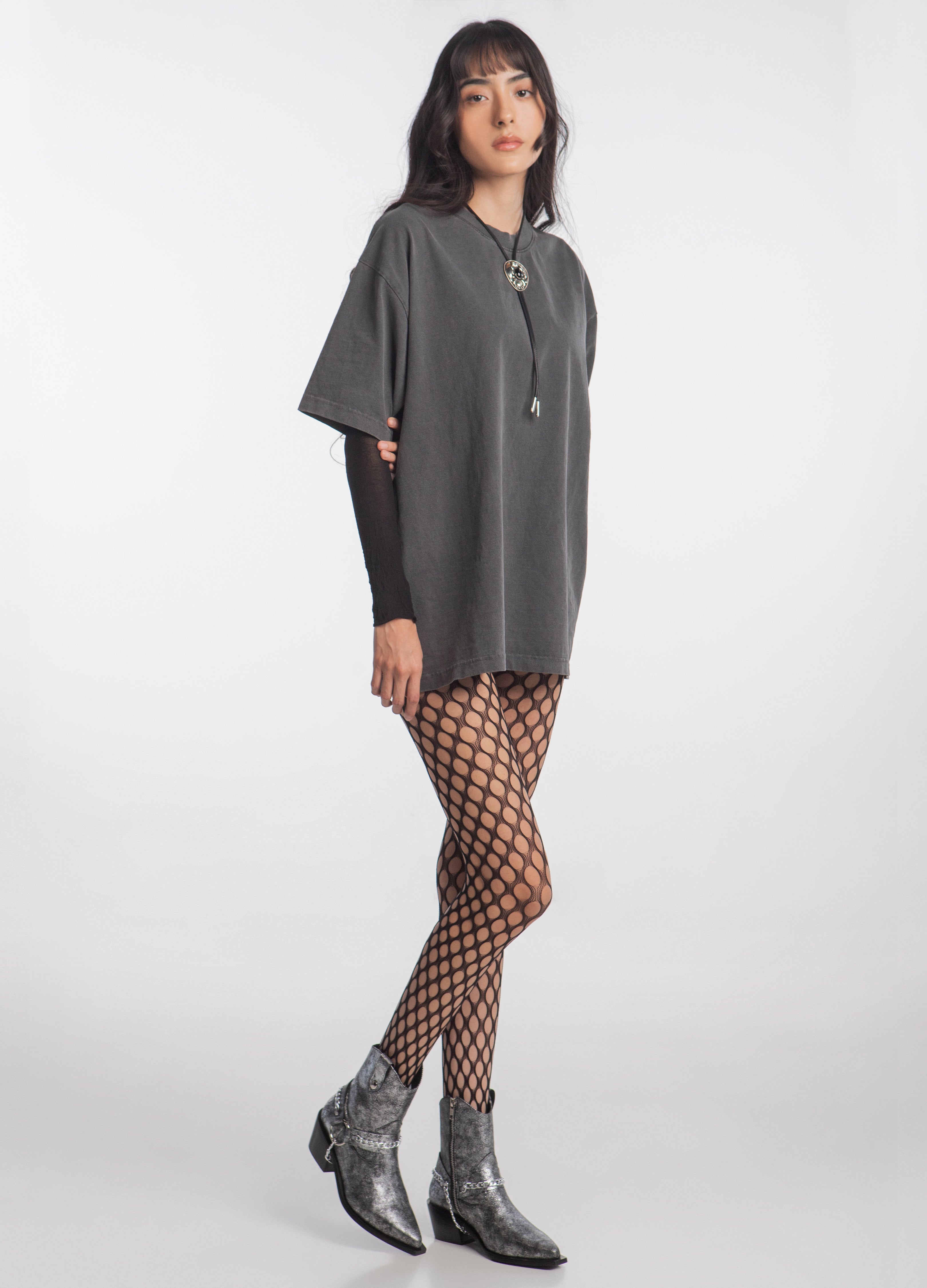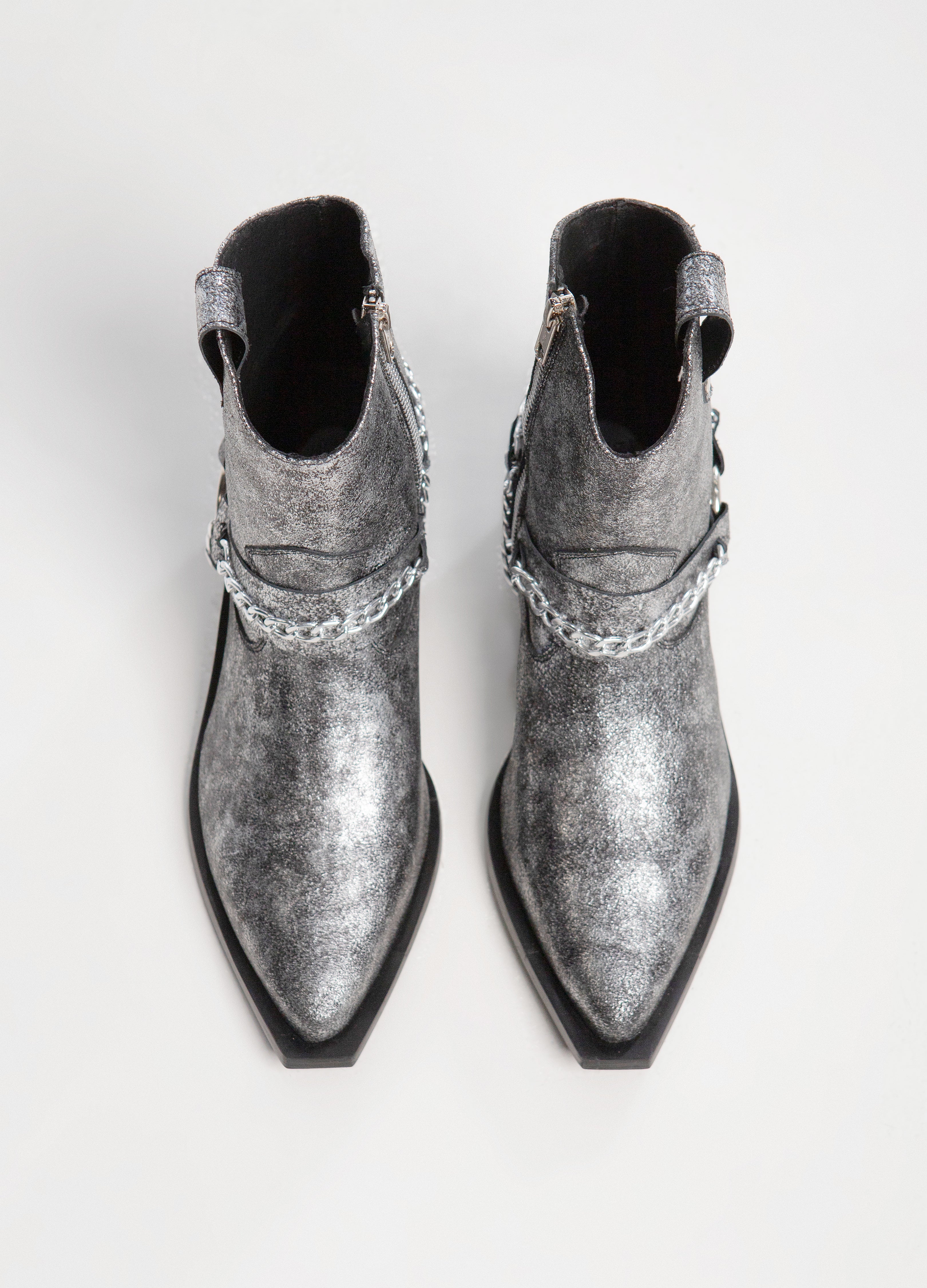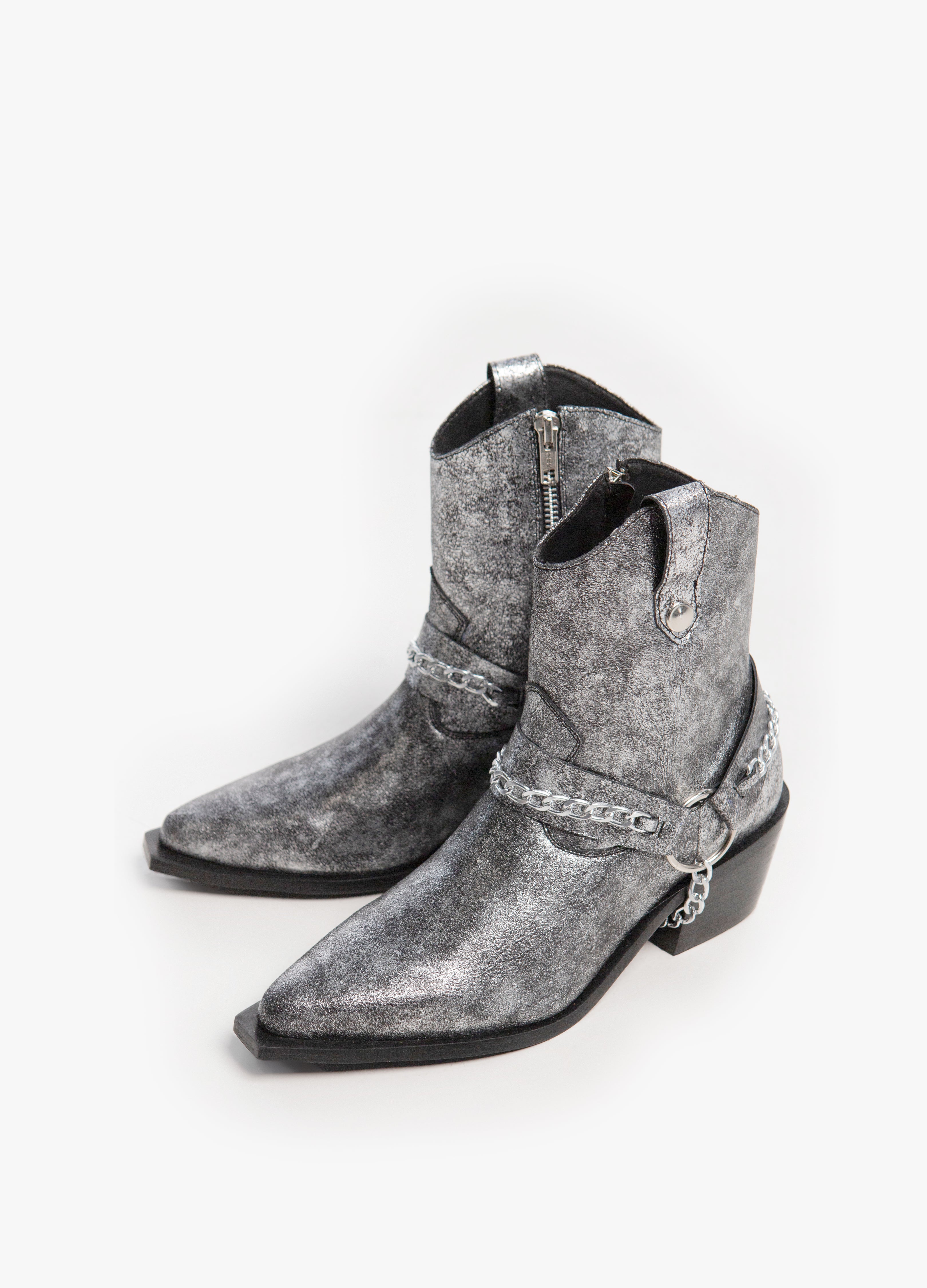 Chelsea boot made of silver-colored cowhide with harness, rings and chains, cowboy boot design and the emblematic Thoro plaque on the sole.