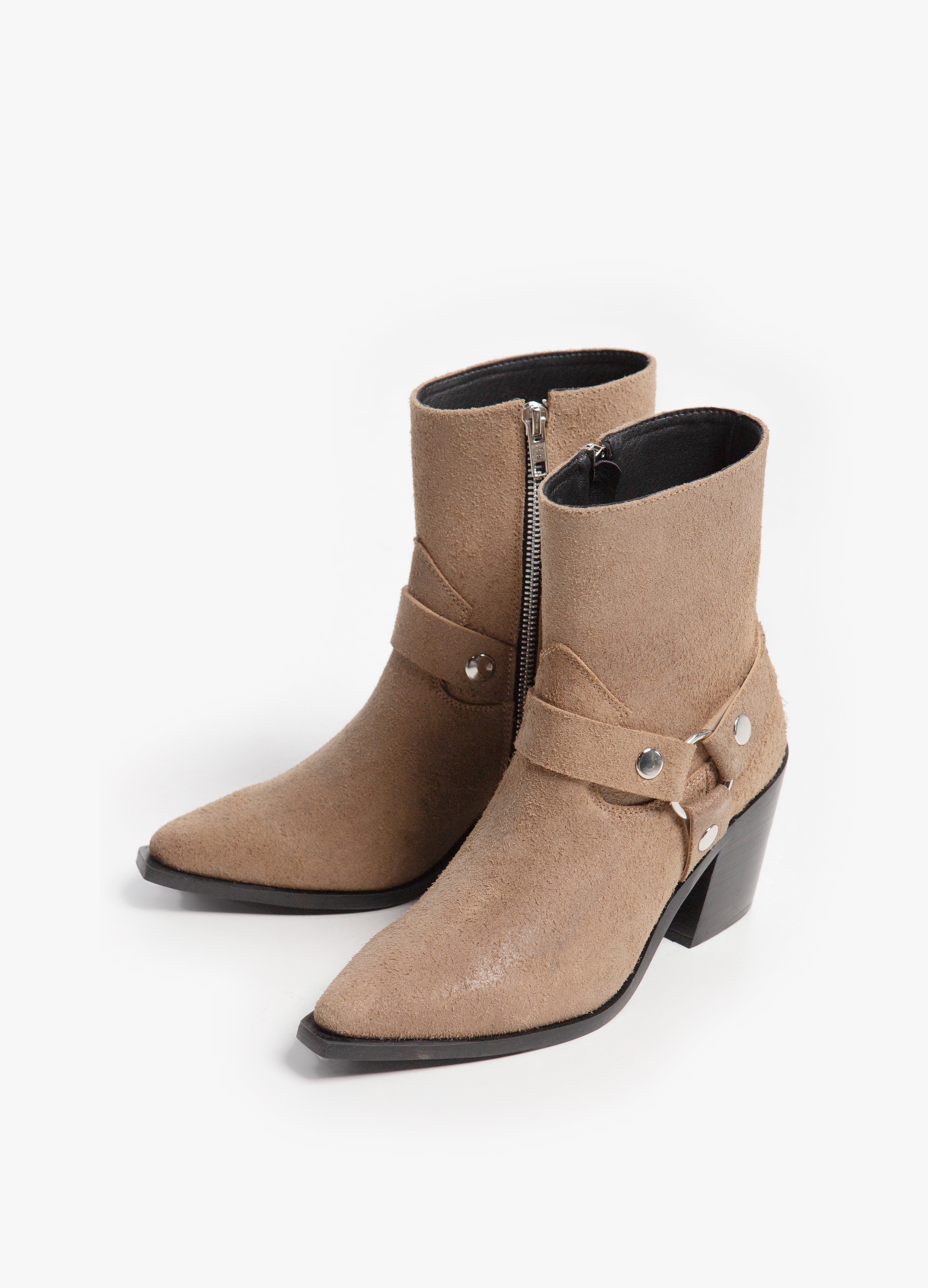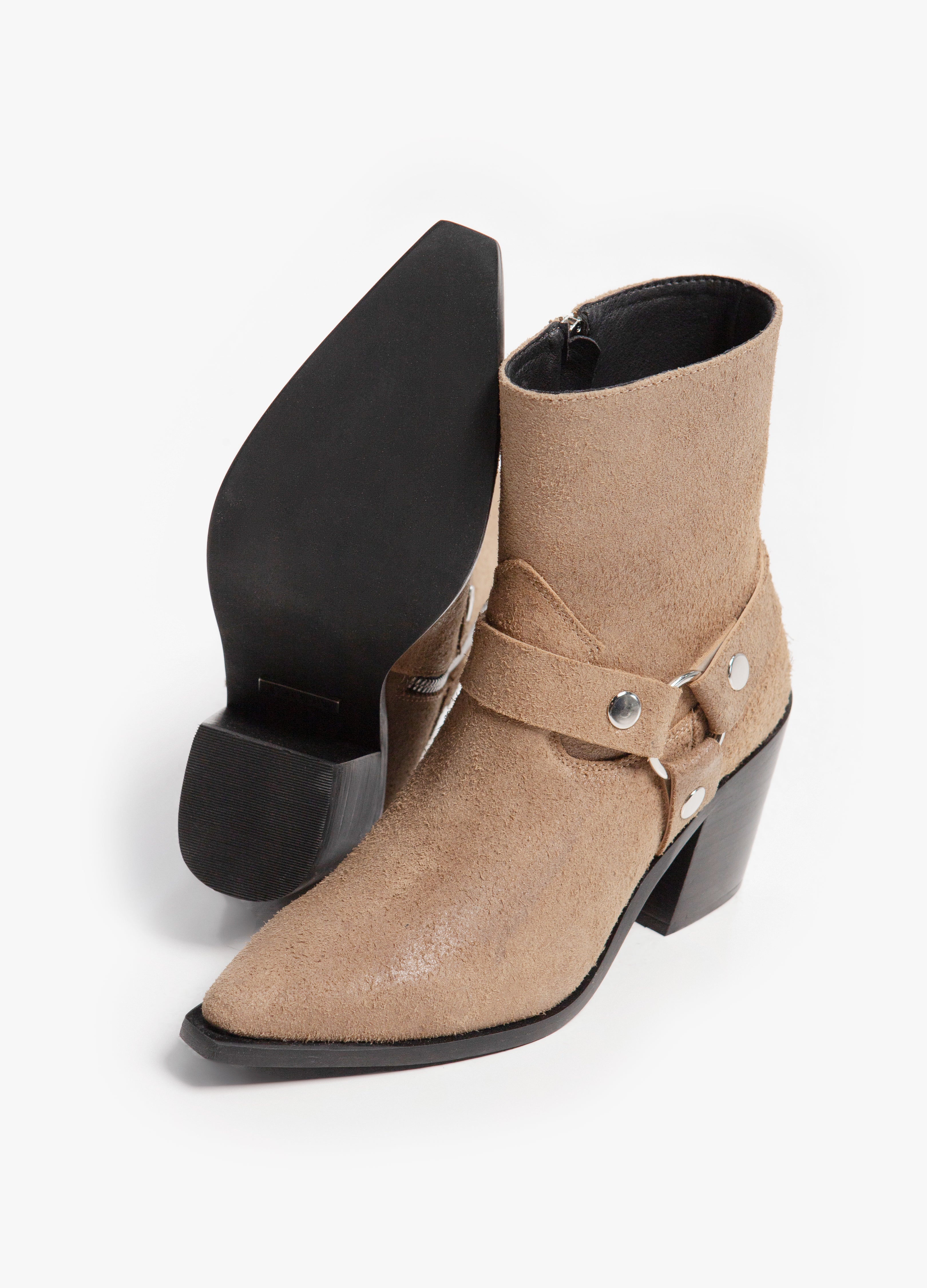 Chelsea boot made of sand-colored suede leather, with side closure, harness with headband and ring and the emblematic Thoro plaque on the sole.
