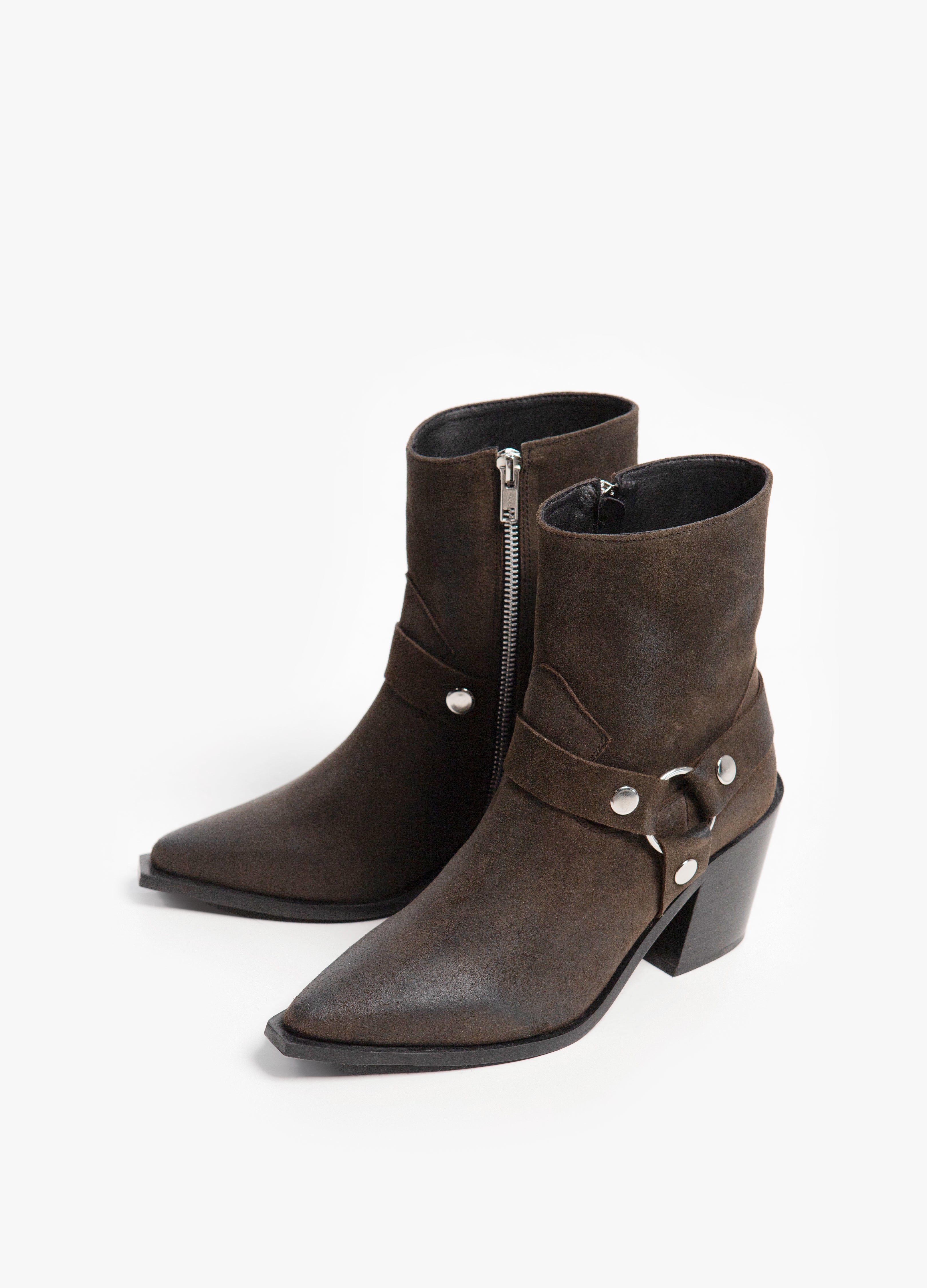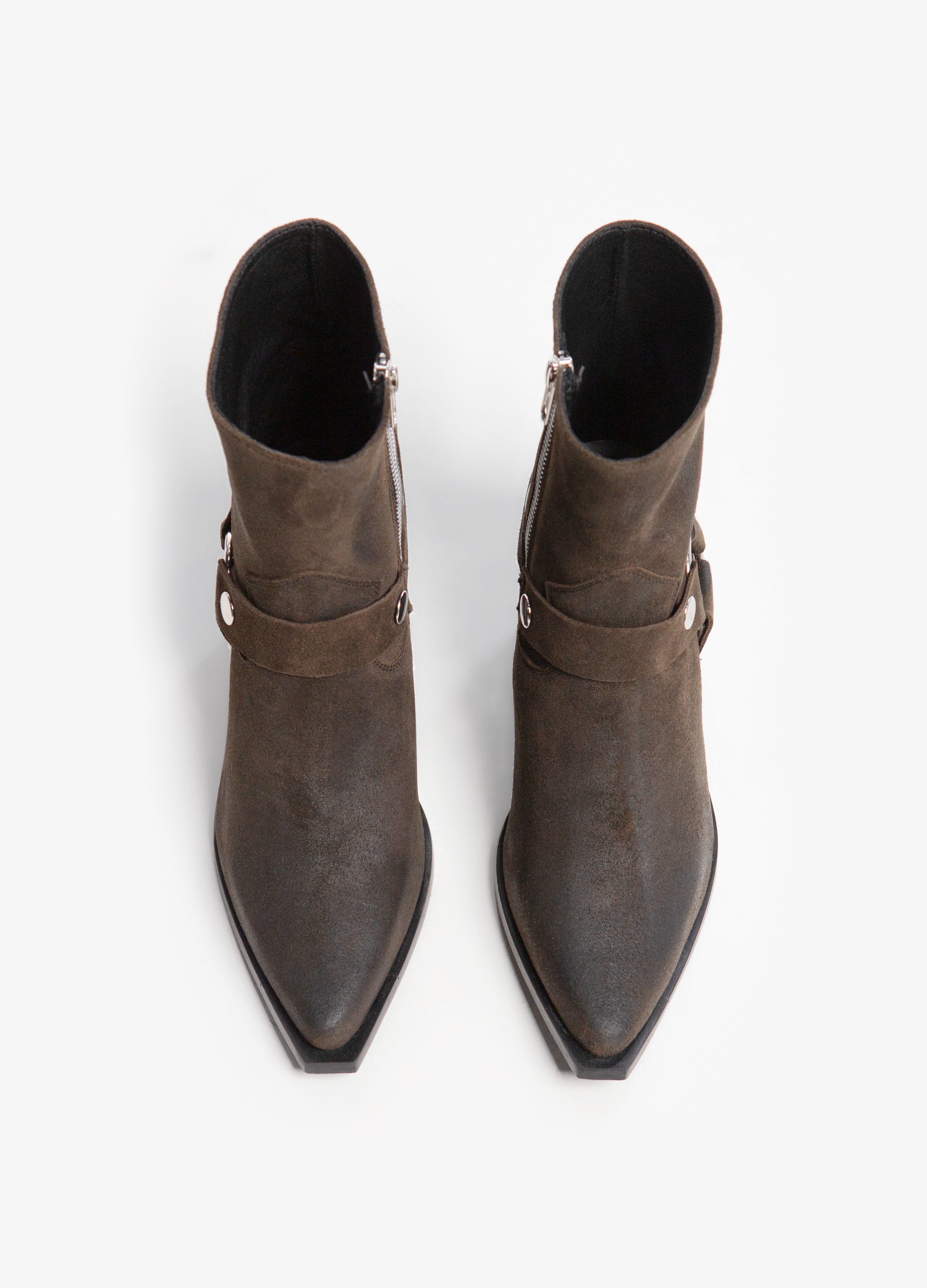 Chelsea boot made of olive-colored suede leather with side closure, harness with headband and ring and the emblematic Thoro plaque on the sole.