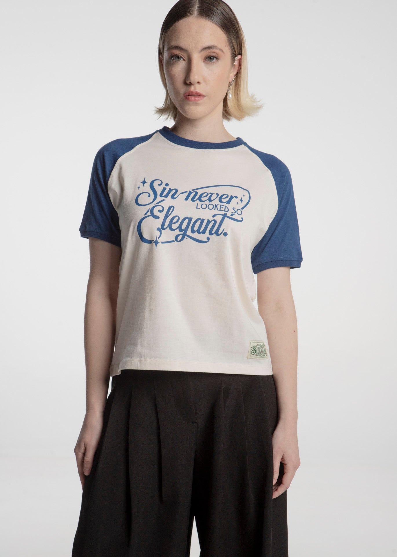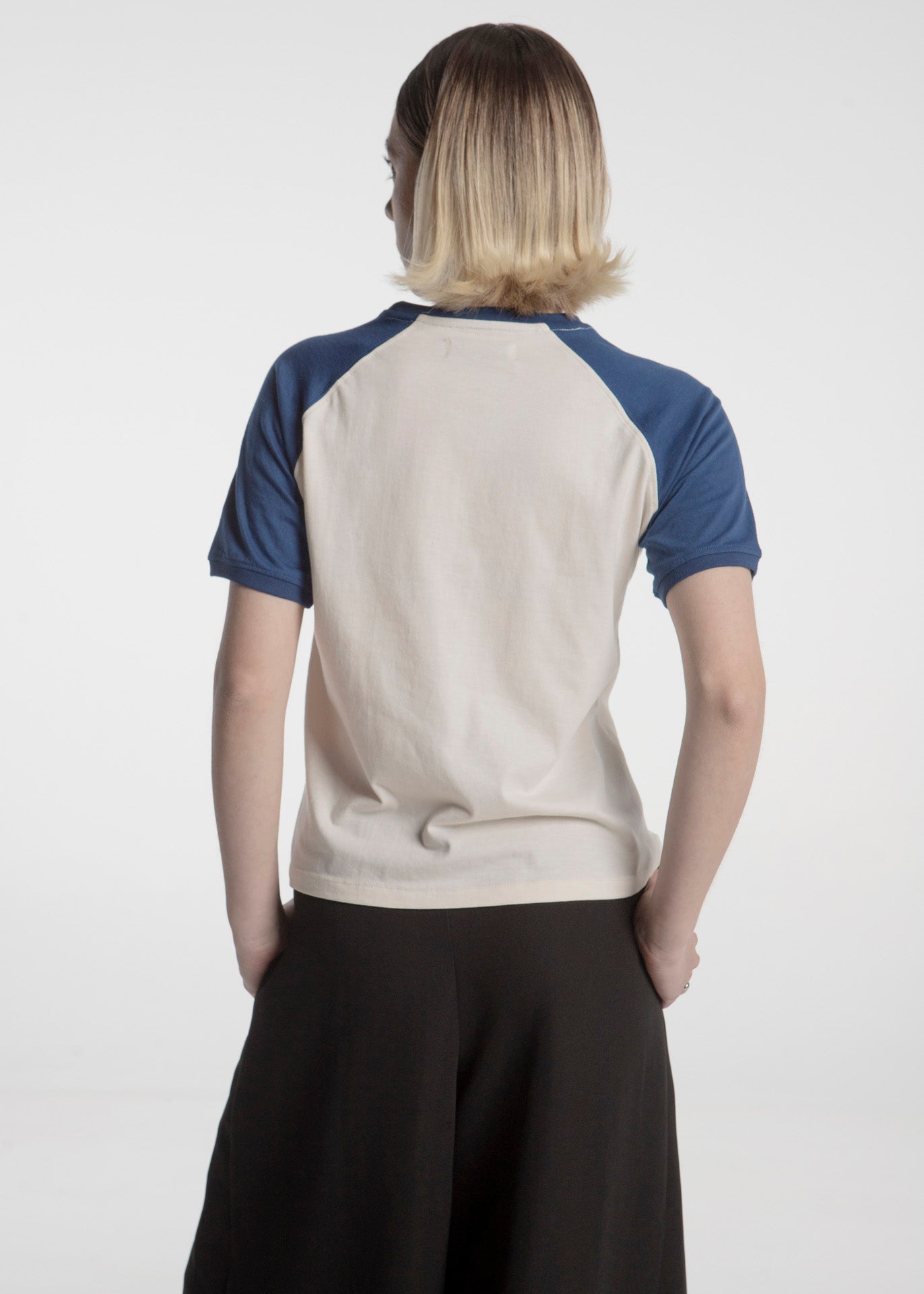 Playera tipo Rangla con hombros y brazos en color azul. fabricada en algodón con corte slim con diseño en serigrafía con pecho.