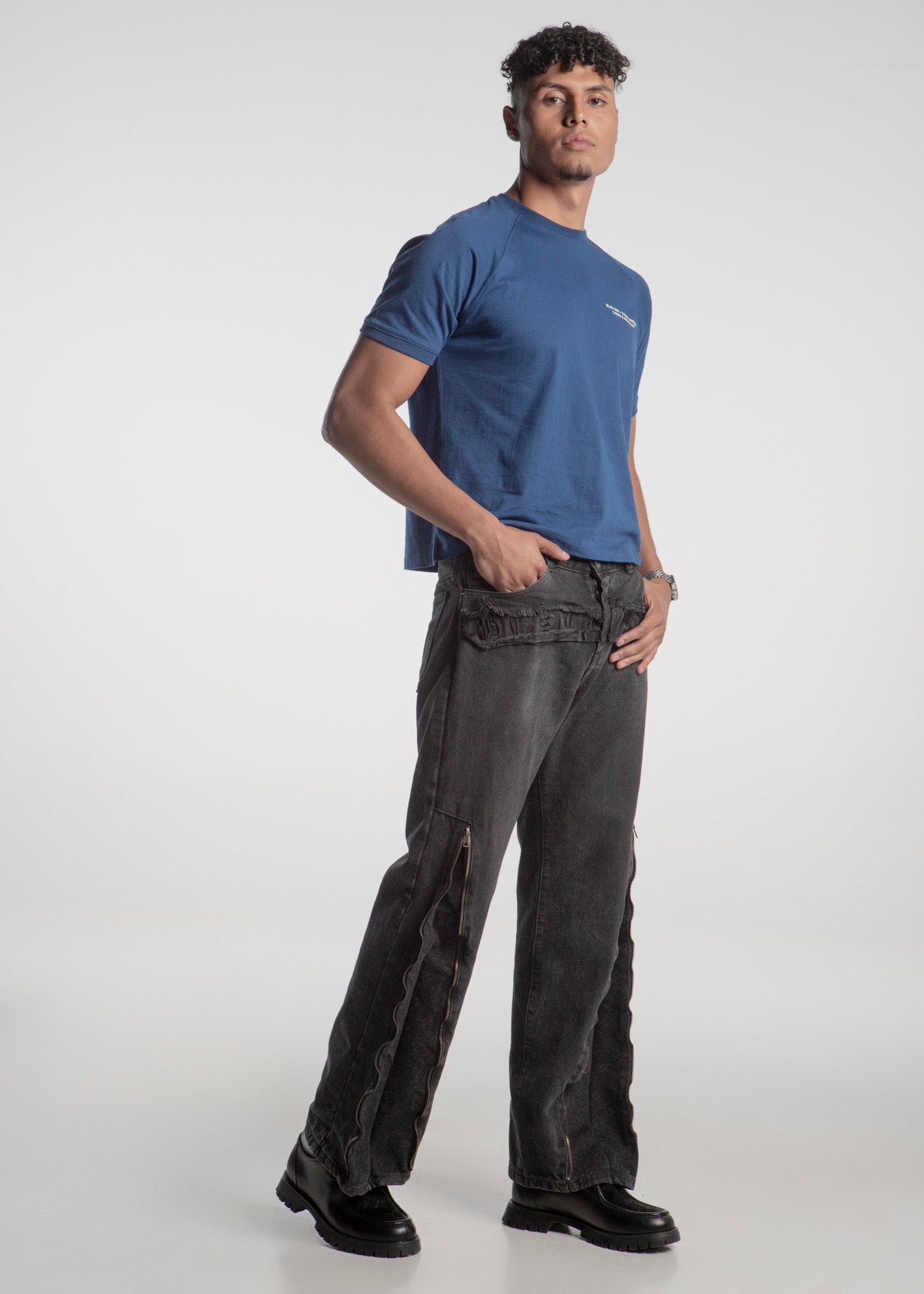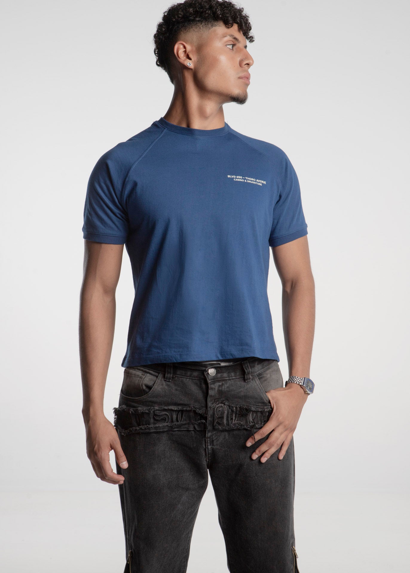 Playera tipo Rangla azul marino, fabricada en algodón con corte slim con diseño en el frente a un costado y full print en la espalda con la leyenda "Taste My Luck"