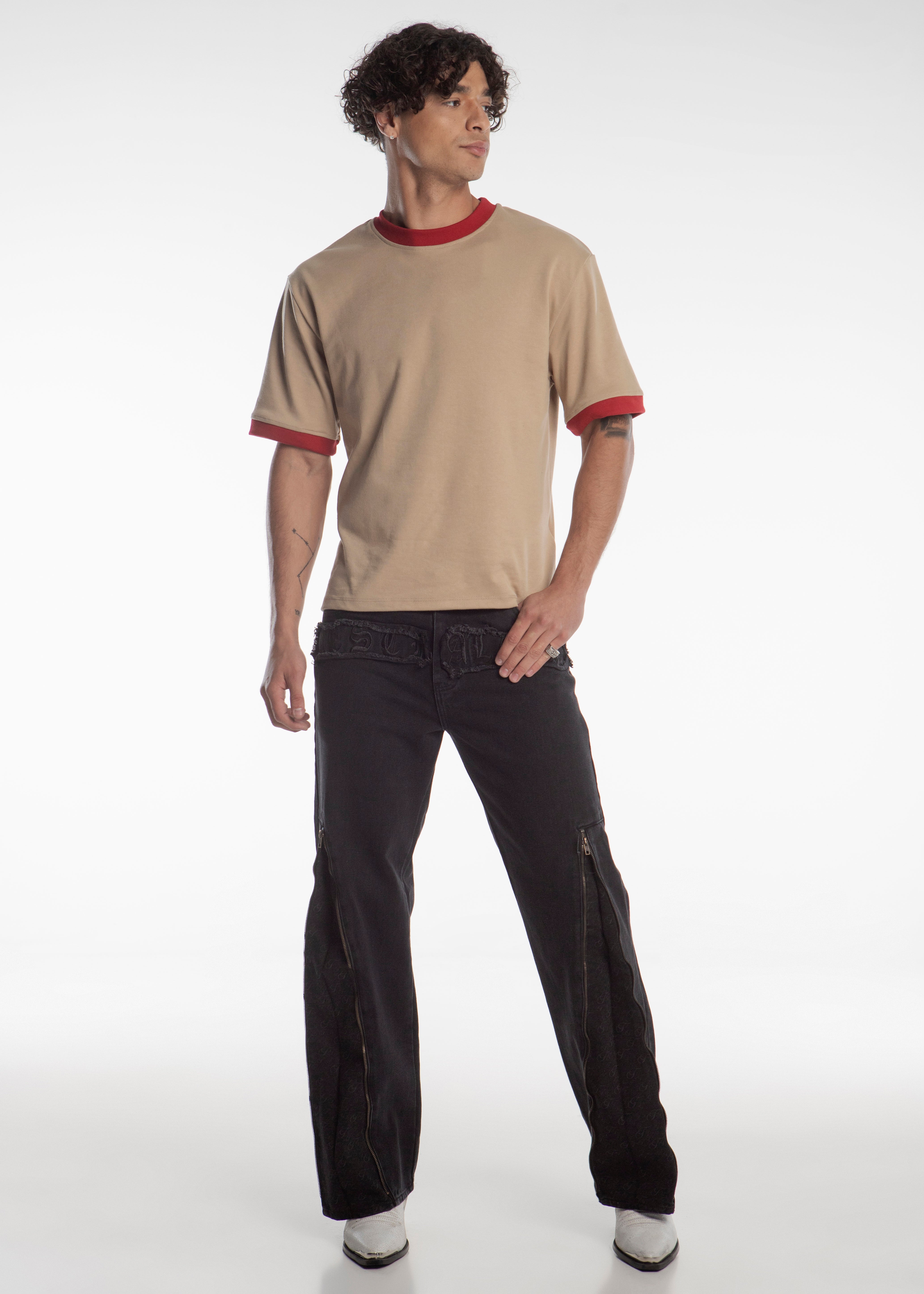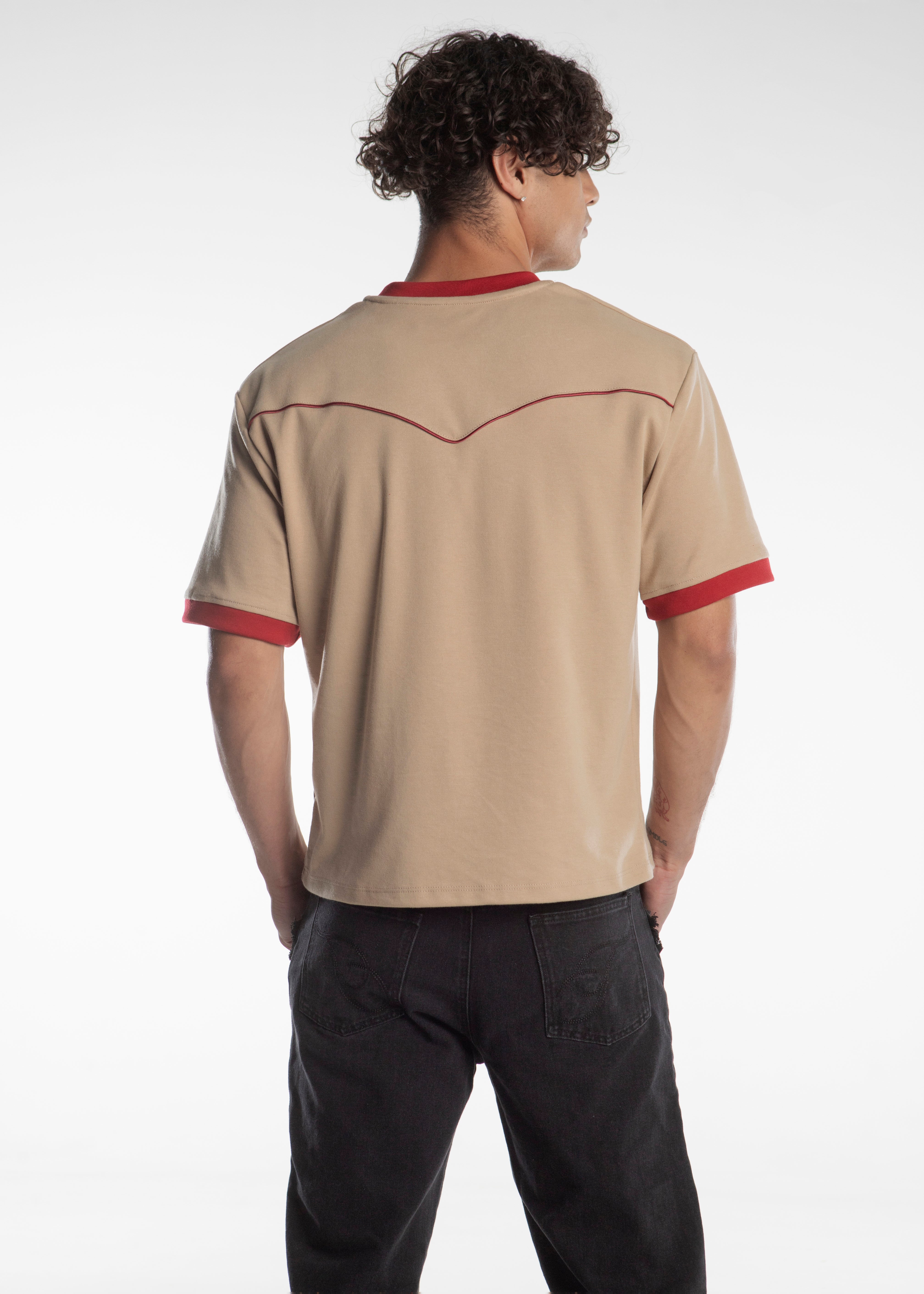 Playera tipo ringer 100% algodón corte boxy color Khaki con terminaciones en cuello y mangas en color rojo y el distintivo ribete en la espalda de una camisa vaquera en color rojo