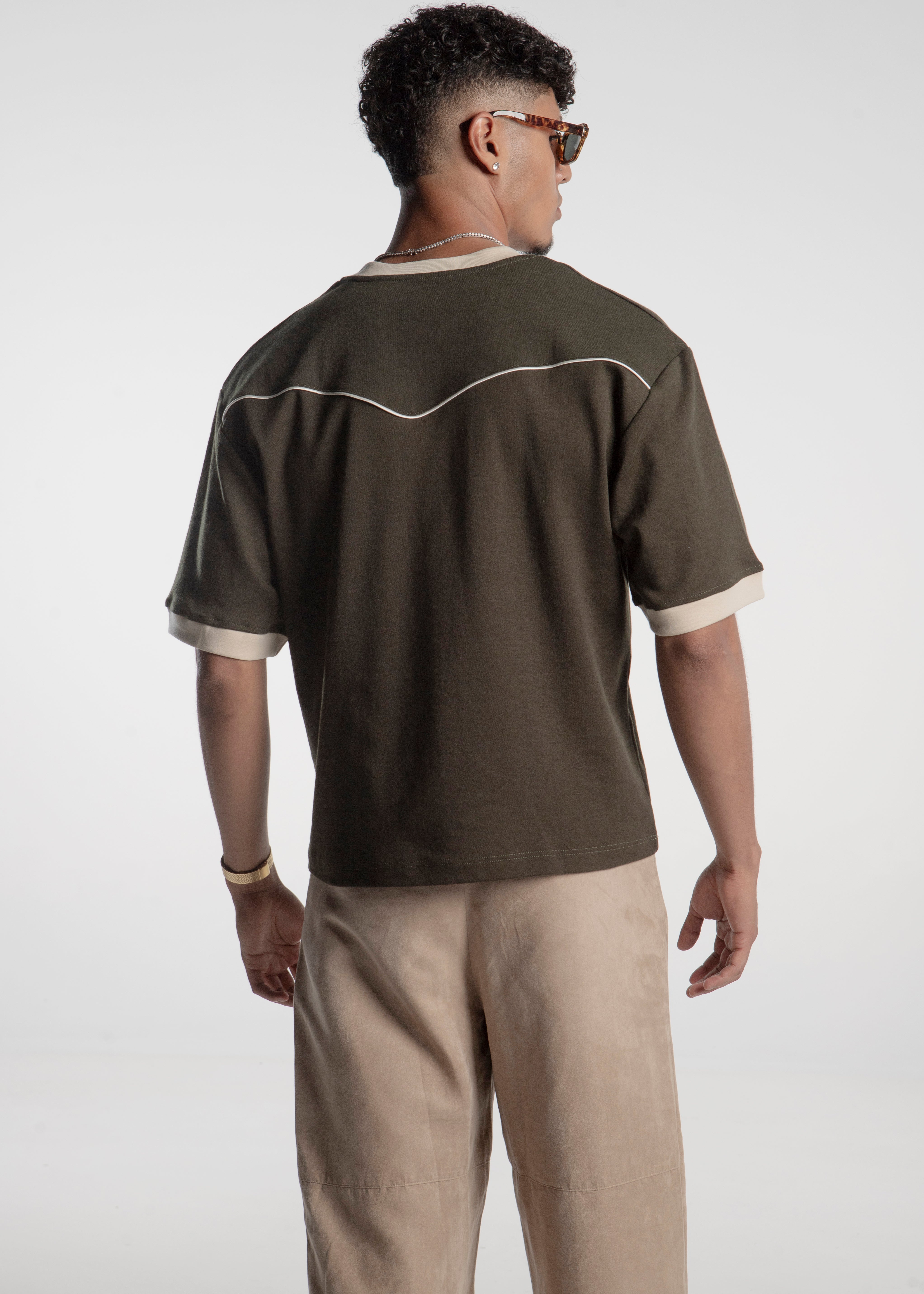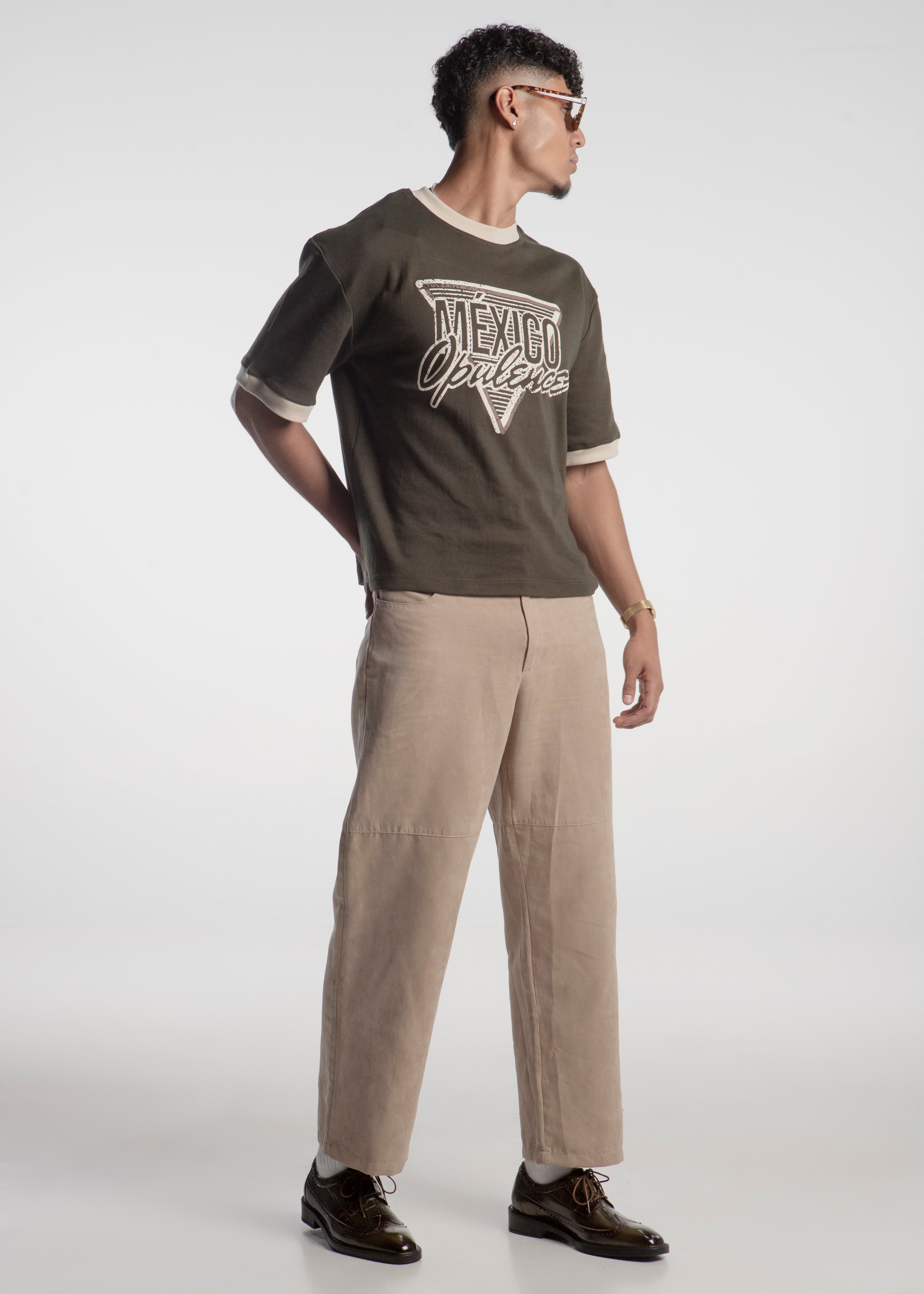 Playera fabricada en 100% algodón de corte boxy color verde olivo con remates en cuello y magas color beige con un clásico ribete vaquero en la espalda color beige y el diseño en el que se lee "México Opulence" adornado con un triangulo invertido detrás.
