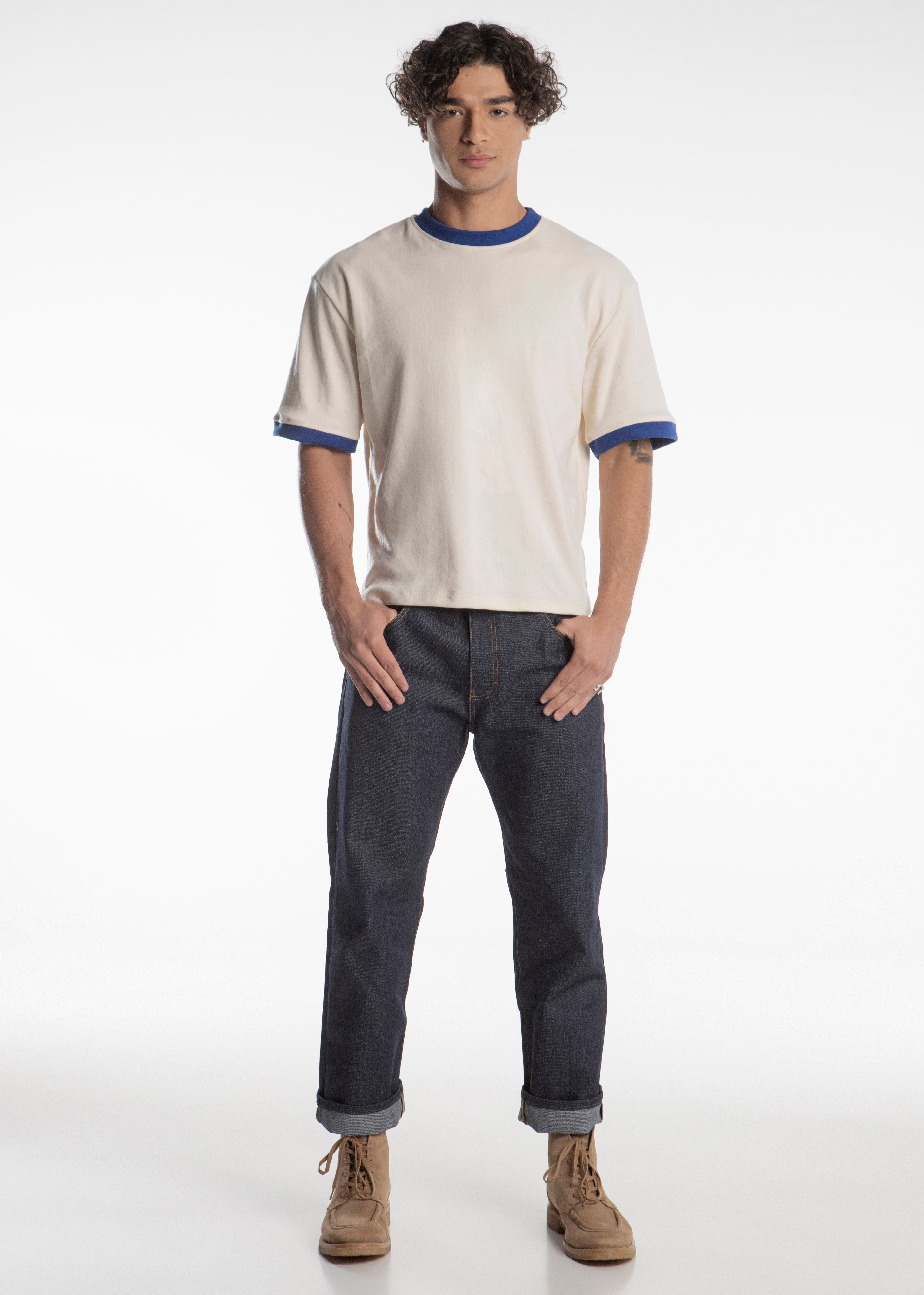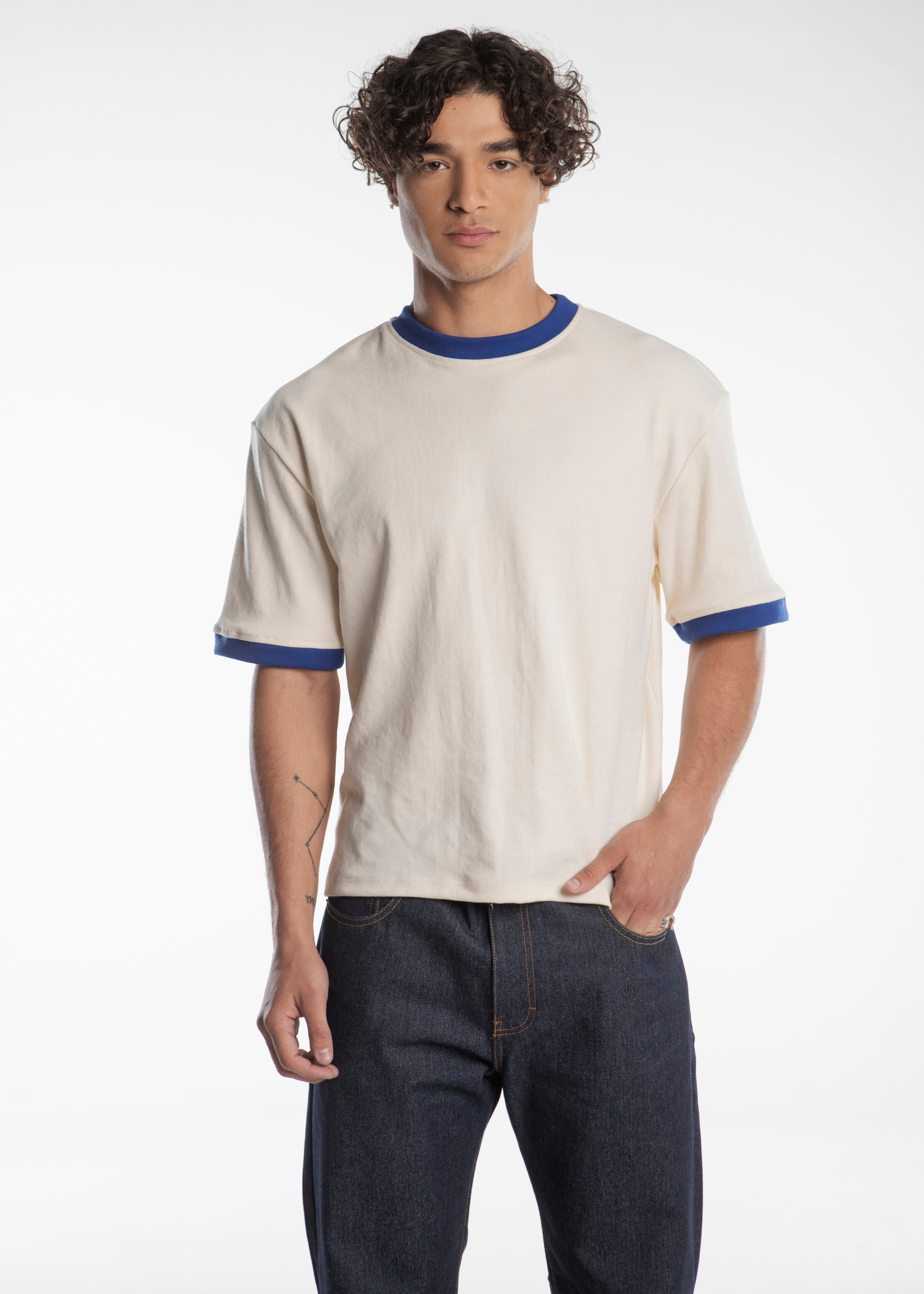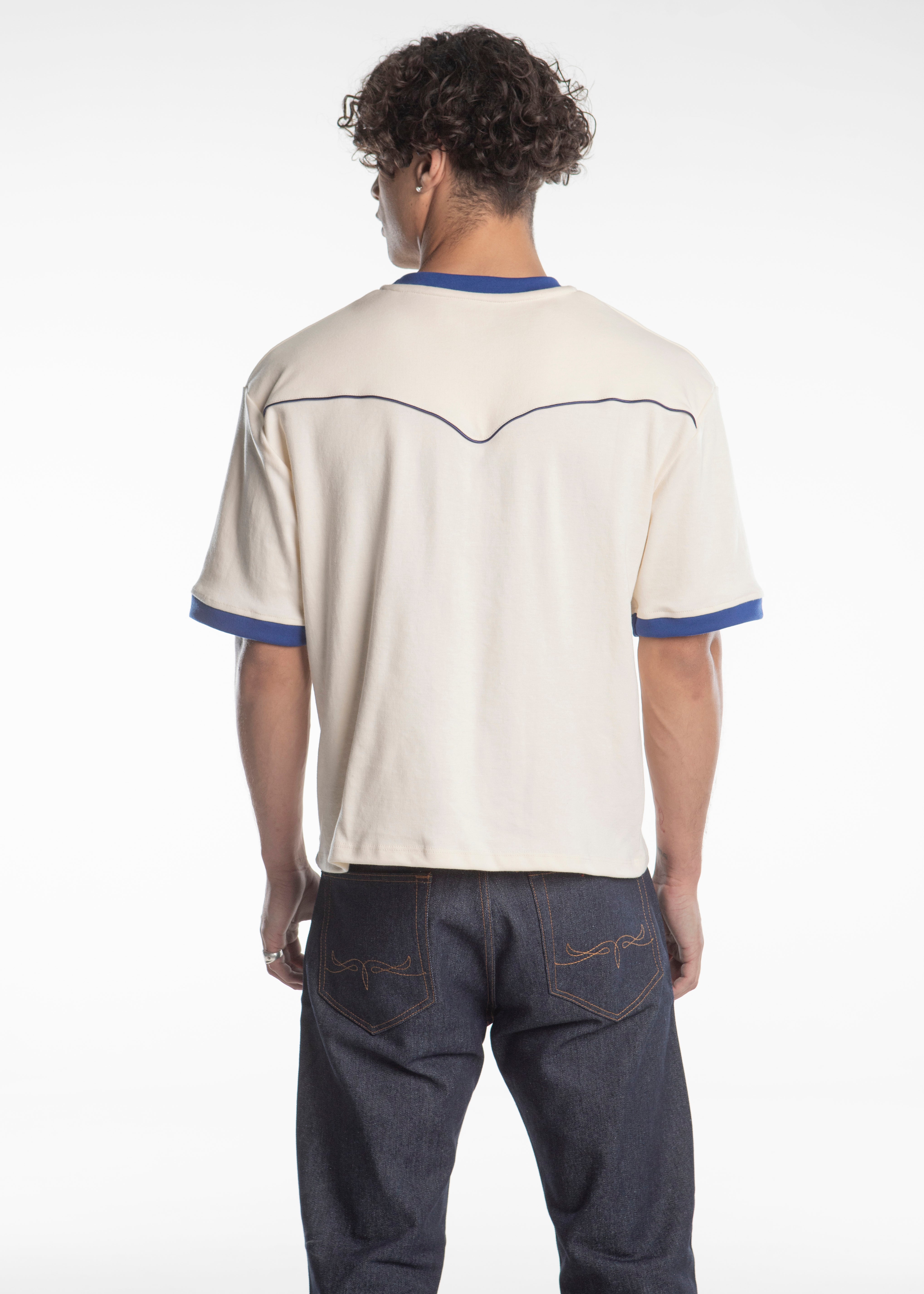 Playera tipo ringer 100% algodón corte boxy color Off White con terminaciones en cuello y mangas en color azul y el distintivo ribete en la espalda de una camisa vaquera en color azul