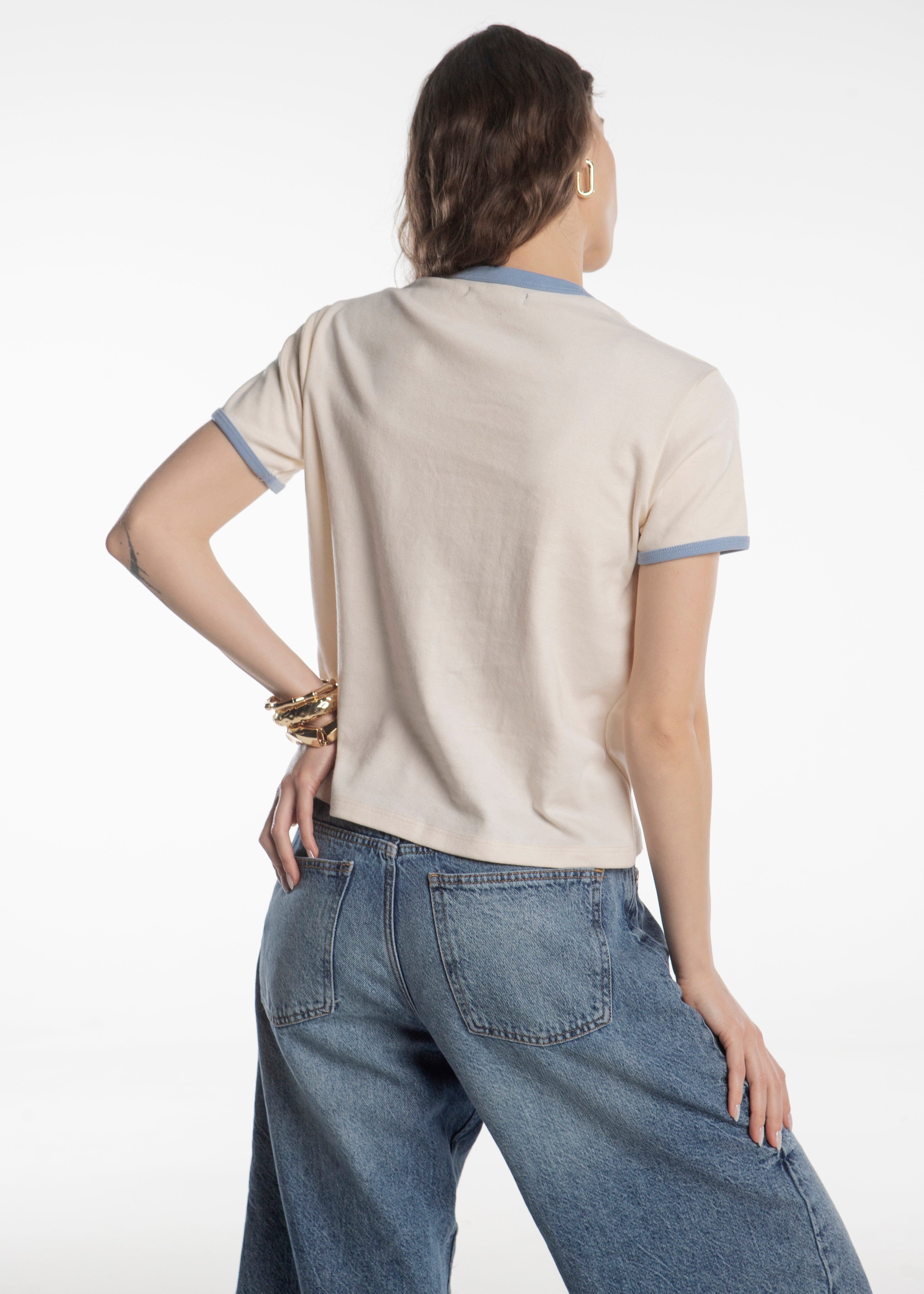 Playera tipo ringer 100% algodón corte Slim en color off White con terminaciones en cuello y mangas en color azul pastel y un corazón de espinas en el frente con la leyenda "Oasis Blvd., Cowgirl". Impresión en Serigrafía.