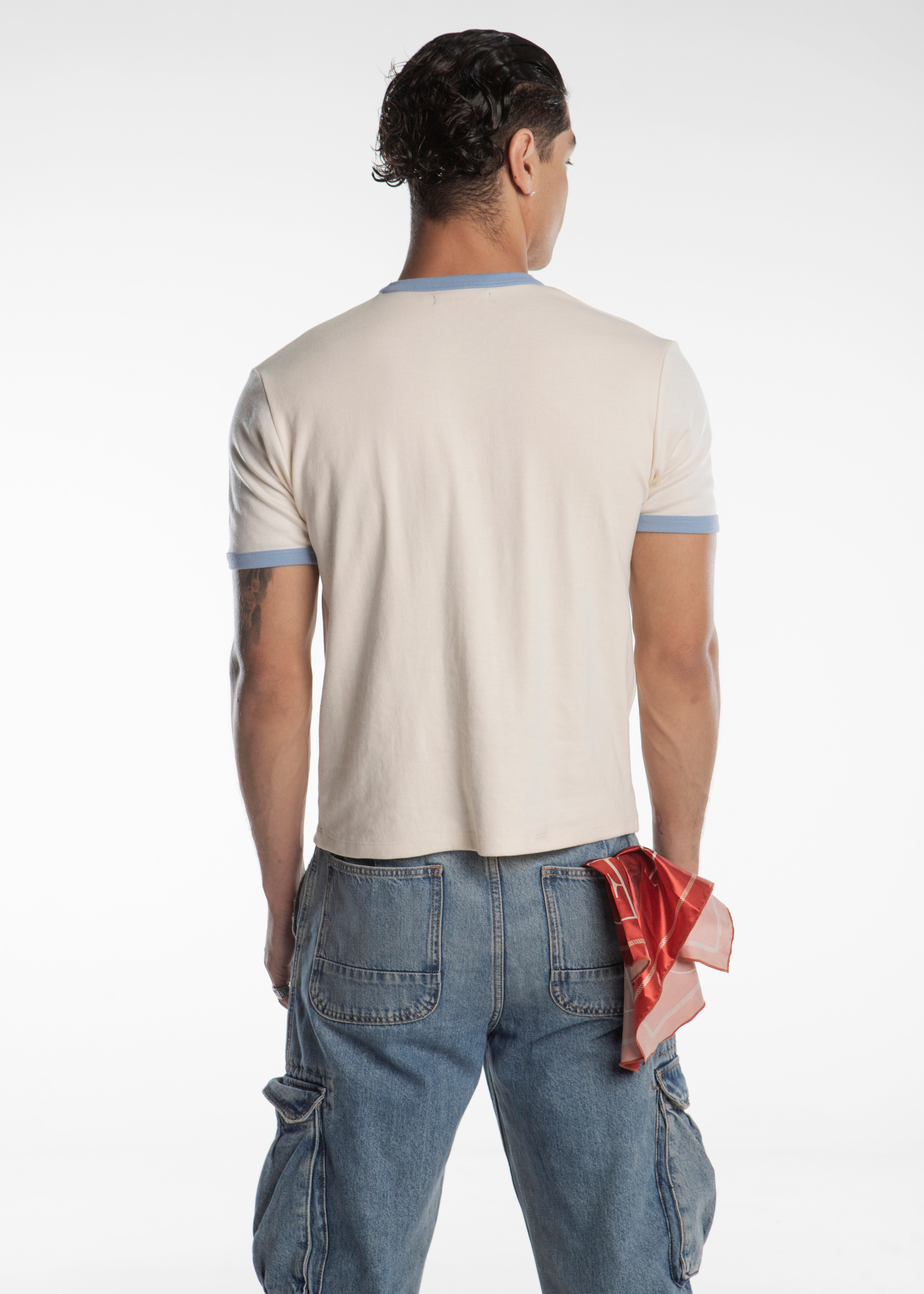 Playera tipo ringer 100% algodón corte Slim color Off White con terminaciones en cuello y mangas en color azul pastel y la leyenda "Infamous" con un caballo saltando a través de una corona de espina. Impresión en Serigrafía.