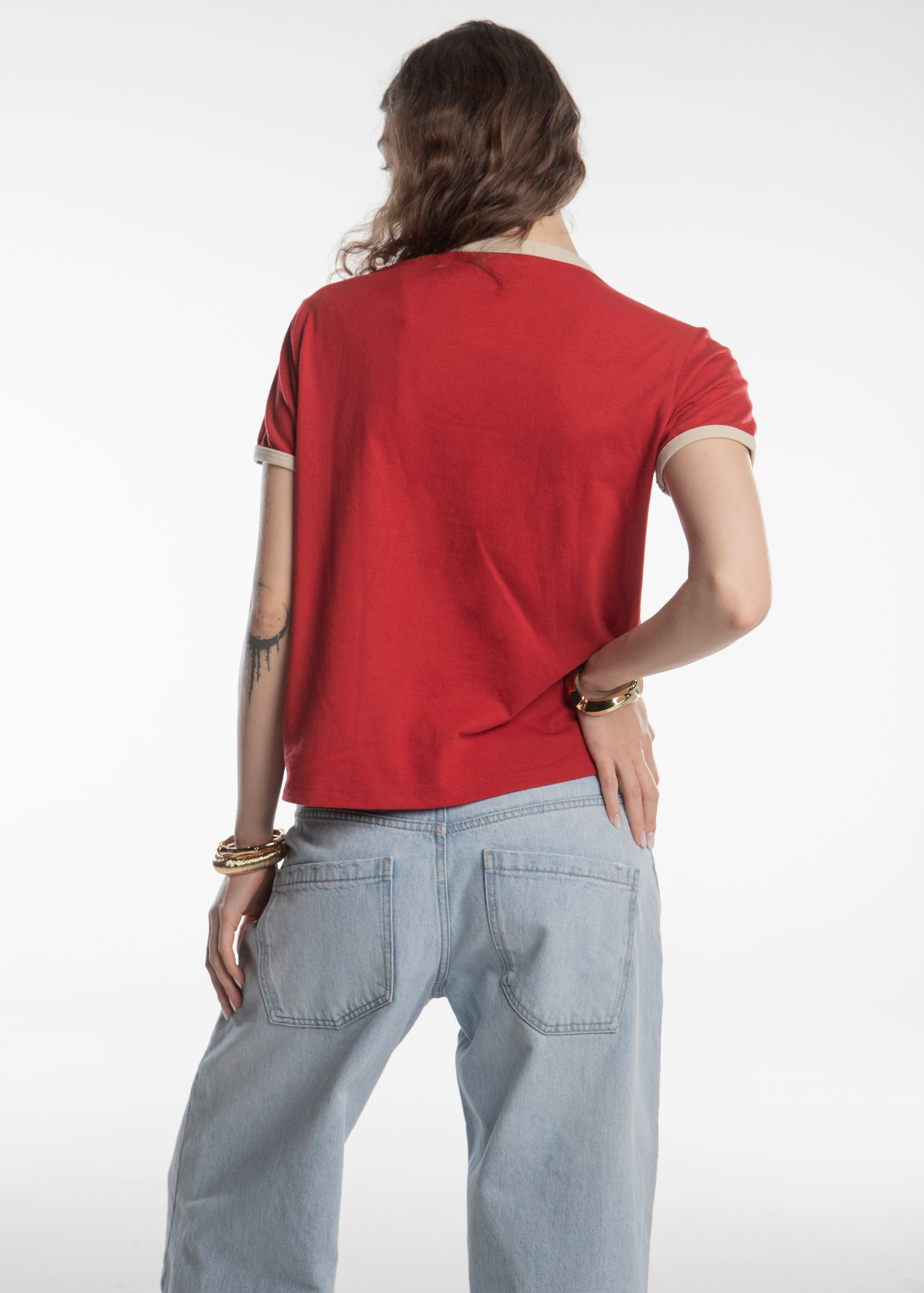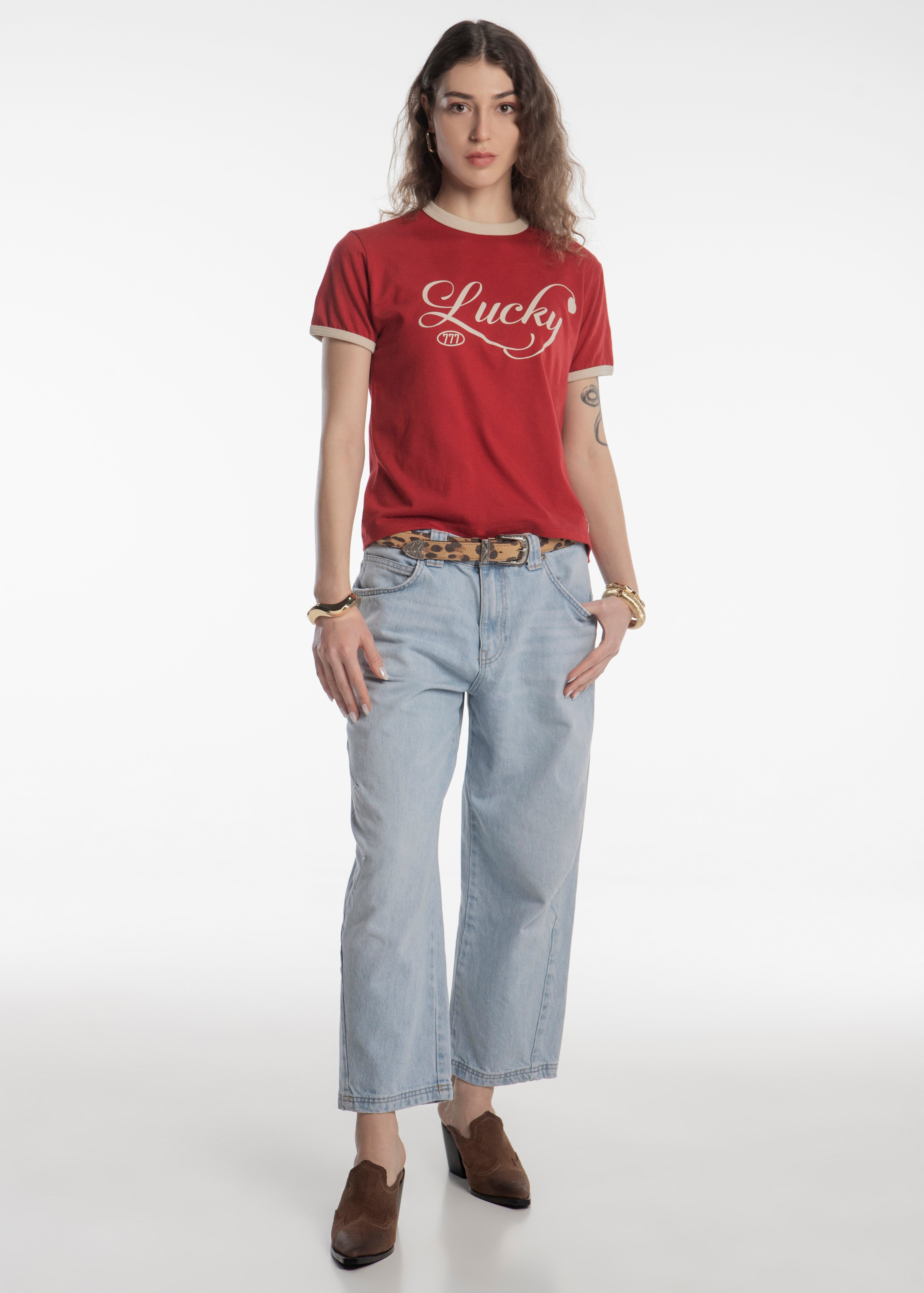 Playera tipo ringer 100% algodón corte Slim en color rojo con terminaciones en cuello y mangas en color beige y la leyenda "Lucky" con una cereza en la "k" y un "777". Impresión en Serigrafía.