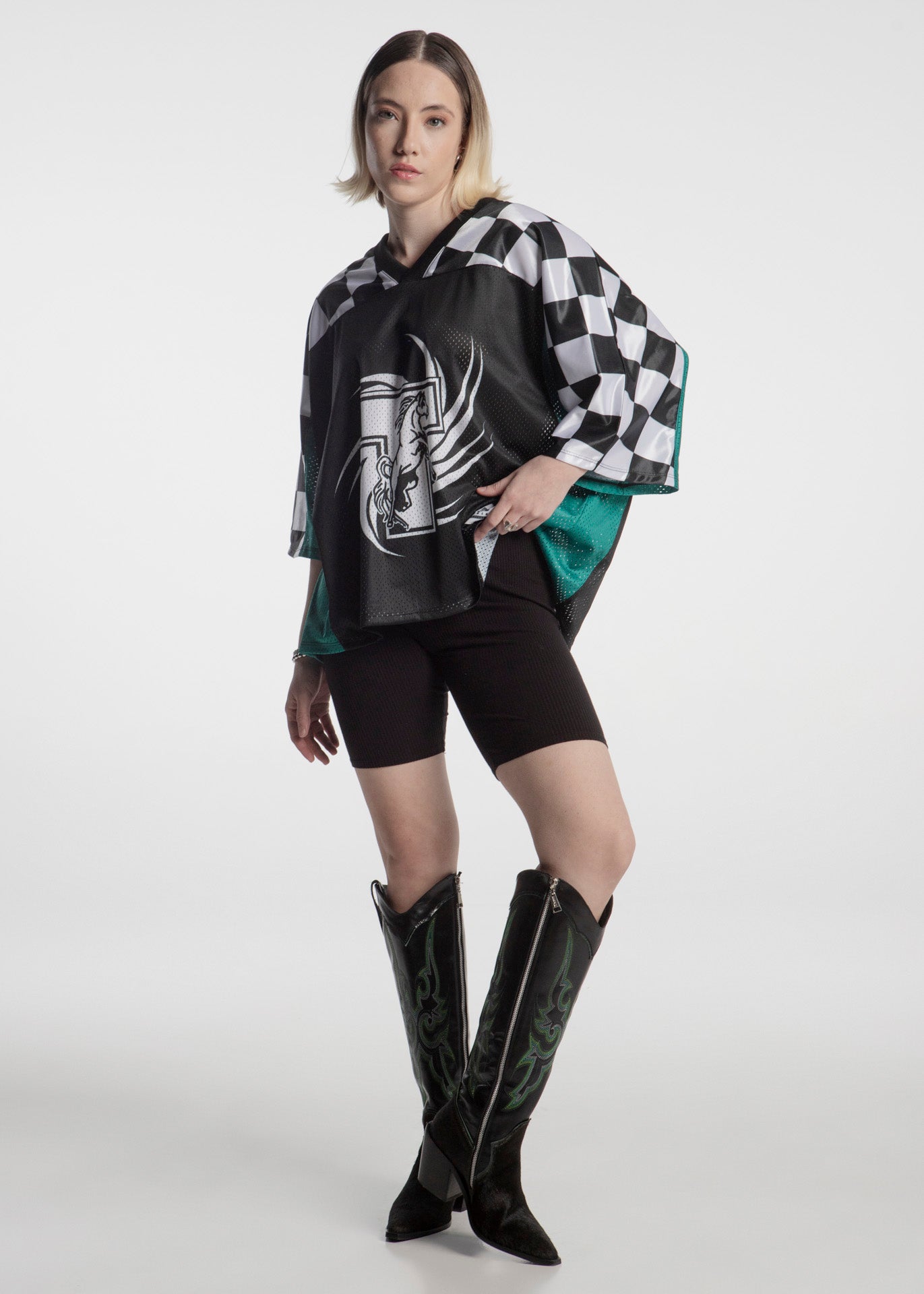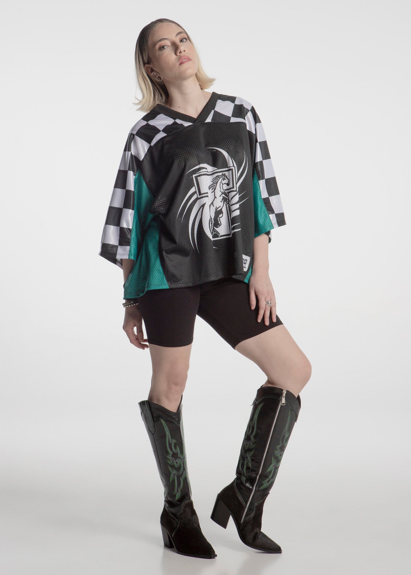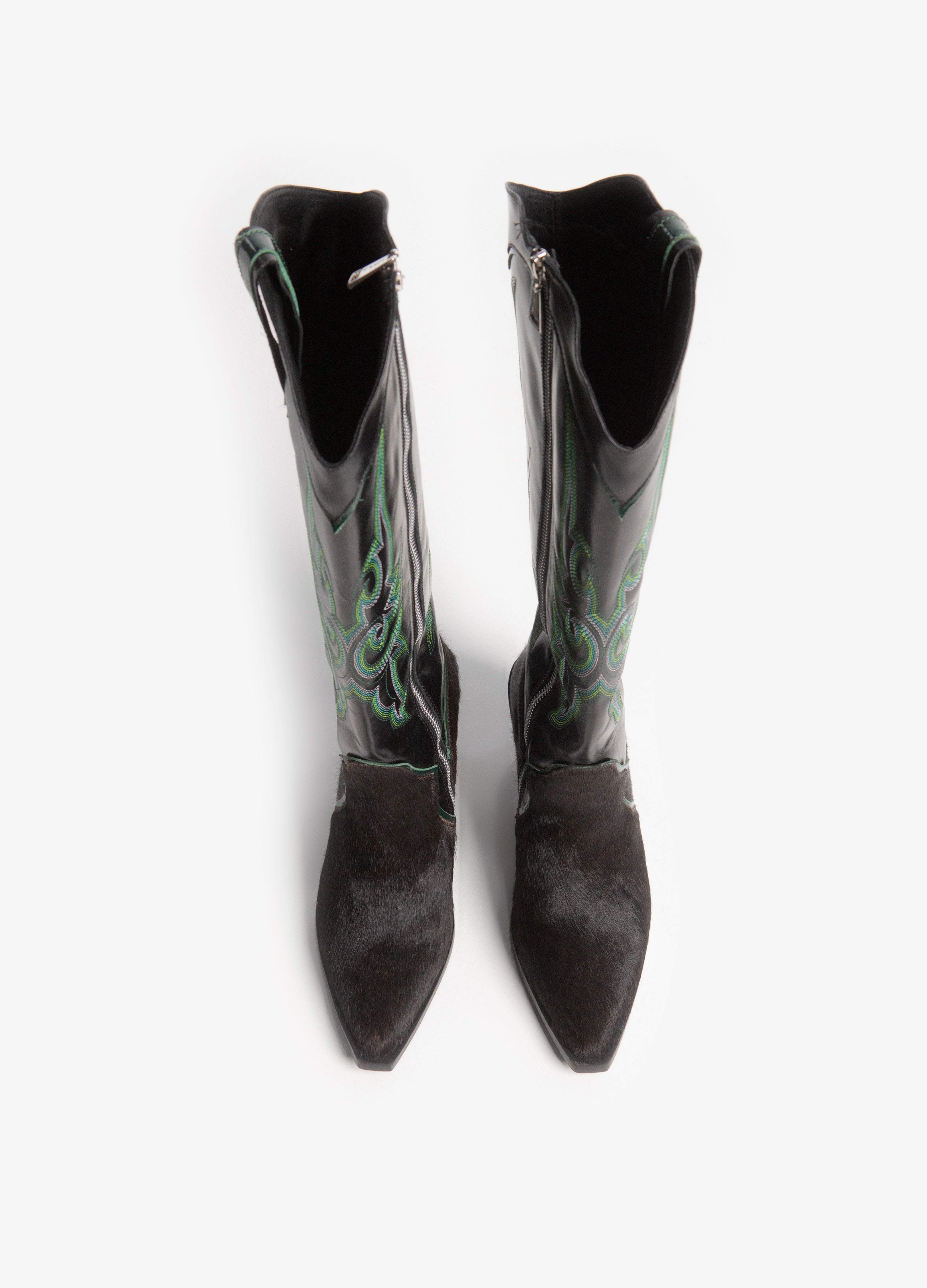 Bota vaquera alta fabricada en piel res color negro con punta en pelaje natural, bordados verdes en el tubo y ribetes verdes