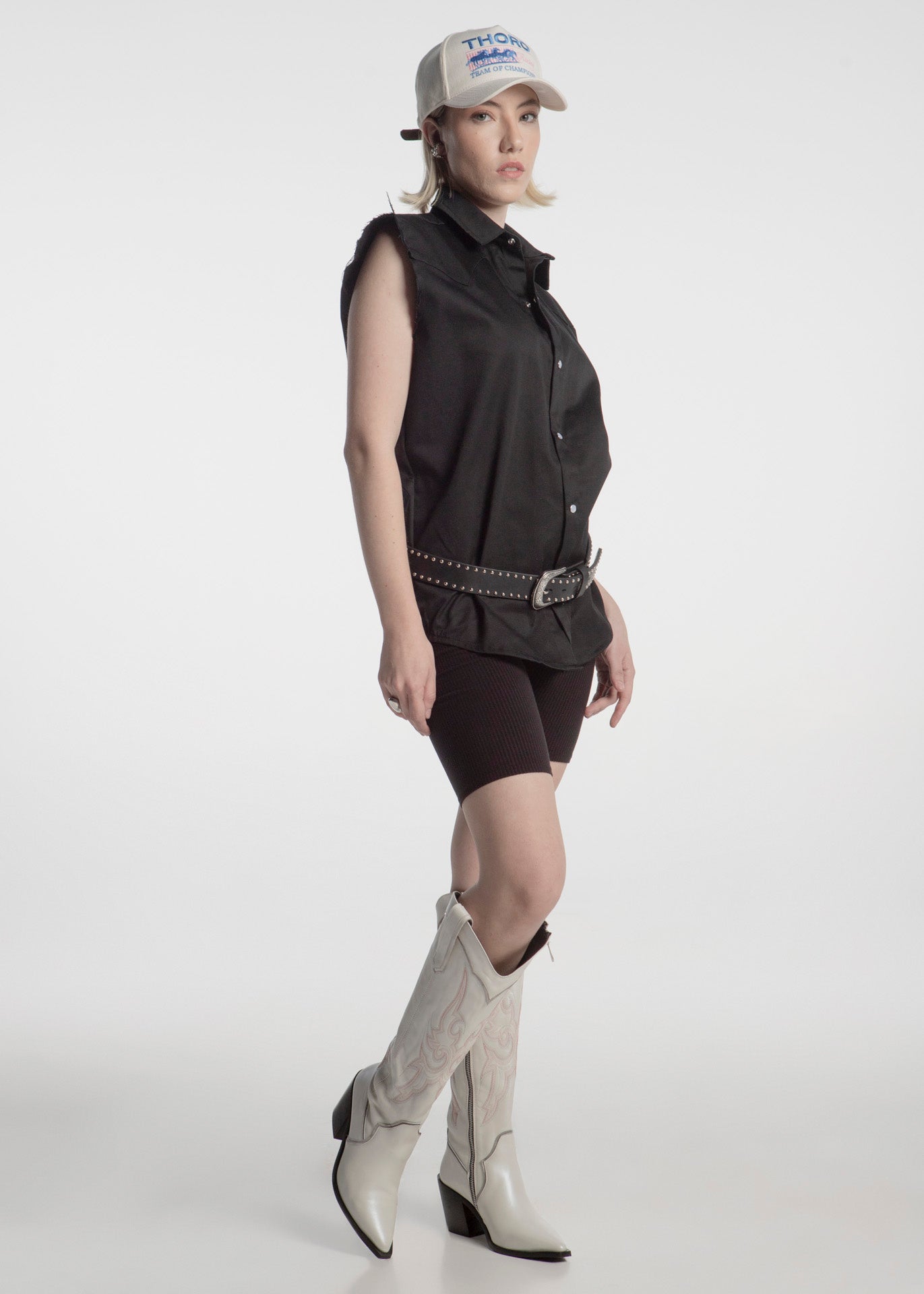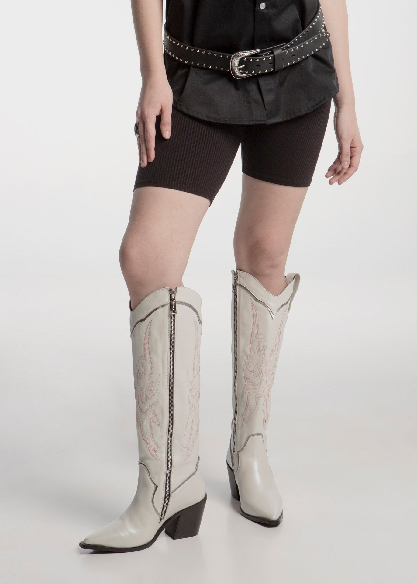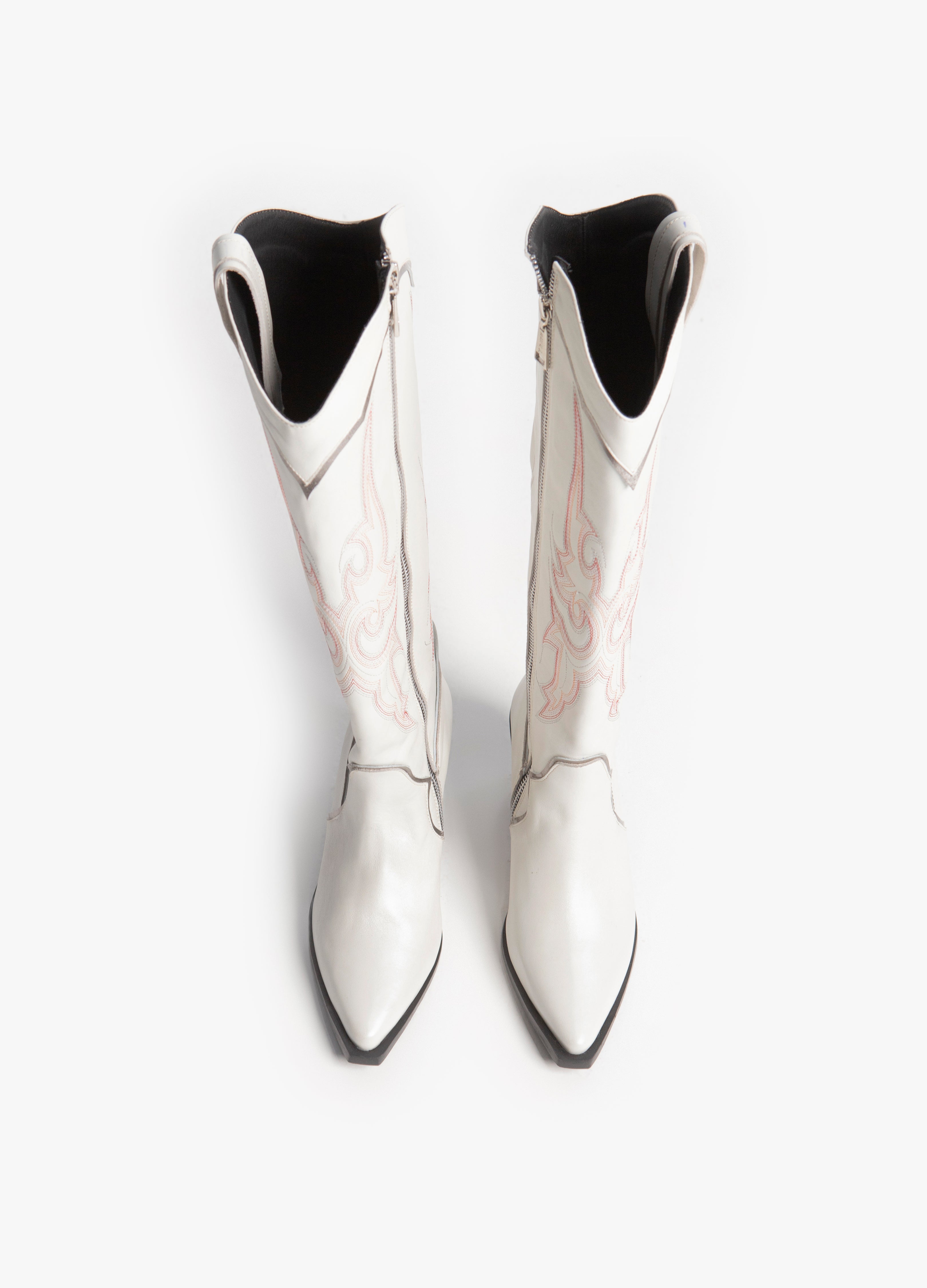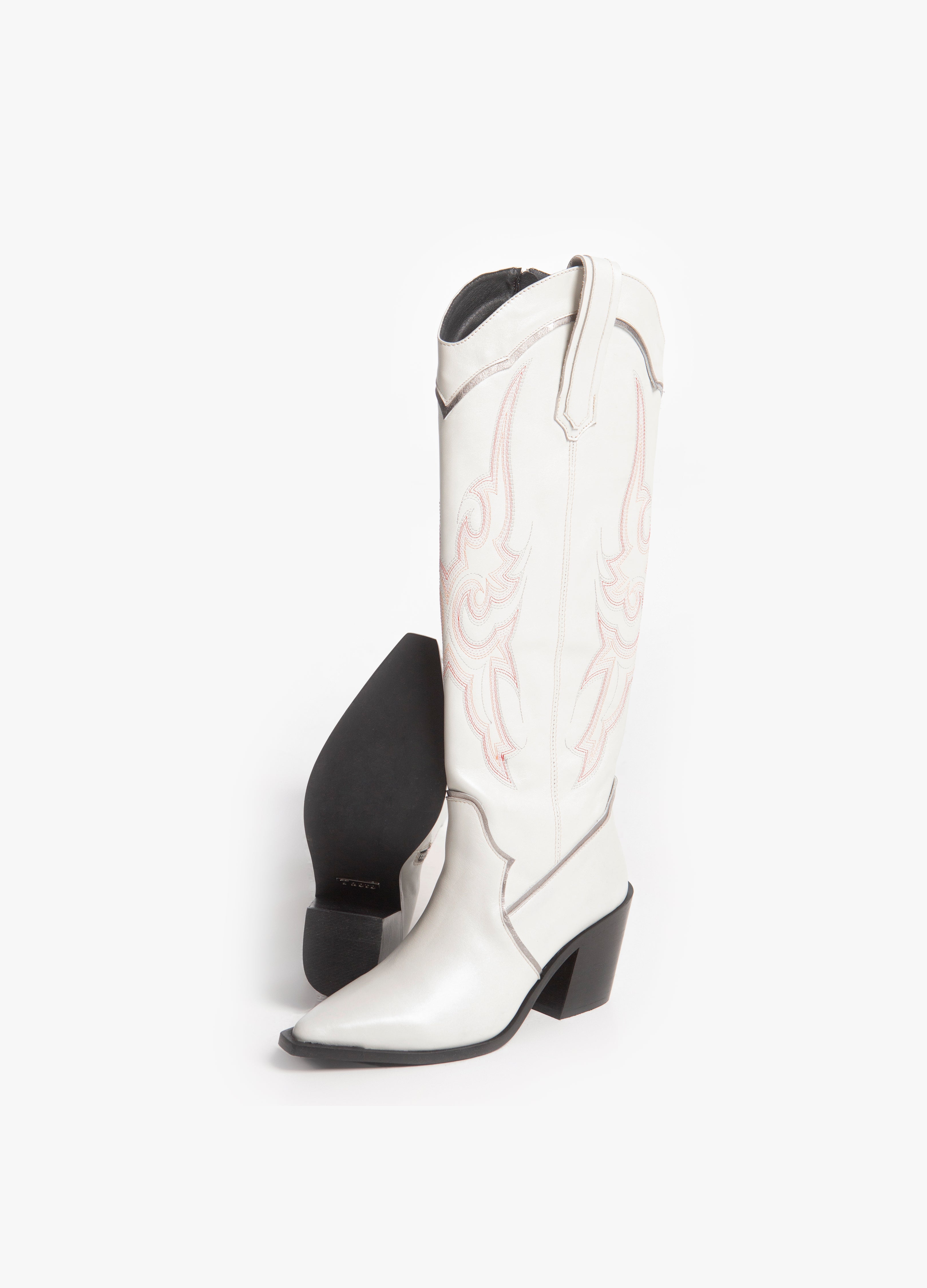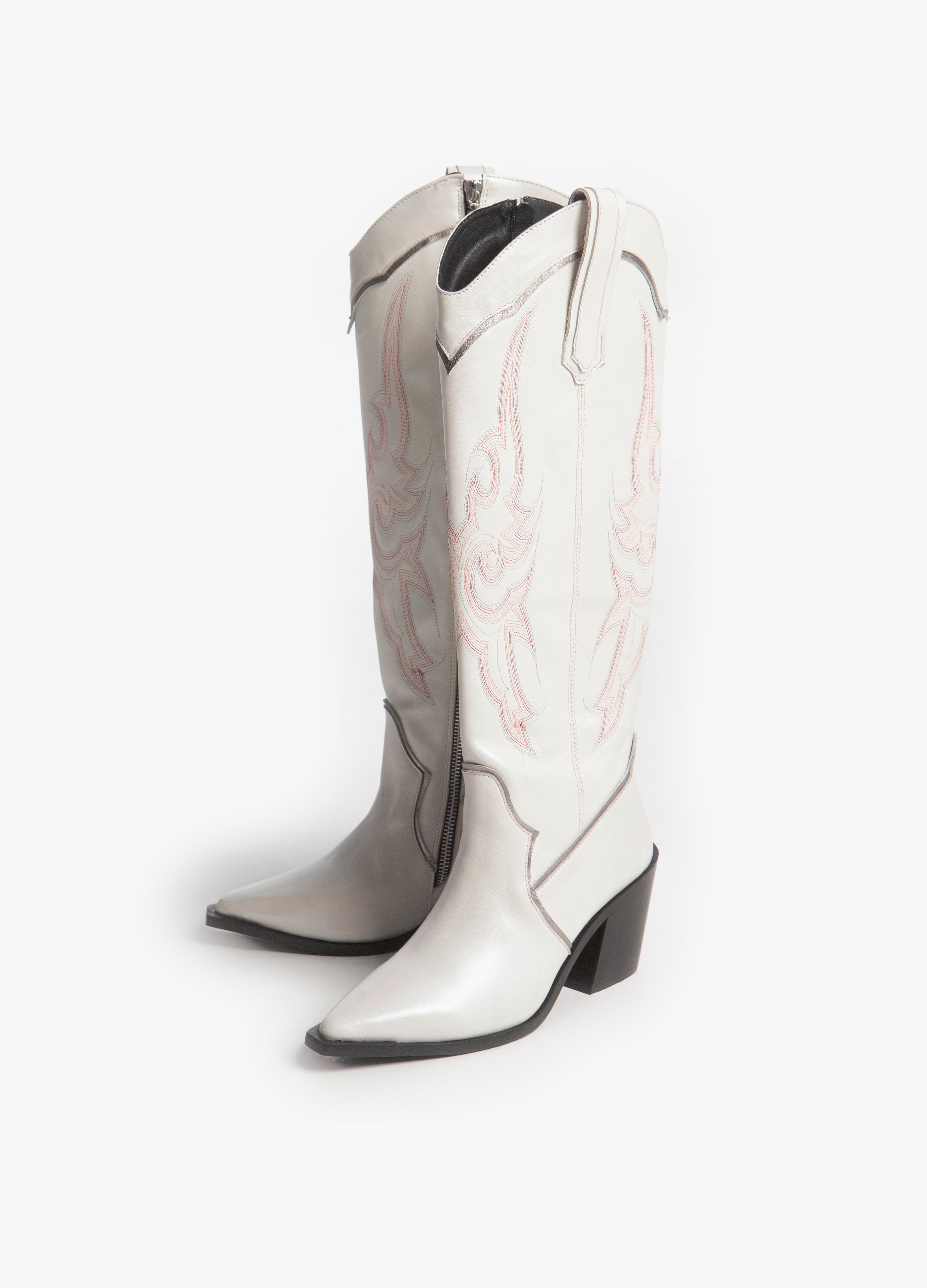 Bota vaquera alta fabricada en piel res color blanco con bordados rosas en el tubo y ribetes plateados
