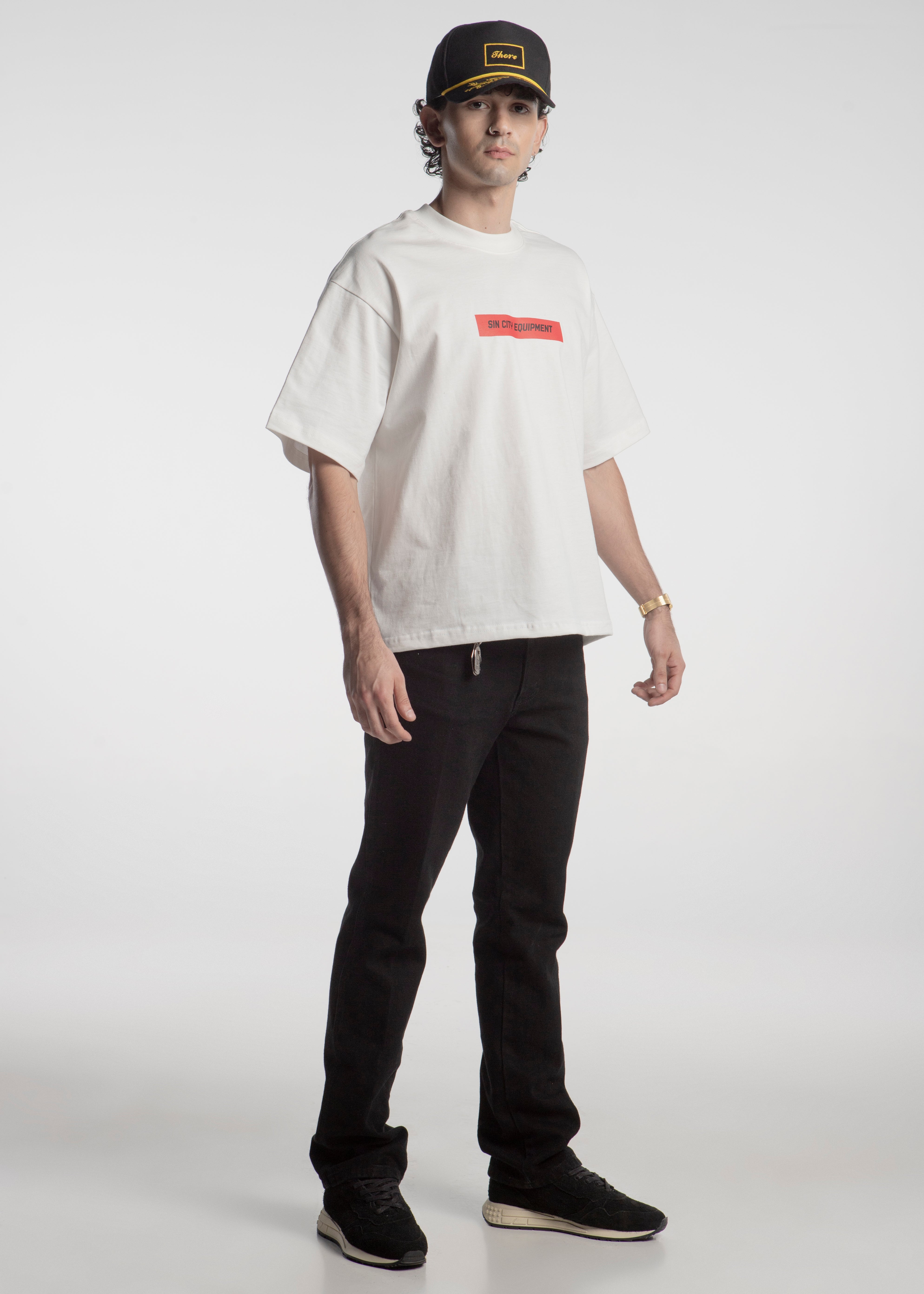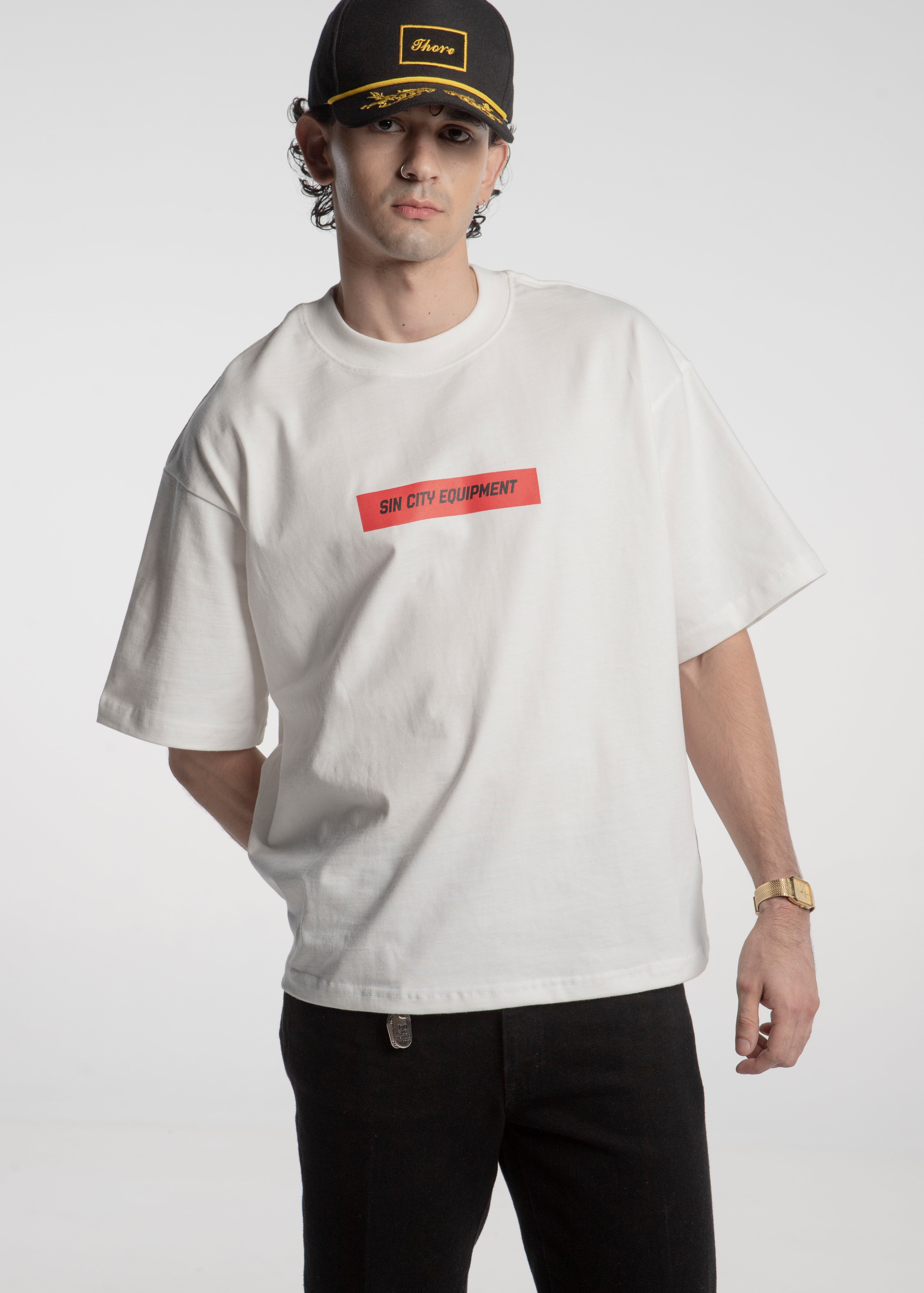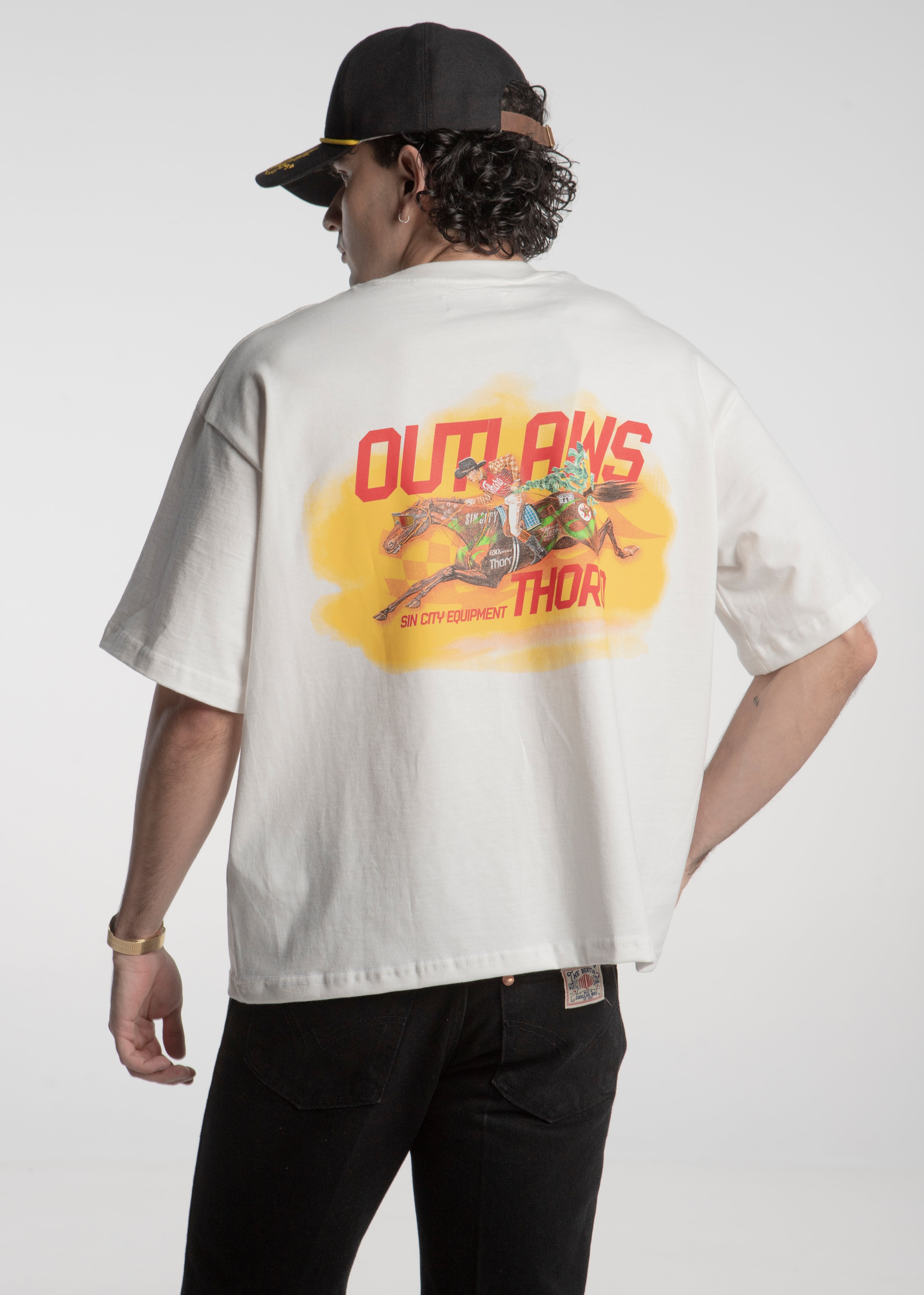 Playera blanca de corte boxy fabricada en 100% algodón con el la leyenda "Sin City Equipment" en letras negras dentro de un recatgulo rojo al frente y en la espalda un jinete sobre un caballo de carreras con el titulo "Outlaws" en otras rojas y las leyendas "Thoro / Sin City Equipment" sobre un fondo con efecto de brocha amarillo impreso en serigrafía.