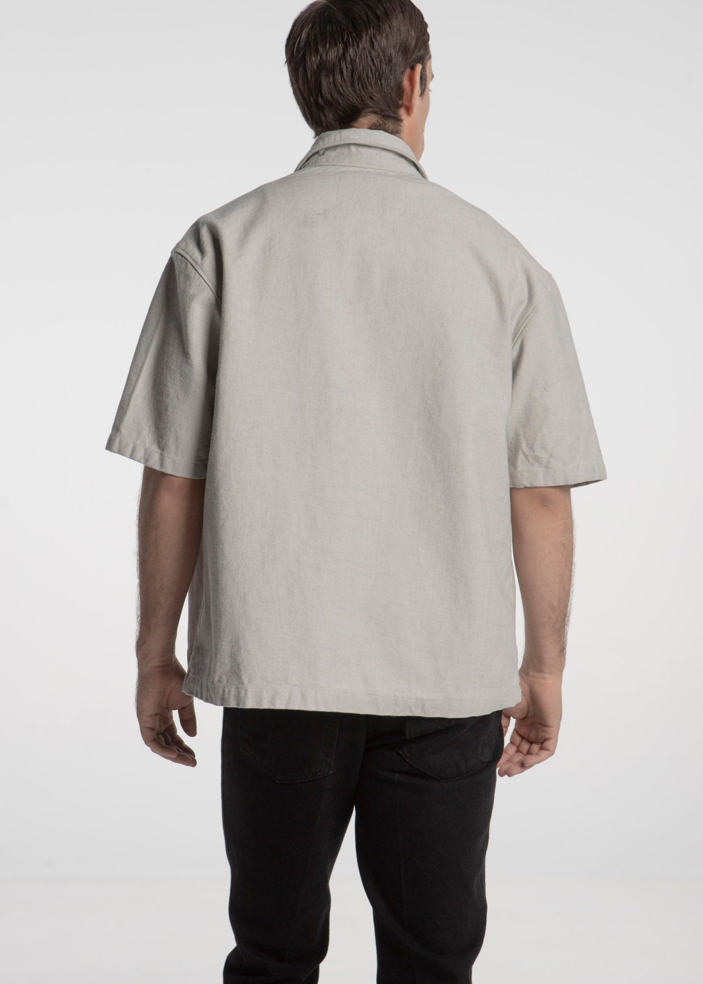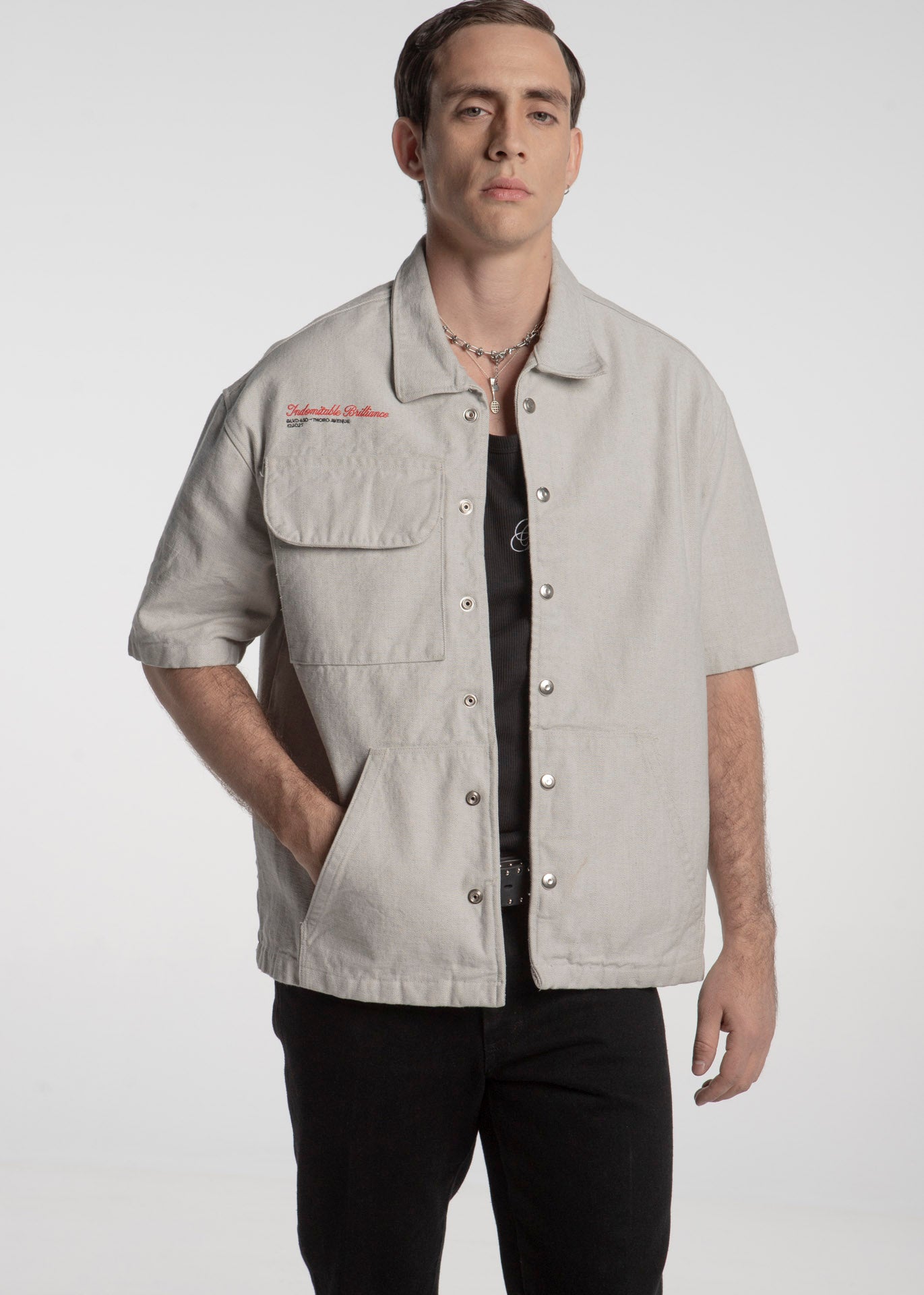 Sobrecamisa confeccionada en tela color gris con bordados en color rojo.