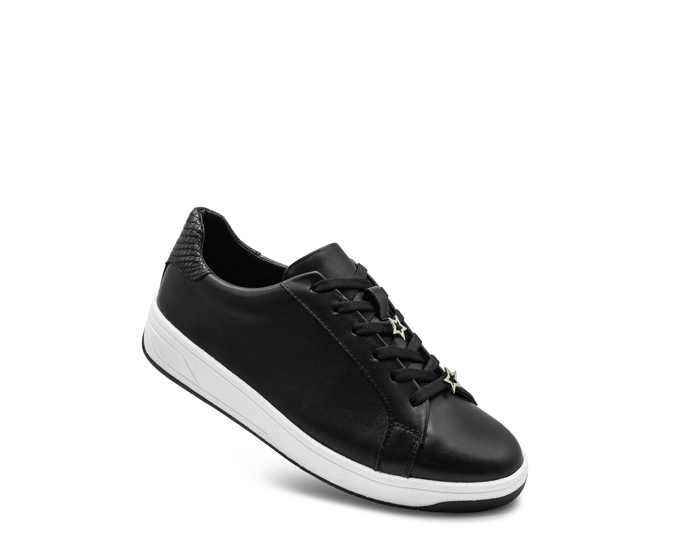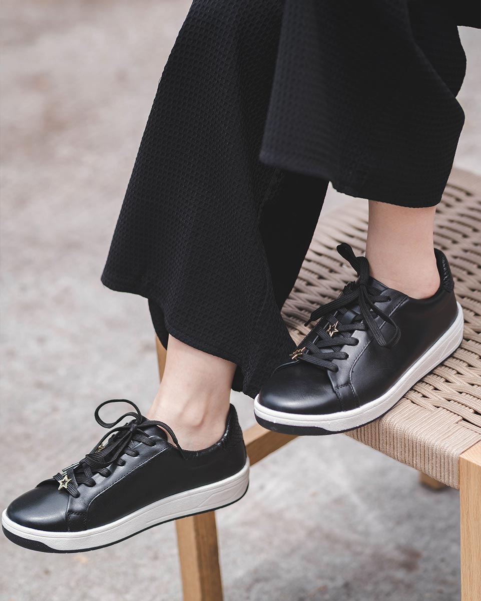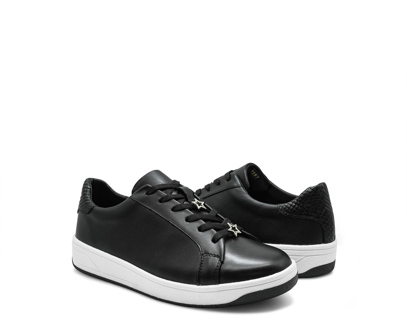 Un tenis Urbano, con acabado en piel atanado y aplicaciones en grabado, ajuste con agujetas de algodón, dijes de estrella removibles, su suela pegada garantiza máxima fijación y durabilidad.