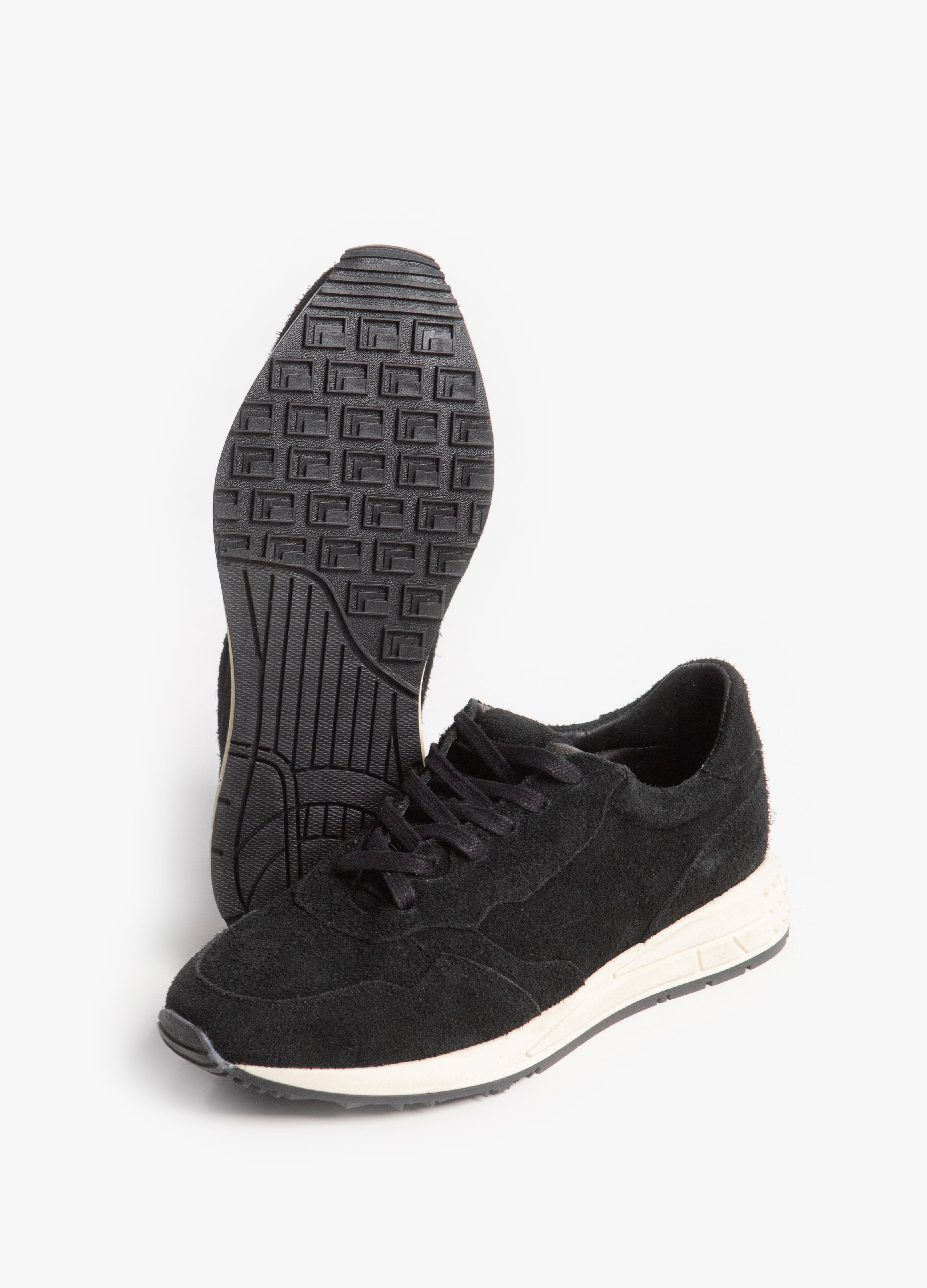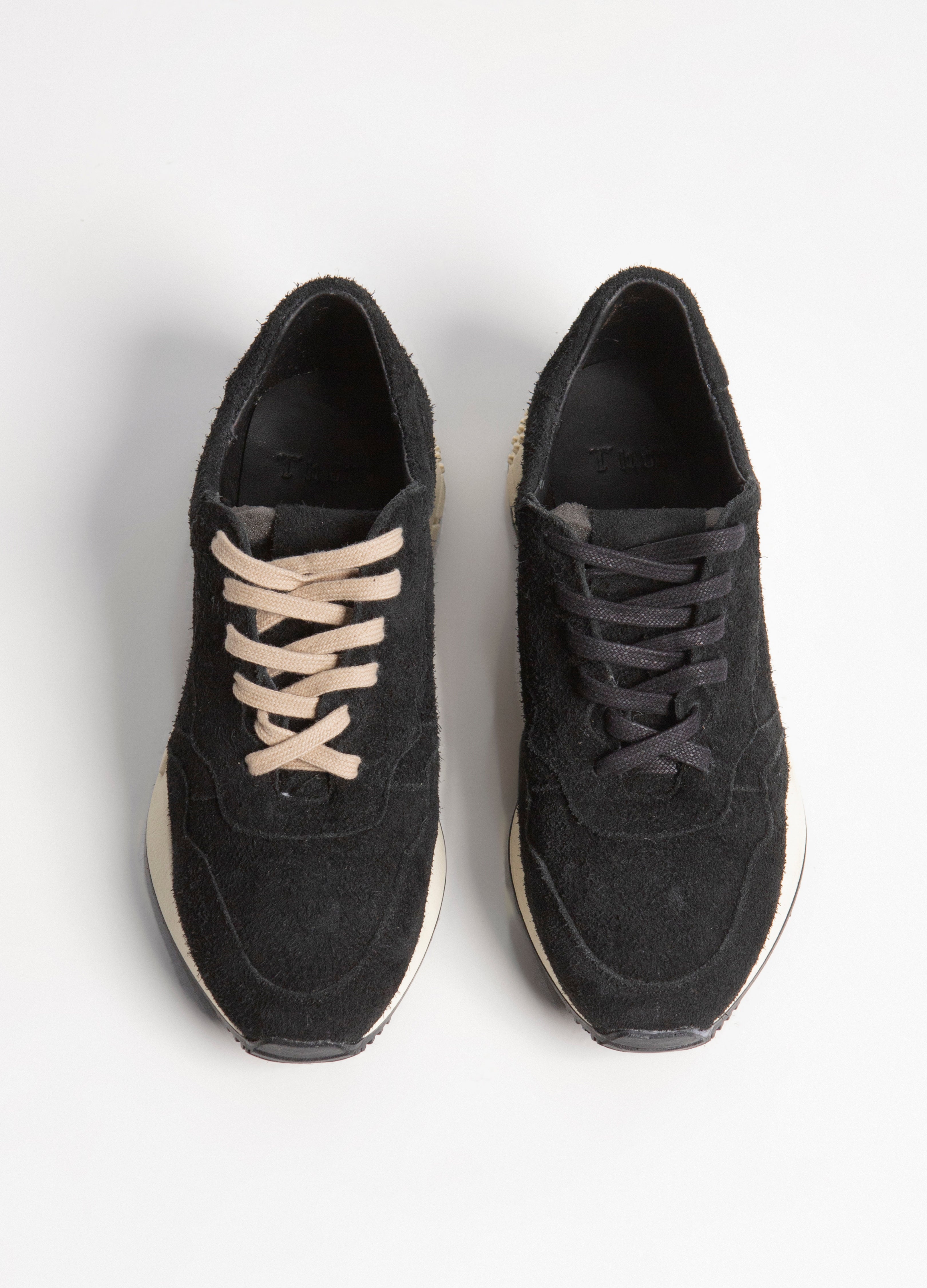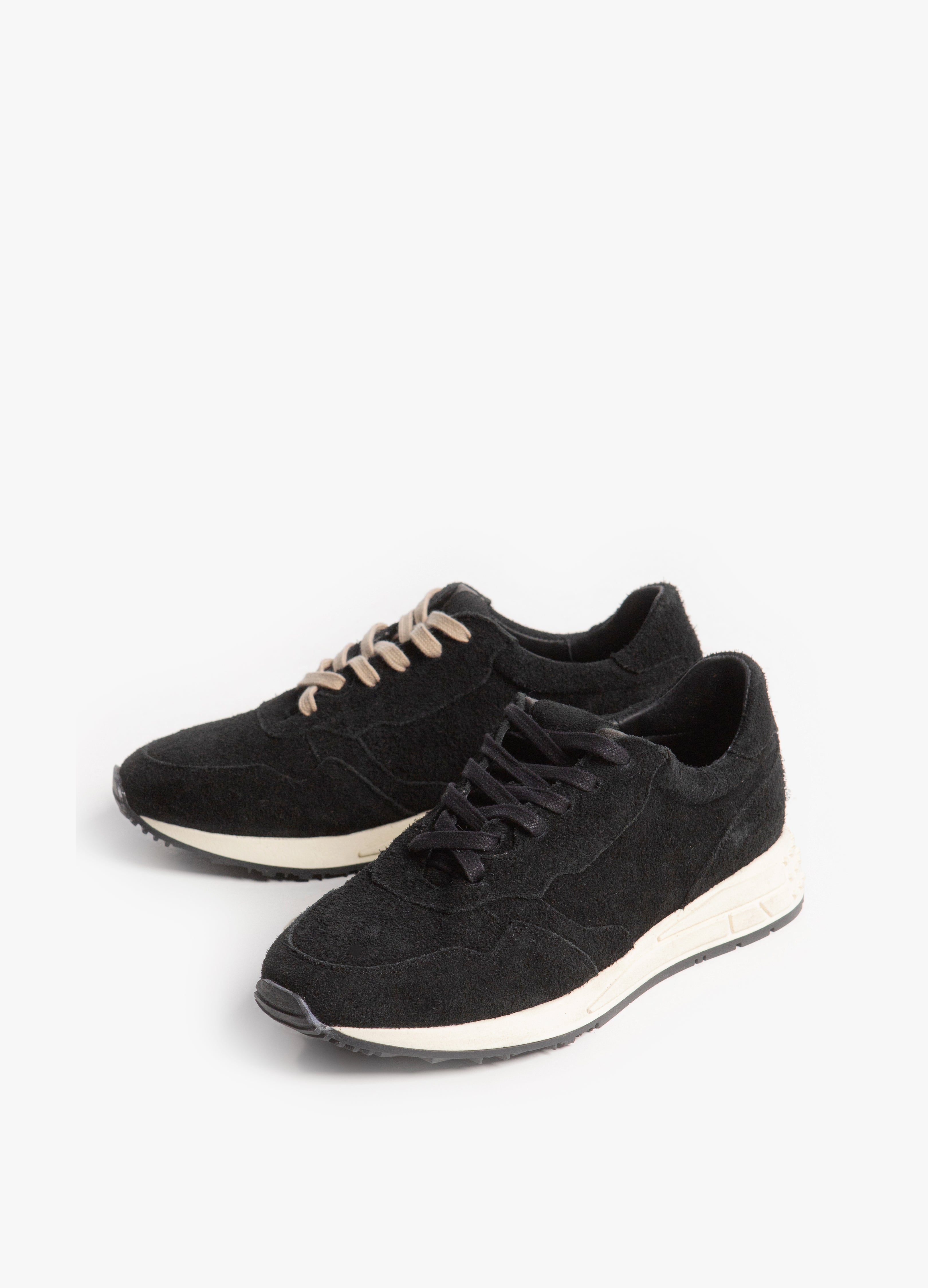 Sneakers estilo runners fabricados en piel de res acabado gamuza con suela blanca y dos pares de agujetas (beige y negras) para intercambiar.