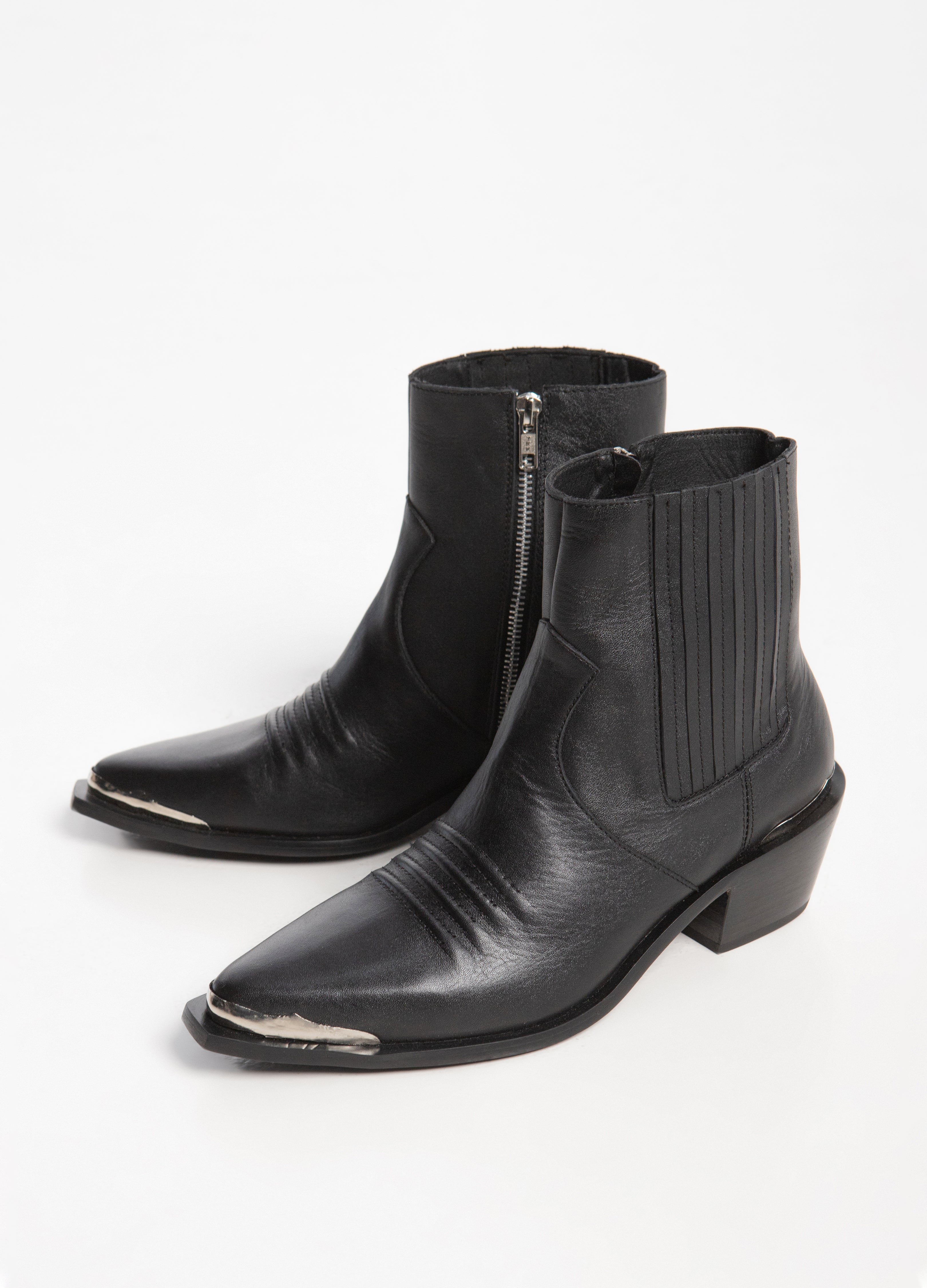 Bota (botín) tipo Chelsea, fabricada en piel de res color negro con tacón cubano, relieve bordados en el empeine, elástico tablillado, cierre metálico lateral y acabados metálicos en talón y punta.