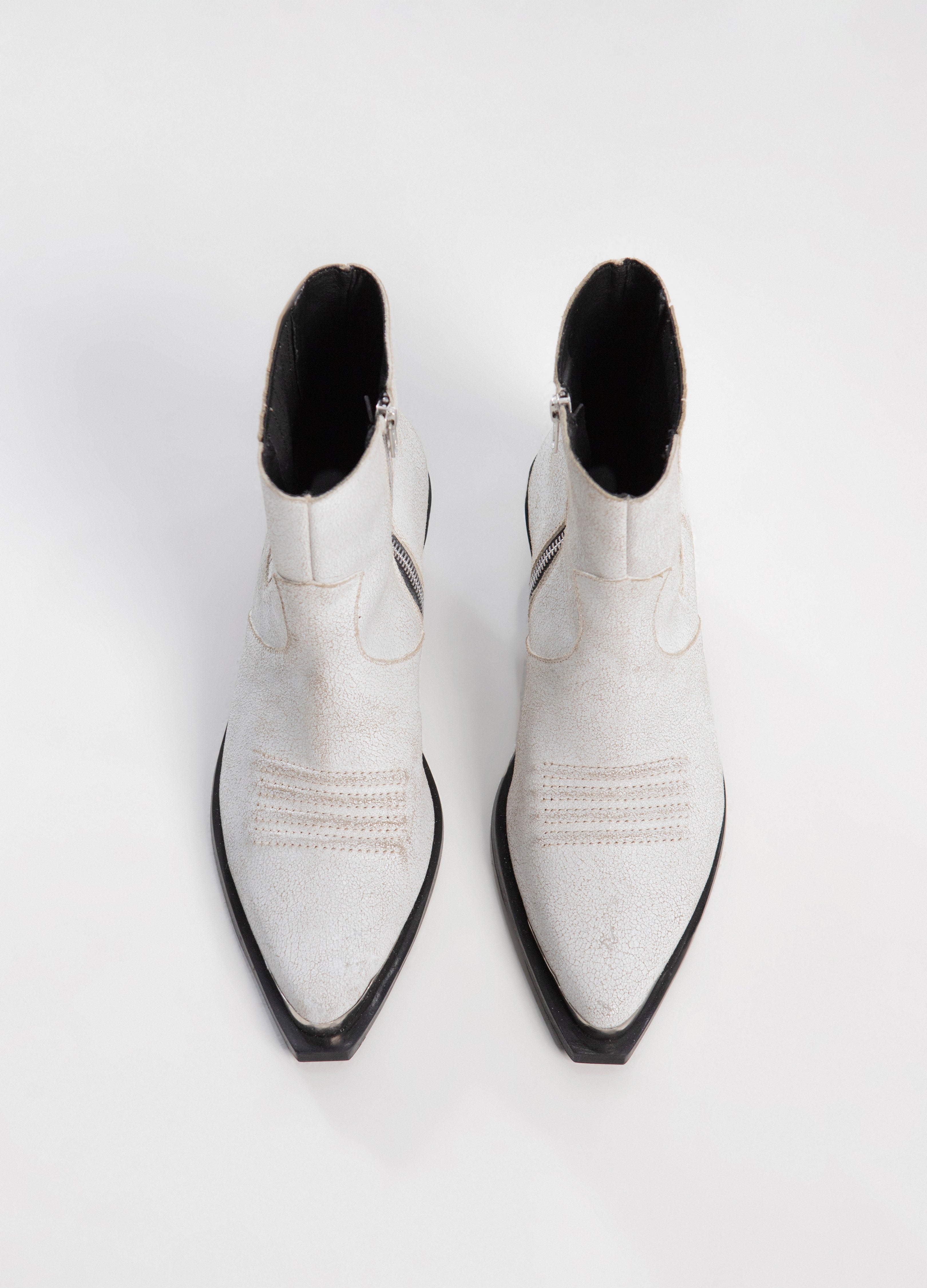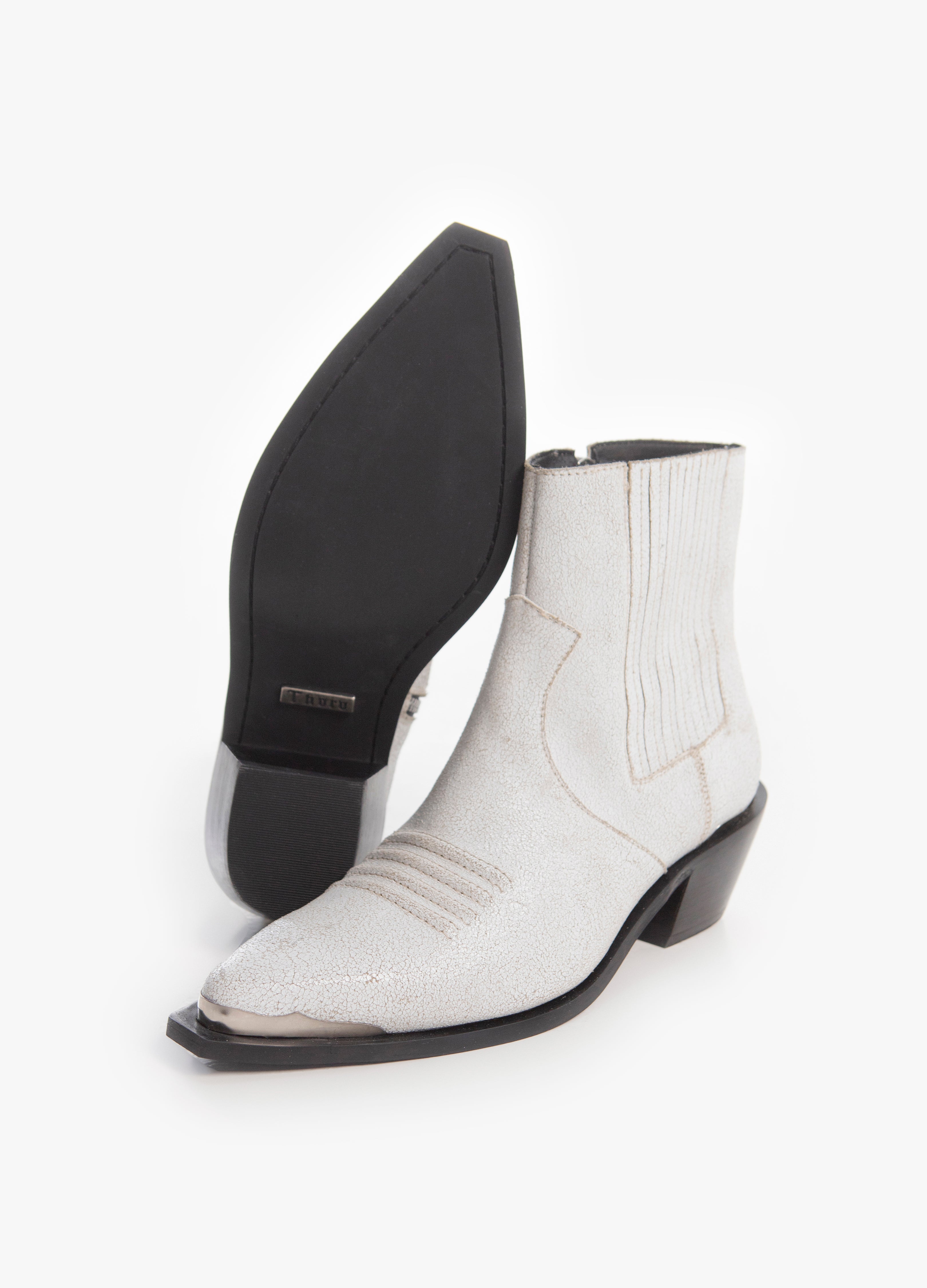 Bota (botín) tipo Chelsea, fabricada en piel de res blanca en acabado de gamuza craquelada, con efecto desgastado. Botín de tacón cubano, relieves bordados en el empeine, elástico tablillado, cierre metálico lateral y acabados metálicos en talón y punta.