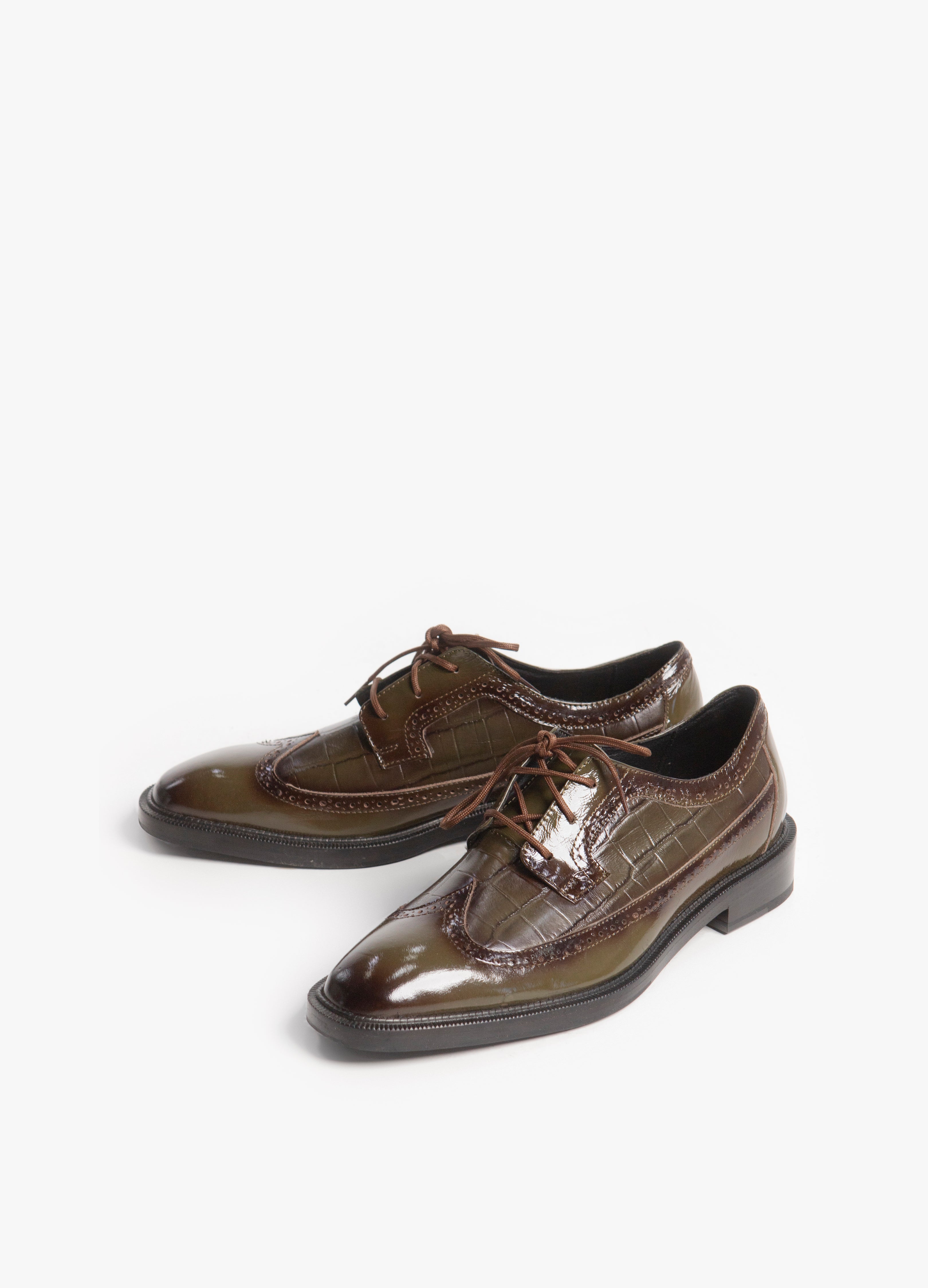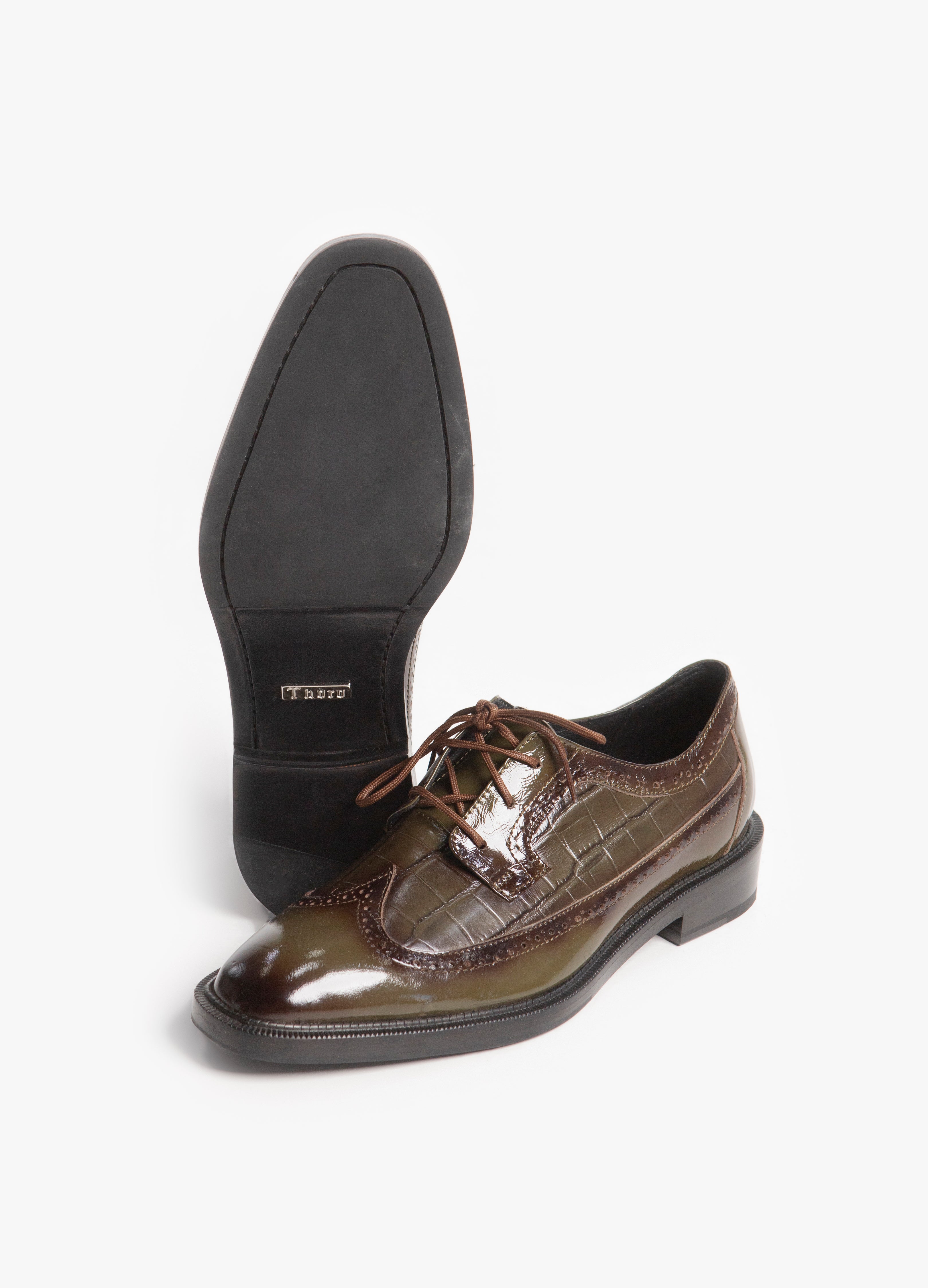 Zapato de agujetas tipo brogue fabricado en piel de res color verde olivo con acabado de cocodrilo