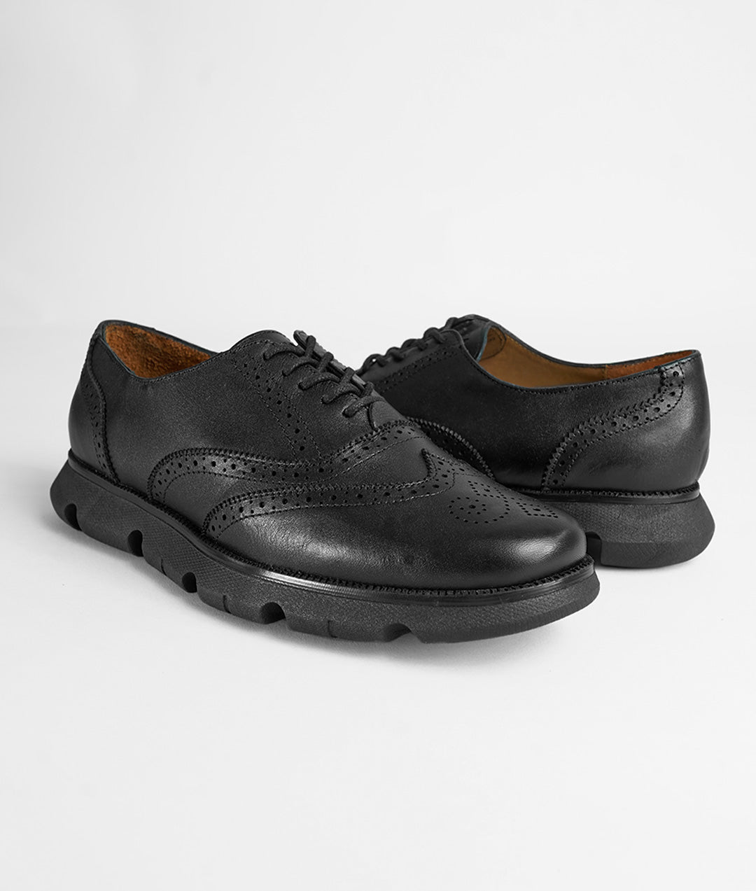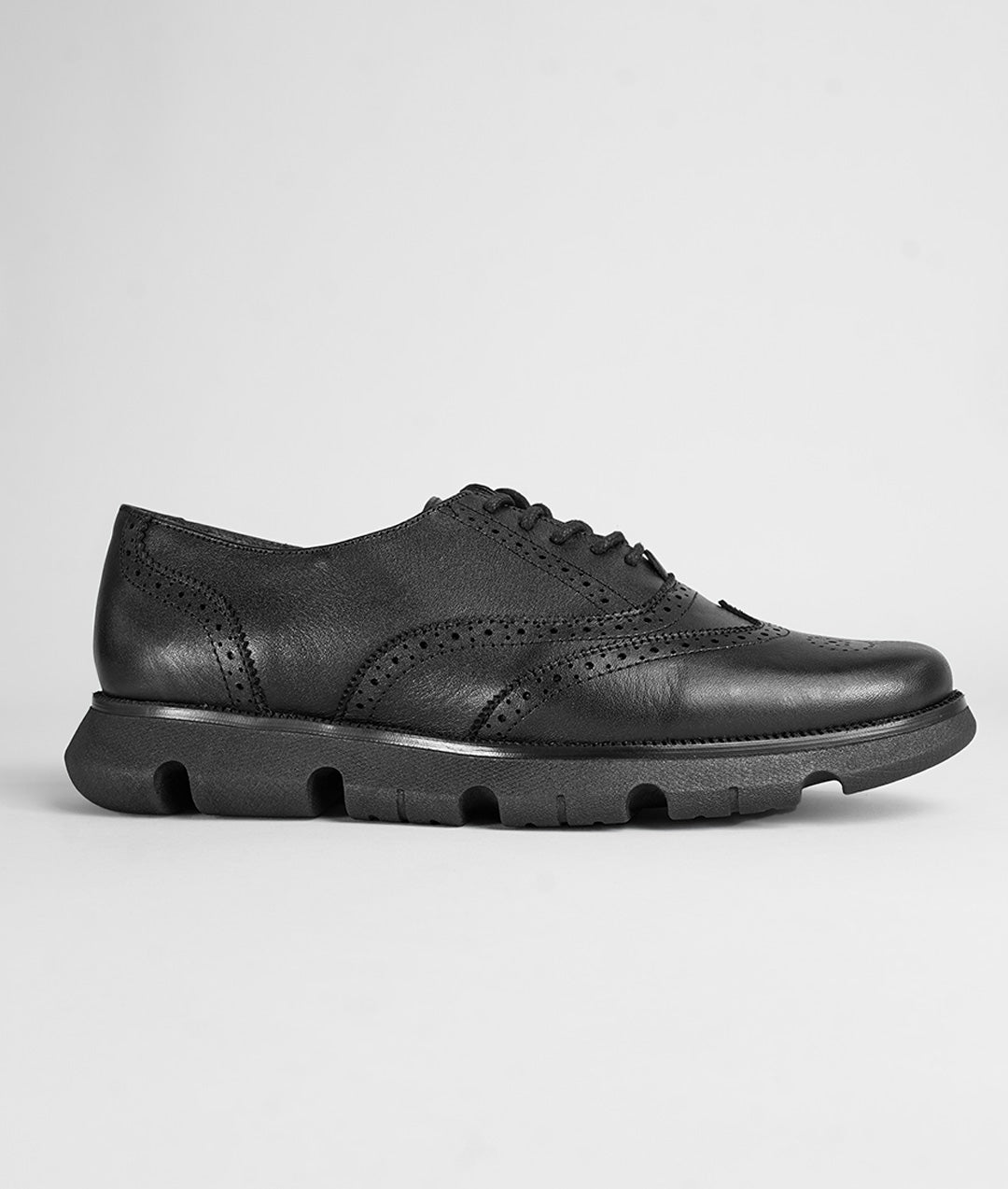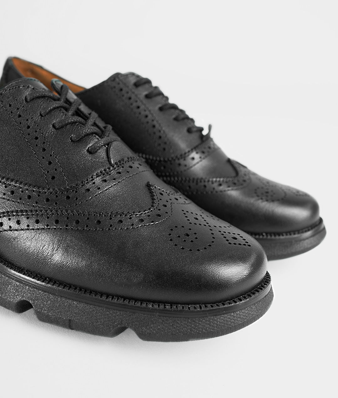 Zapato 100% de piel de Res en color negro en un acabado atanado brillante, estilo Oxford con decoración bostoniana en perforado y suela TR ligero que garantiza máxima fijación y durabilidad, diseño clásico distintivo y modernizado para un uso casual y formal.
