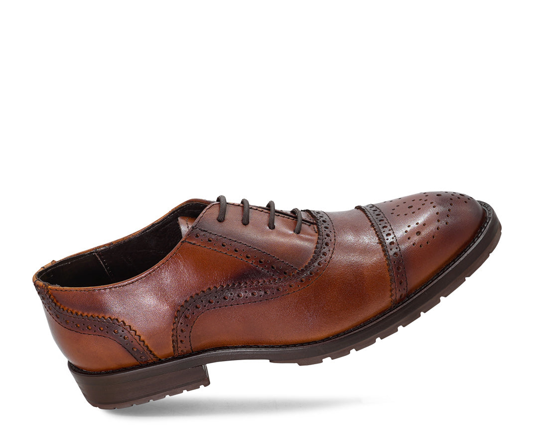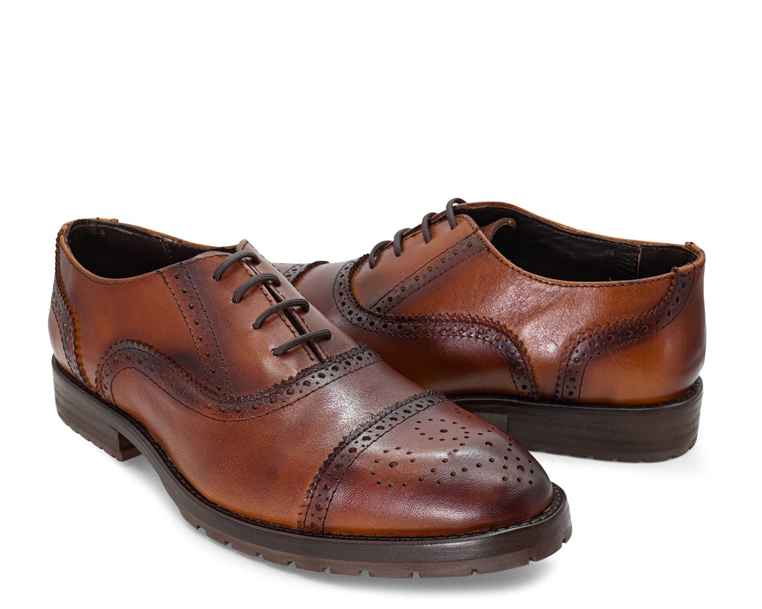 Zapato en diseño Oxford con detalles bostonianos, clasico y elegante, en acabado de piel atanada, con un sombreado a mano, su suela pegada garantiza máxima fijacionn y durabilidad.